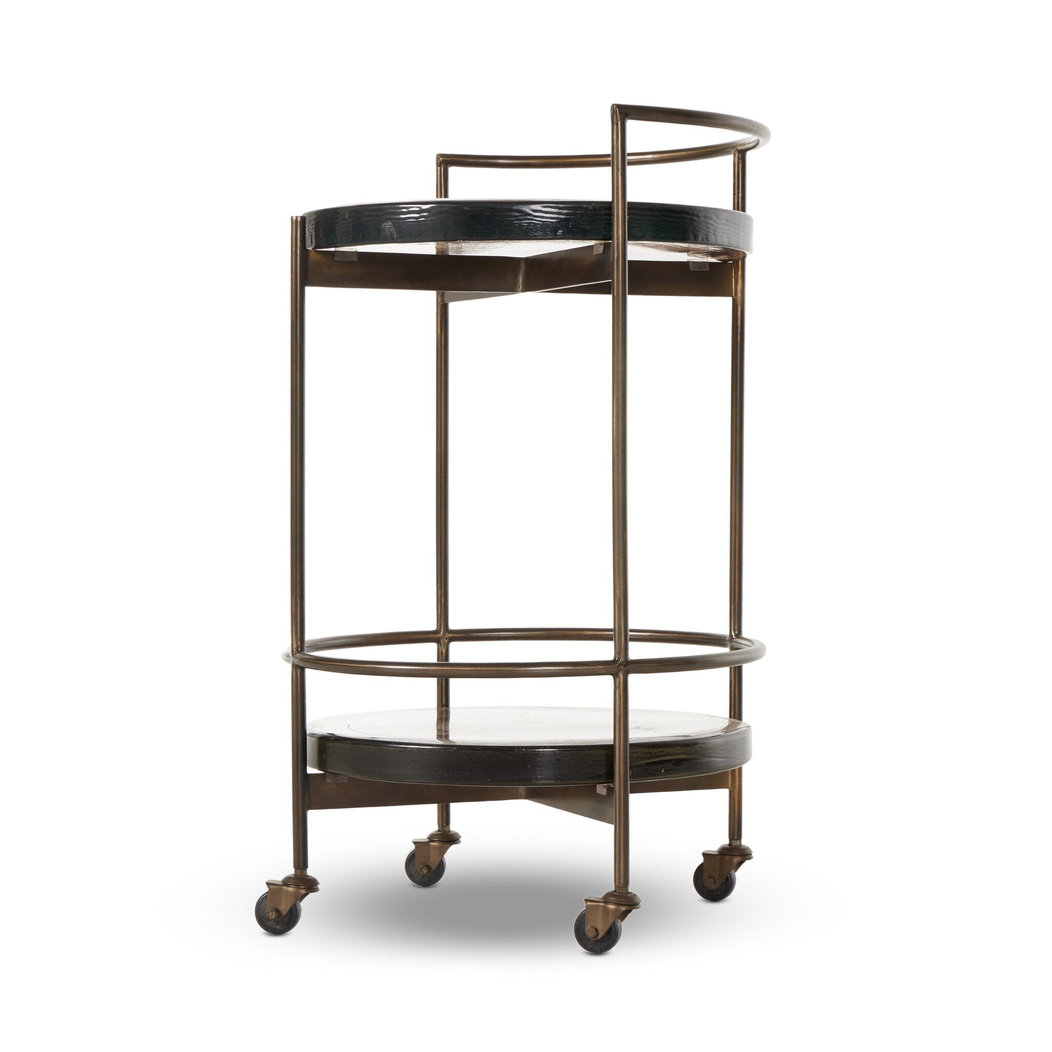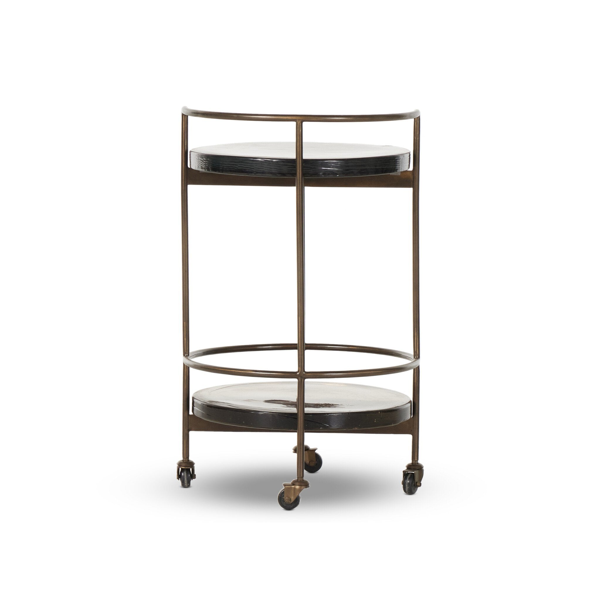 Thick cast glass in a dark brown hue pairs with a structured dark brass frame to form this round bar cart.