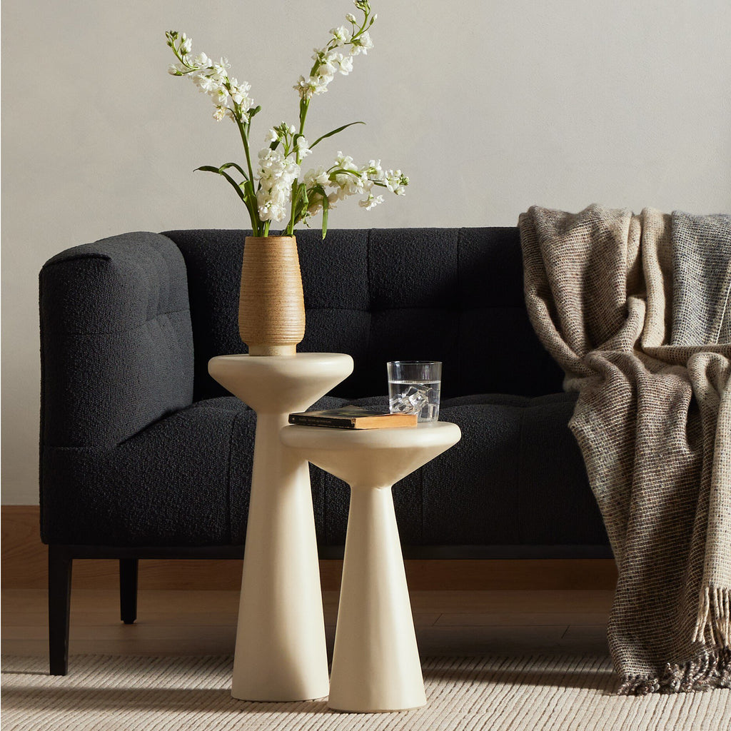 Concrete accent tables stagger in height for a wide variety of options. Makes for an impactful pedestal for display or handy extra surface beside a sofa. Parchment white in color for a clean, industrial-spun vibe. Tall table measures 8.5"D x 20"H. Shorter table measures 10.5"D x 16.5"H.