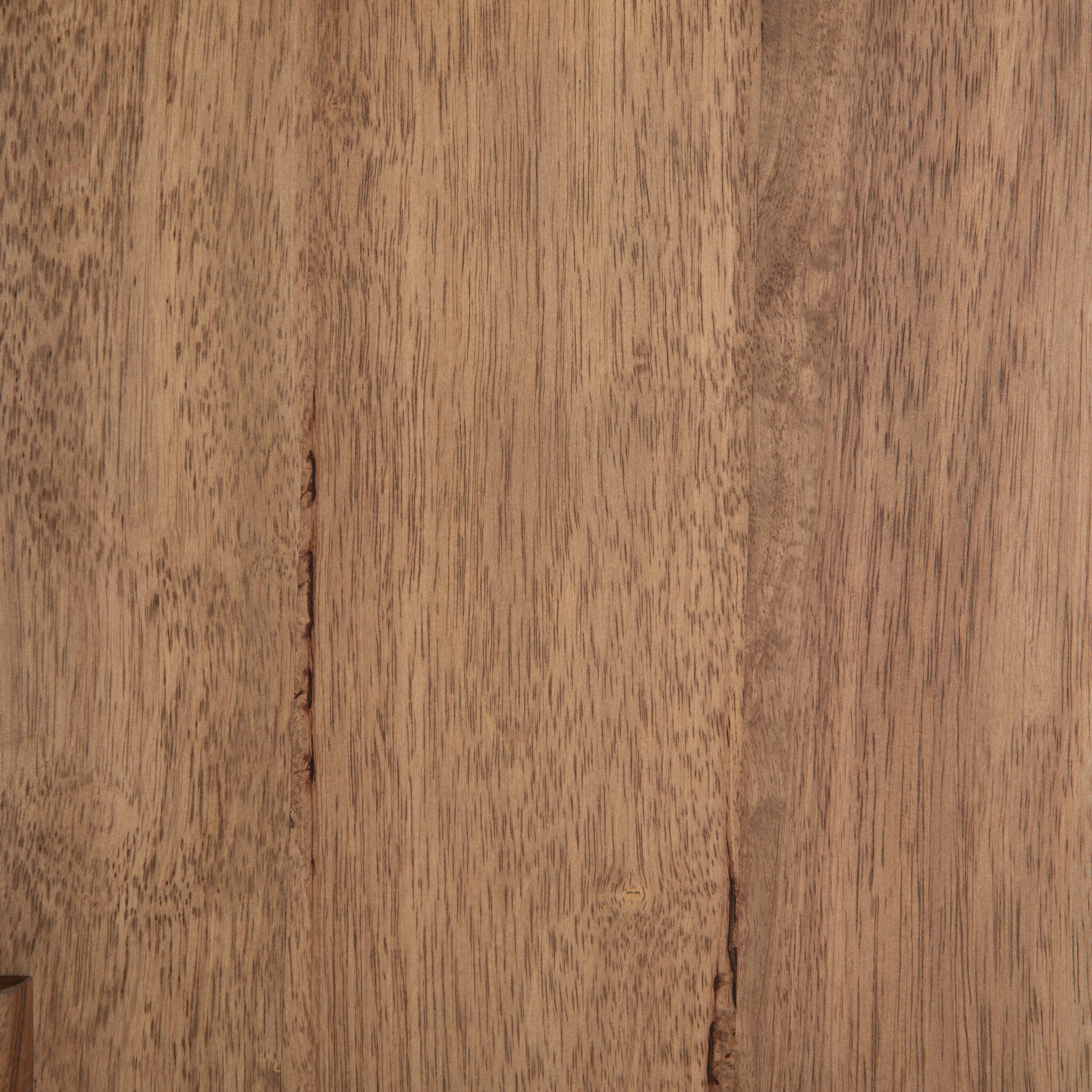A midcentury form with Shaker spirit. Finished in a smoked honey, a clean-lined parawood console sits in an arched cradle base of toasted acacia. Twist-lock metal hardware adds a clever finishing touch. Rear cutouts for media cord management.