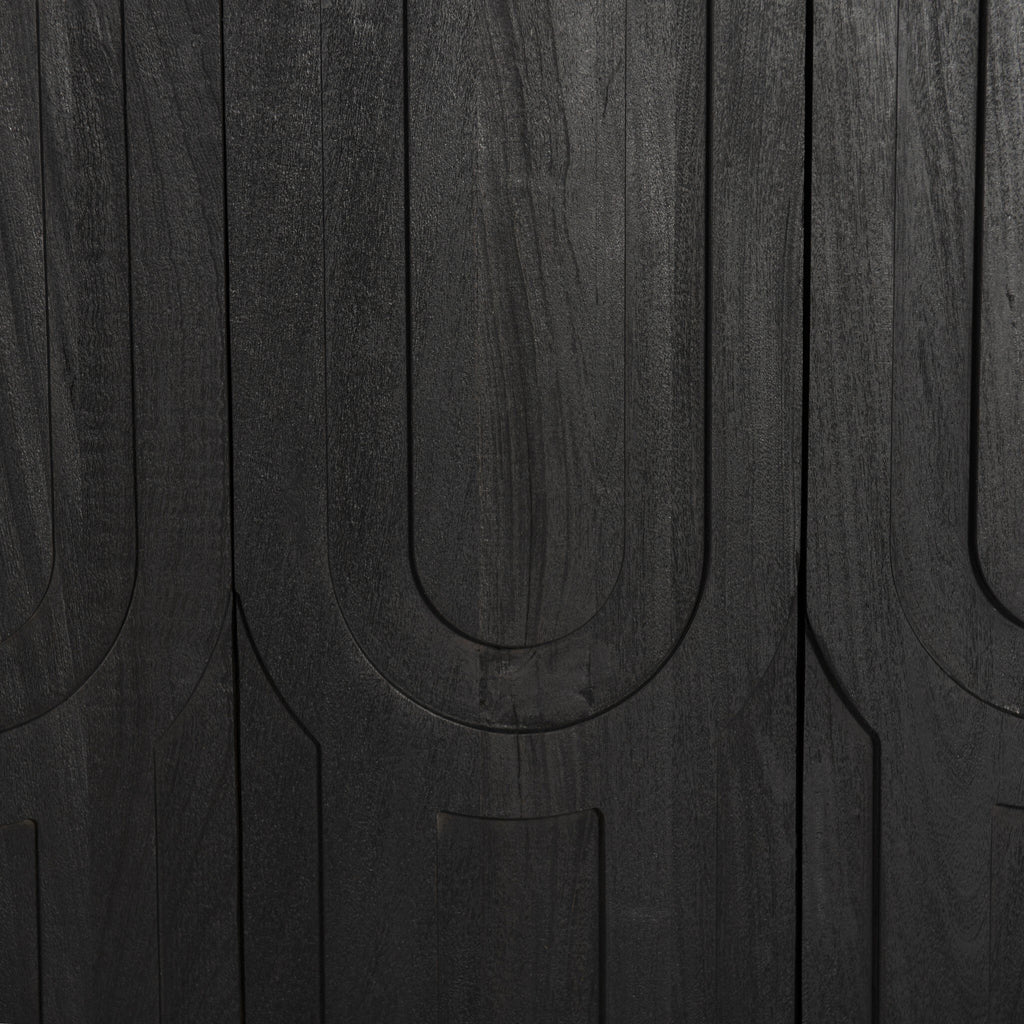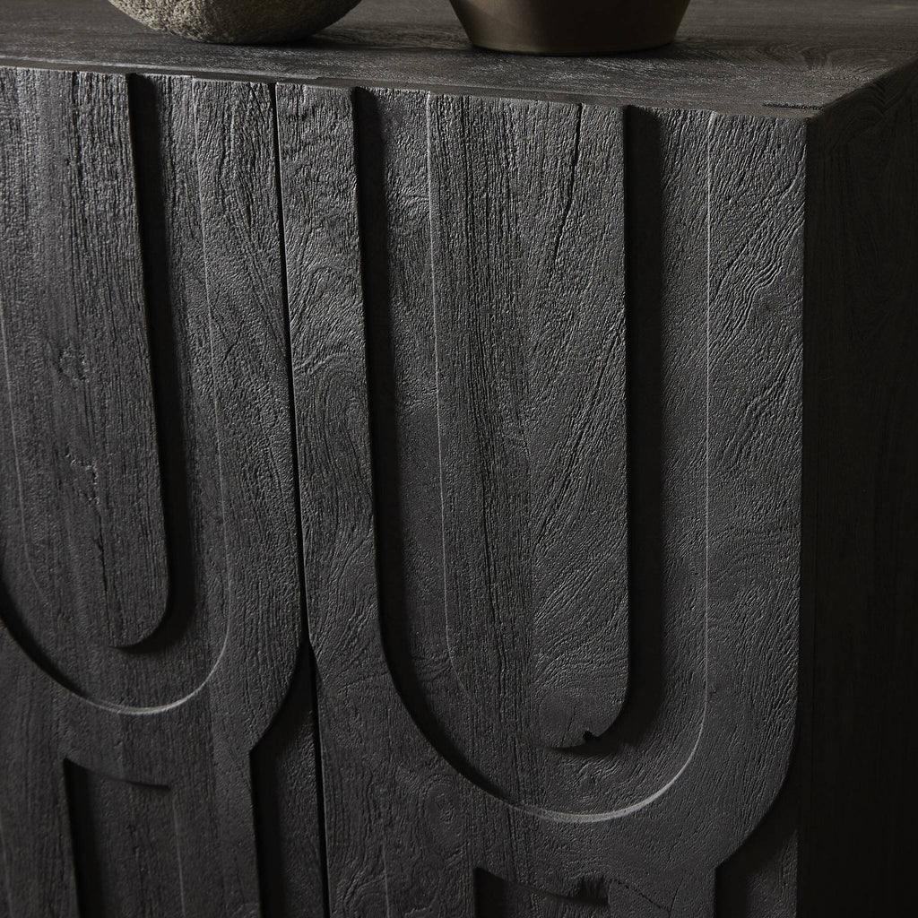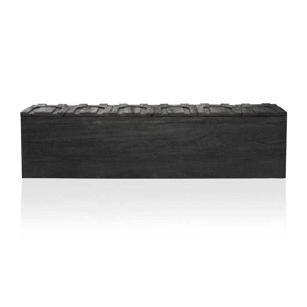 Made from reclaimed woods and finished in a bold black, specialized carving brings a unique, global look to a roomy media console, with plenty of storage space plus rear cutouts for seamless cord management.