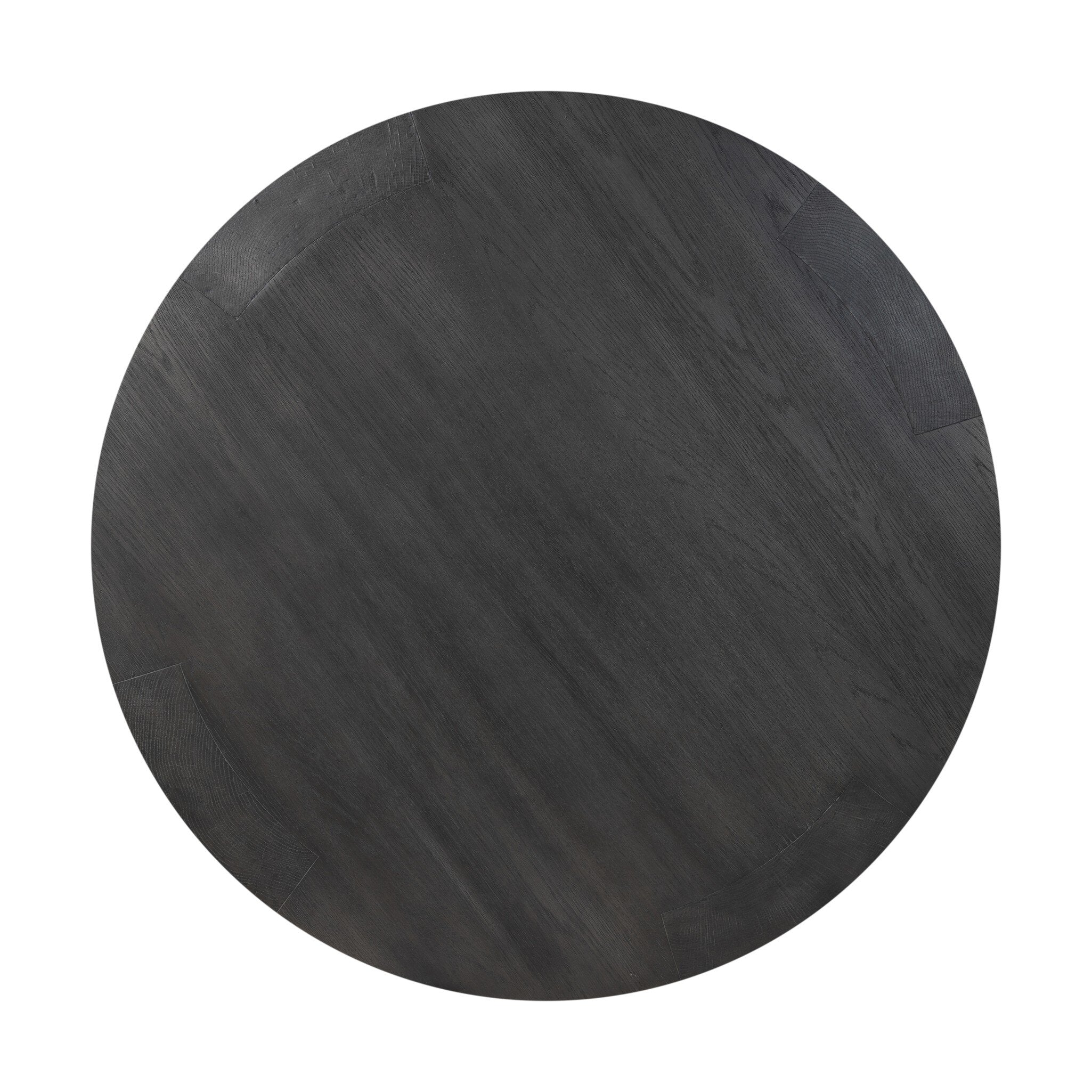 Made from thick, charcoal-finished oak, a rounded coffee table features four legs that pull through to the top, for an intriguing design detail.