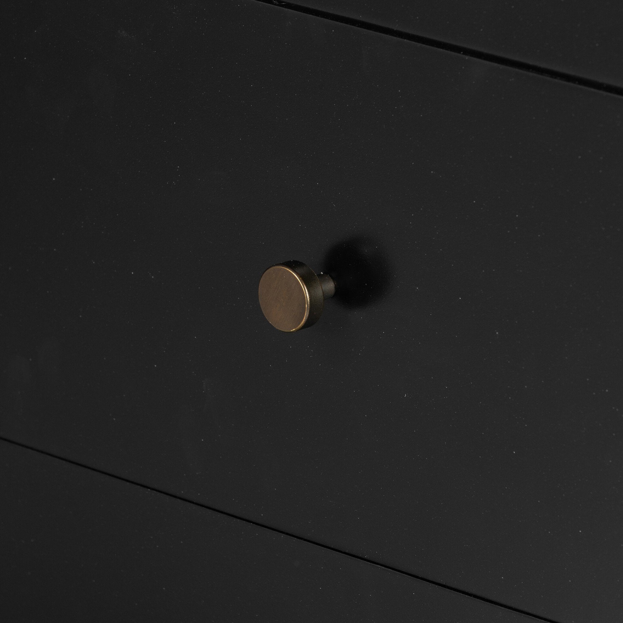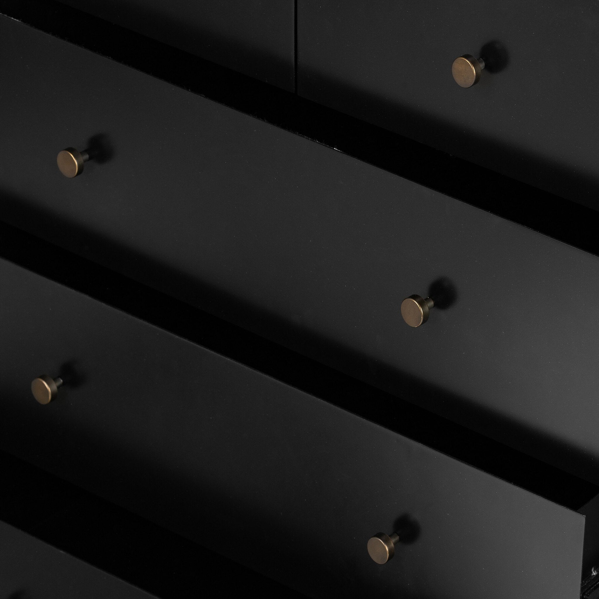 Bring a clean, beautifully industrial look to the bedroom with a roomy five-drawer dresser made from black-finished iron, featuring bronzed iron hardware. This item has been modified to comply with the STURDY Act. See a full list of modified products and data changes in the “STURDY Act†file in the Downloads section below.