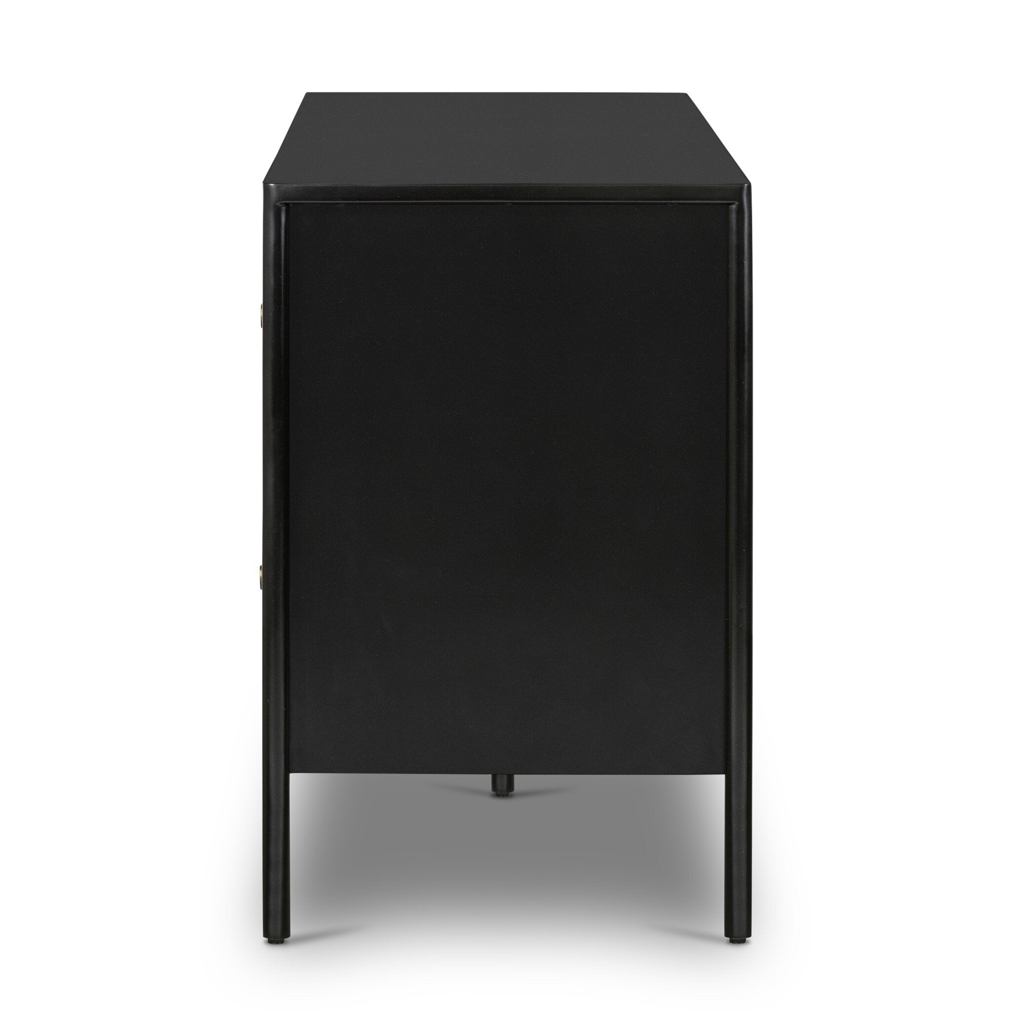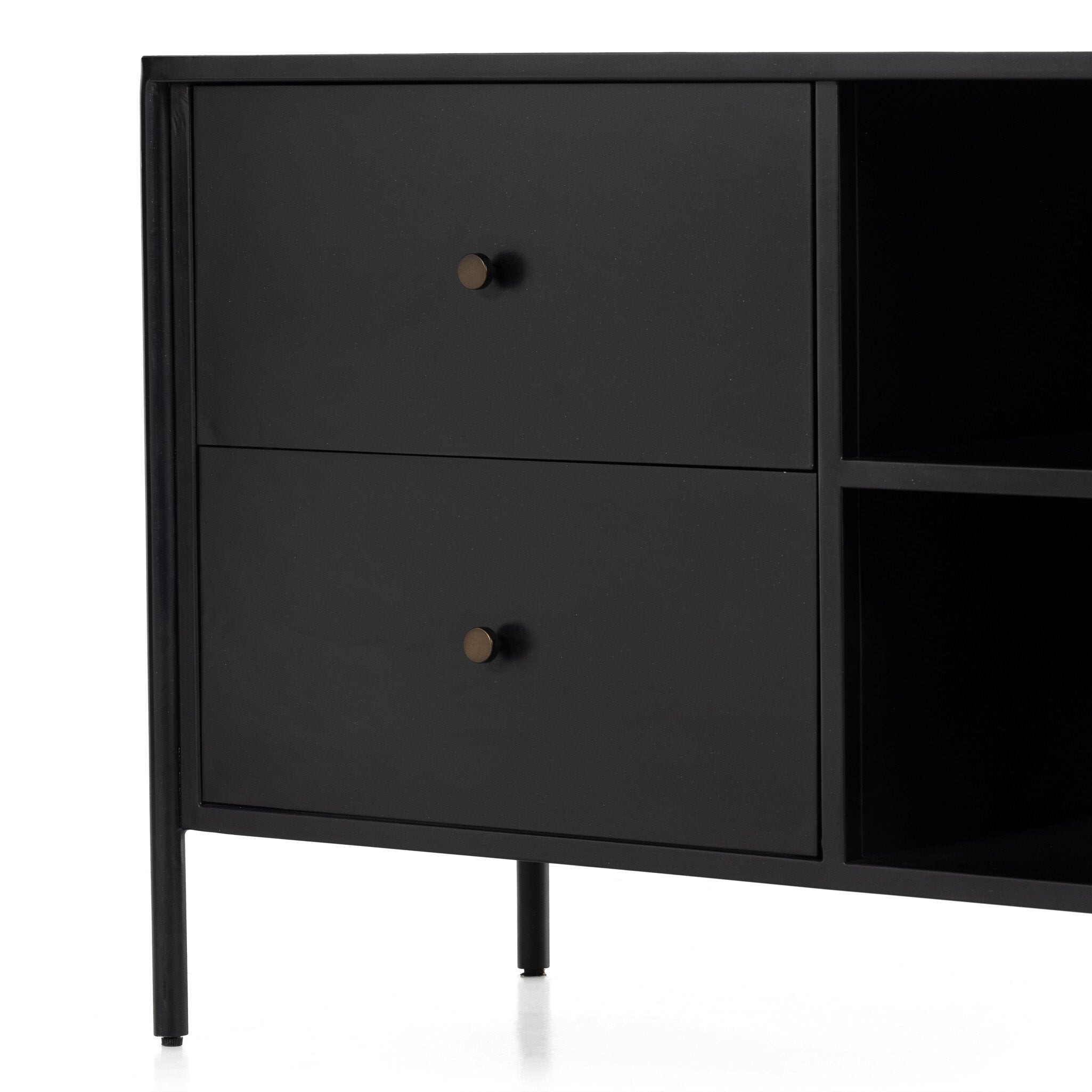 Bring a softened industrial look to the media room with a simple black-finished iron console table featuring bronzed iron hardware for modernity. Four roomy drawers plus open center shelving offer ample storage area for media needs, with a rear cutout for cord management.