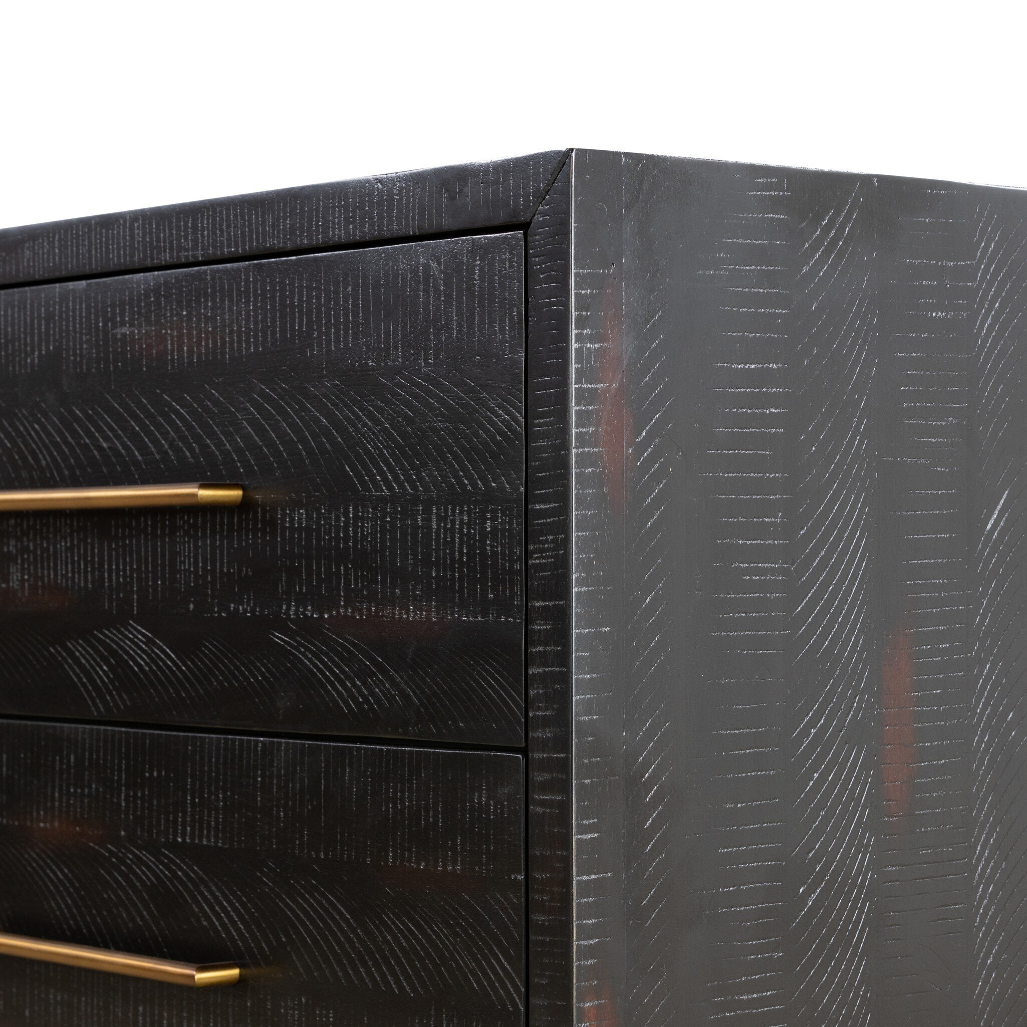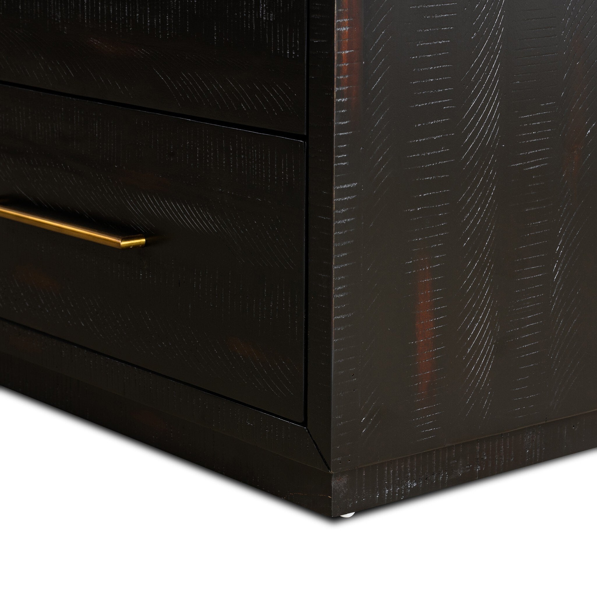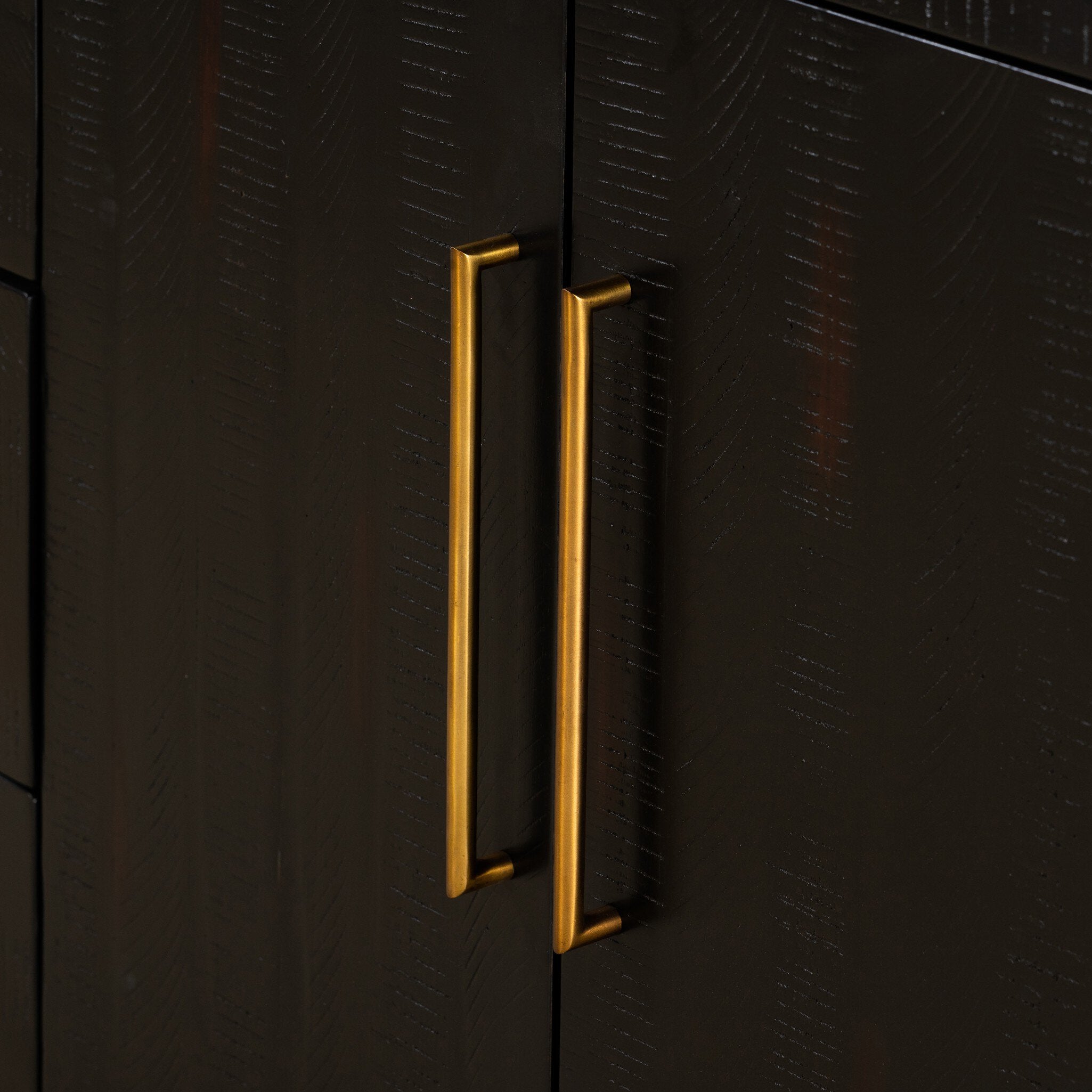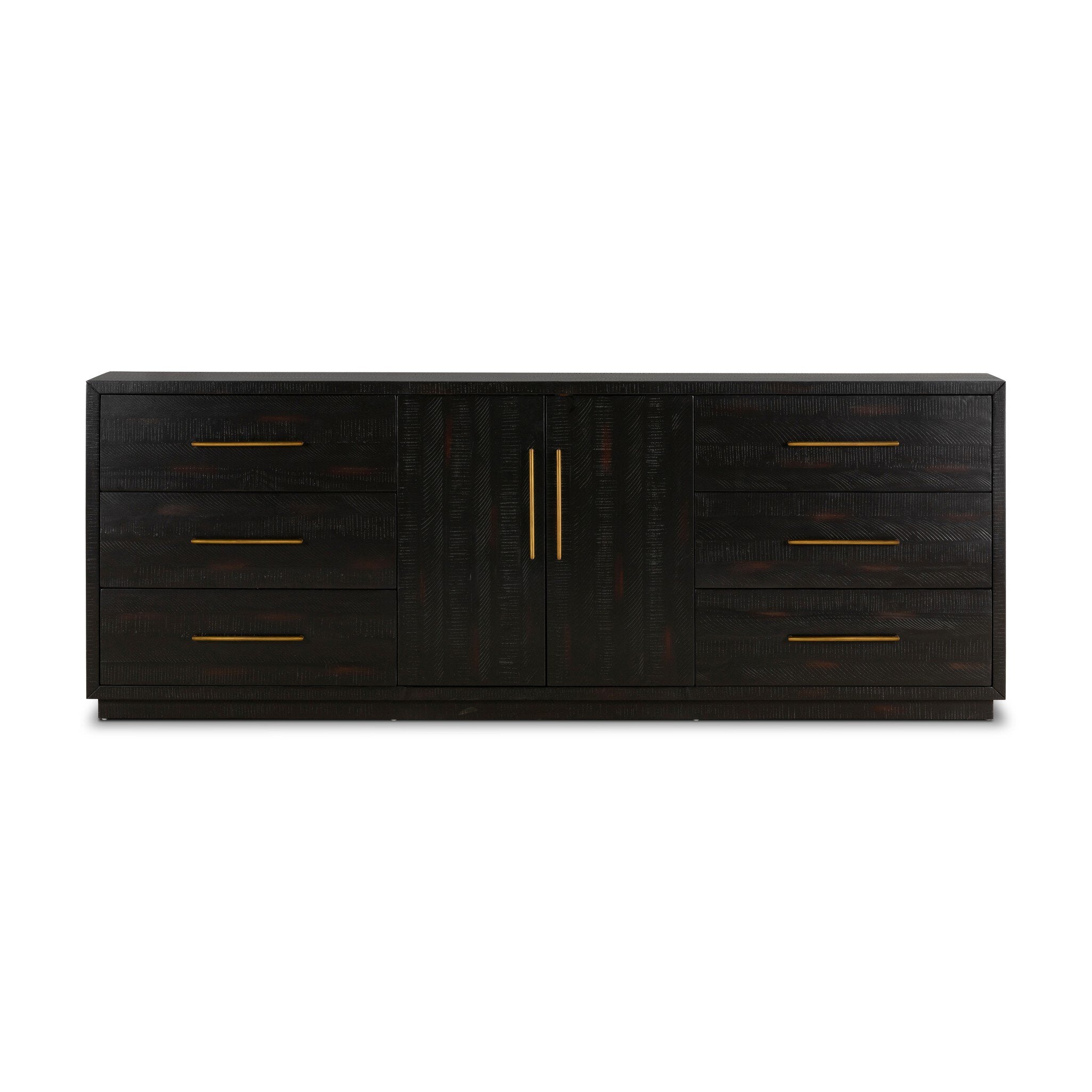 A hand-rubbed, burnished black finish draws the eye with high-low contrasts to modernize a mid-century shape. Brass-finished hardware adds a sleek touch to console's six spacious drawers and open-front cabinetry.
