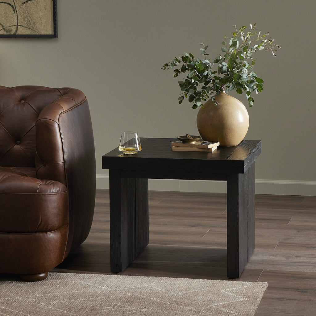 Black-finished oak shapes a streamlined end table with a rich yet minimalist look.