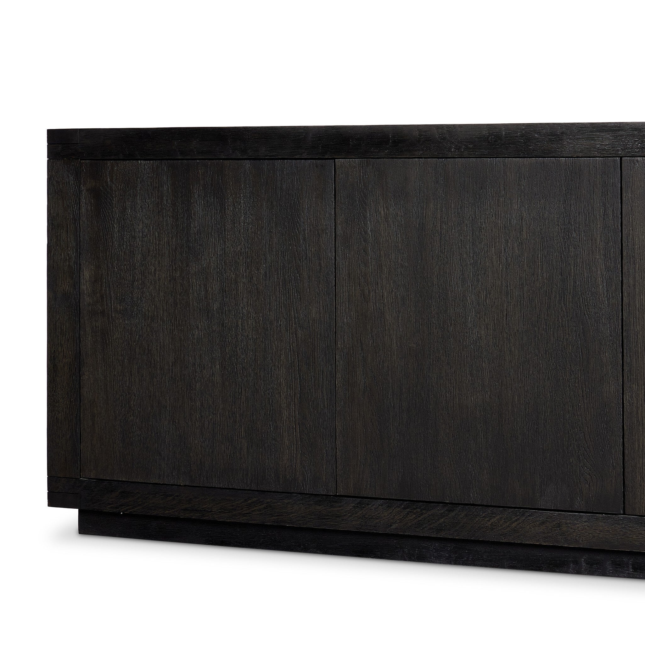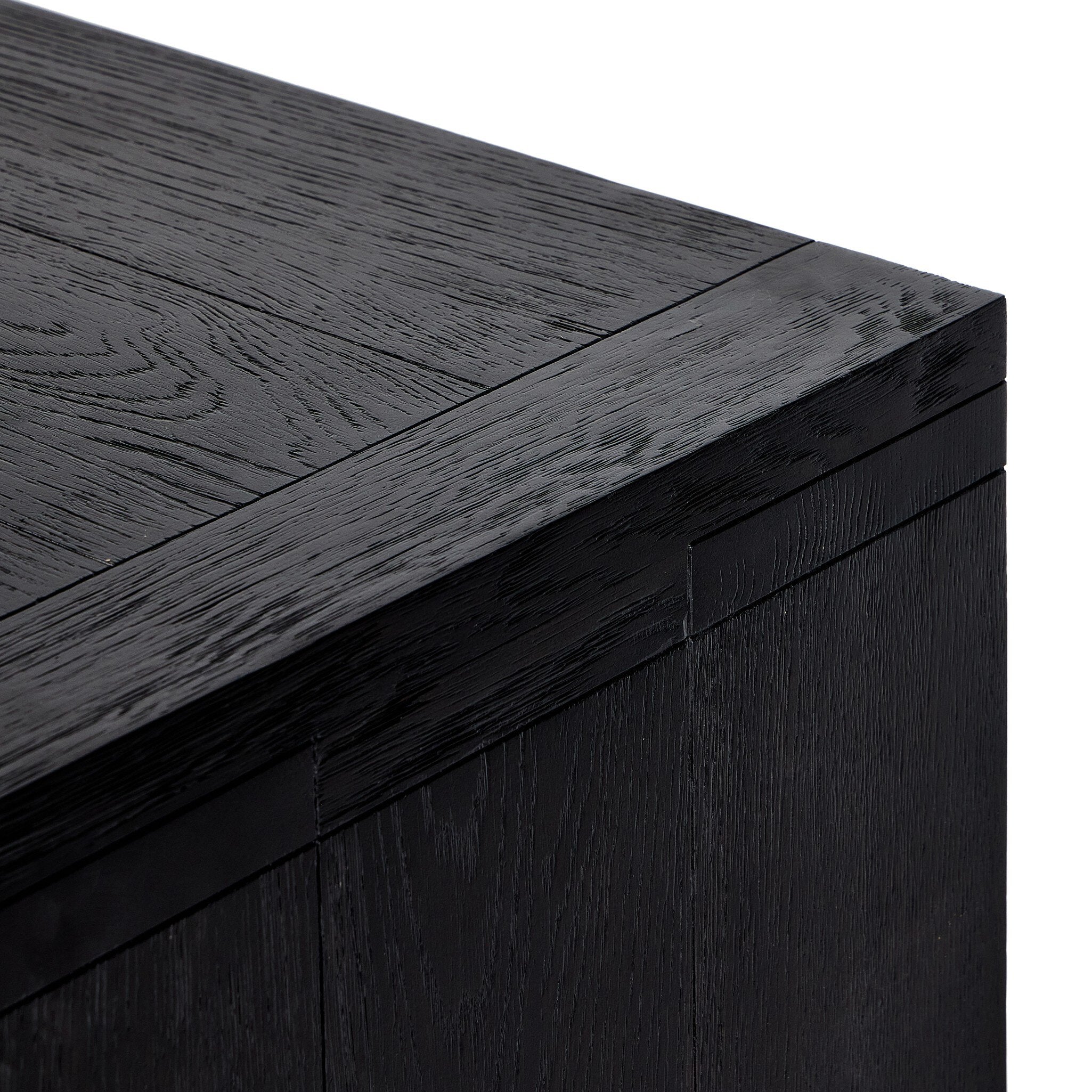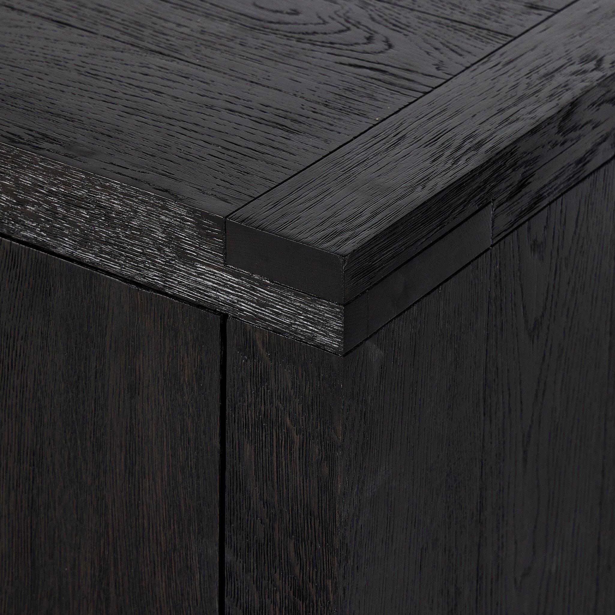 Black-finished oak shapes a streamlined box-style sideboard, with lap joint corners for a detail-driven touch.