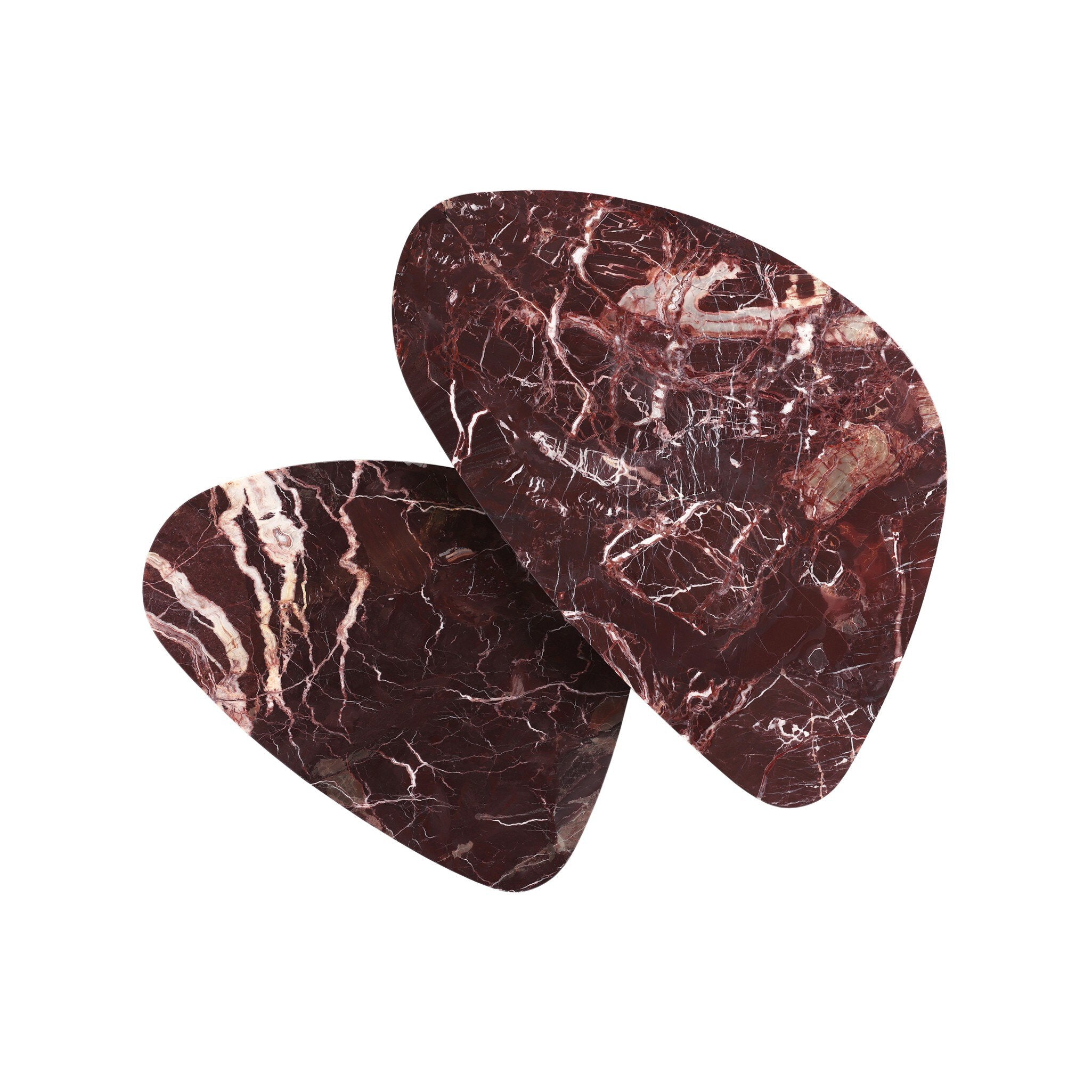 Made from solid marble with visible natural veining, turned pillar-style legs complement organically shaped tabletops, perfectly sized for nesting. Option to buy tables individually or together as a two-piece set.
