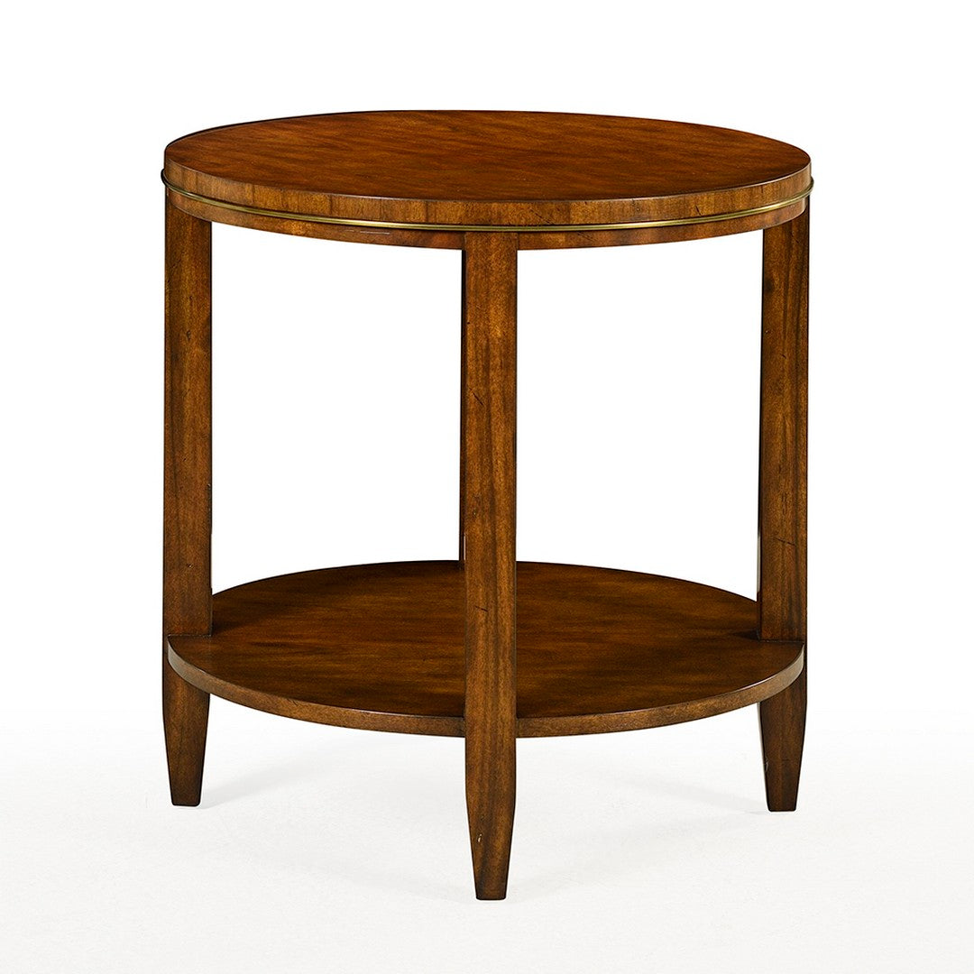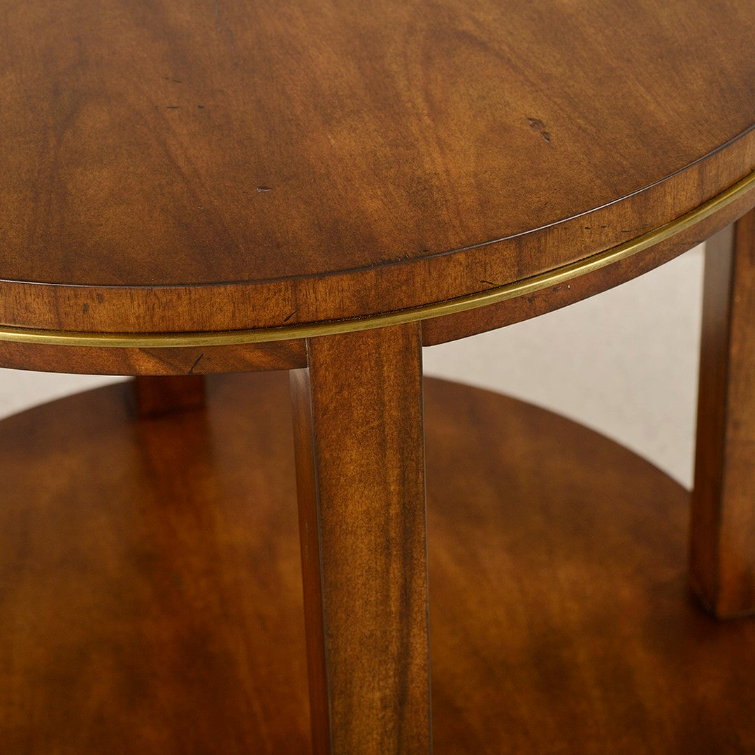 Our Antioch Side Table features a round, smooth top, open shelving, tapered legs, and a delicate brass detail