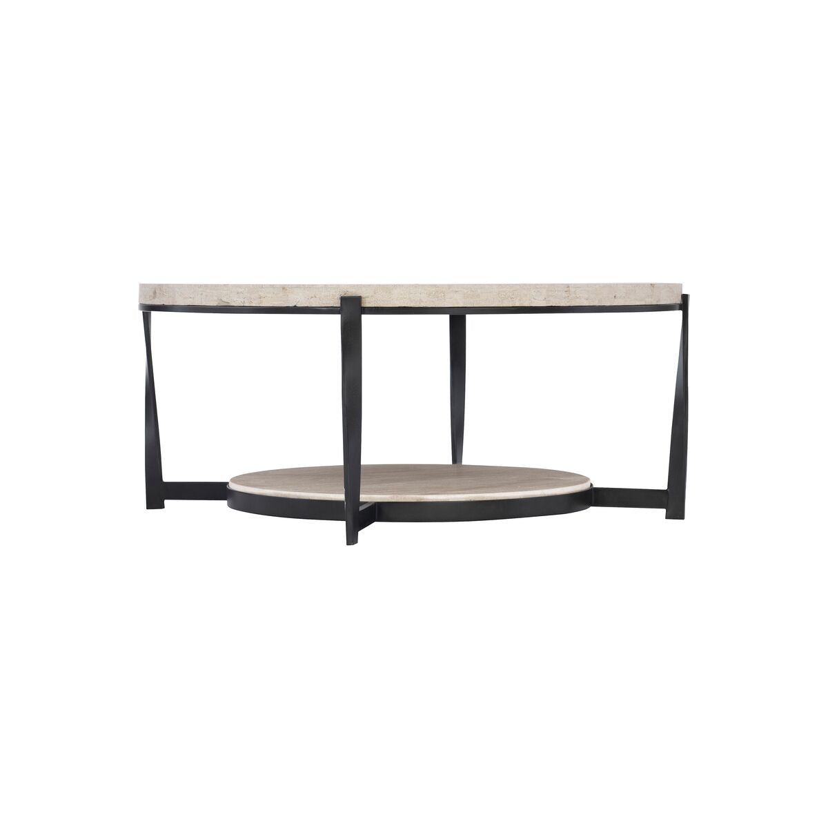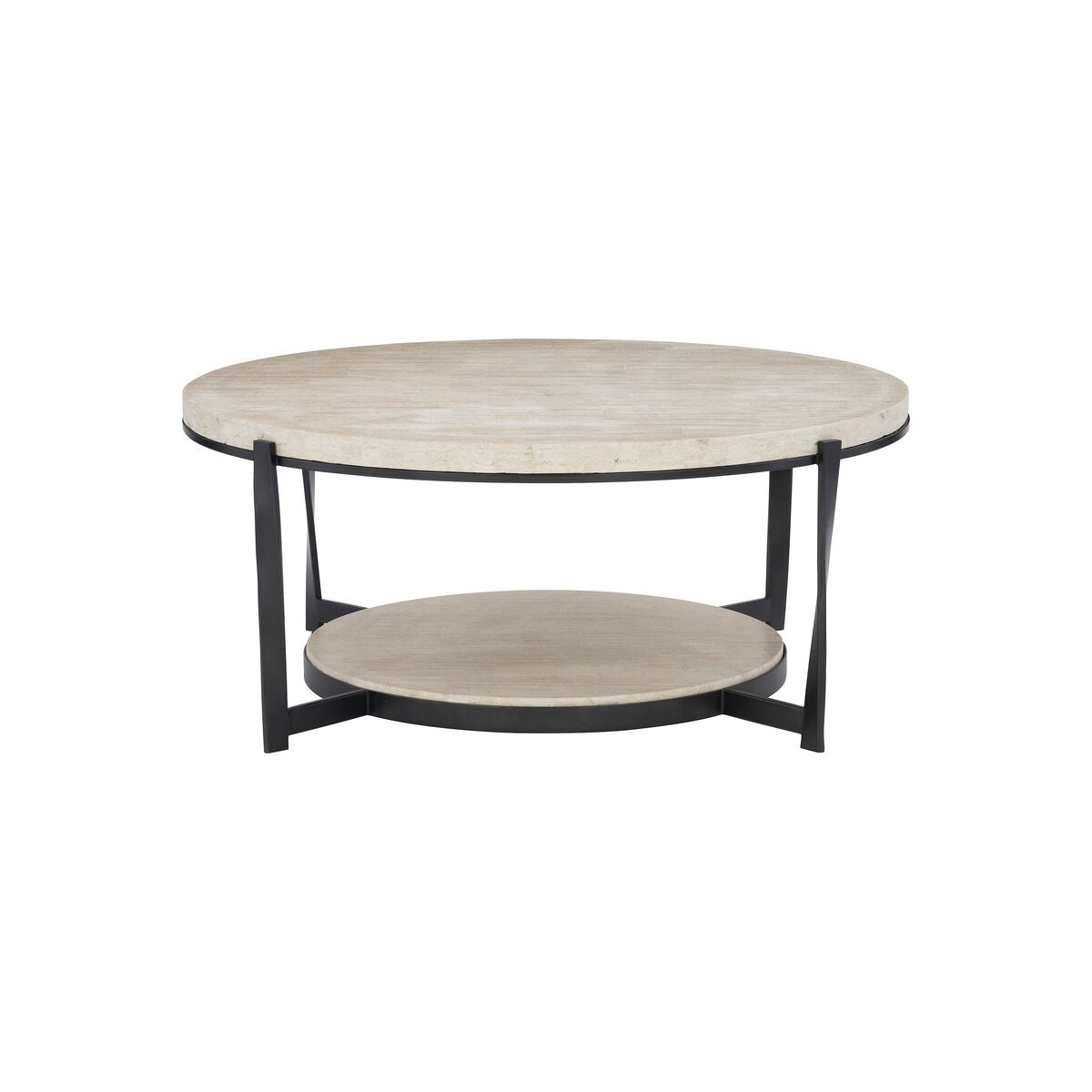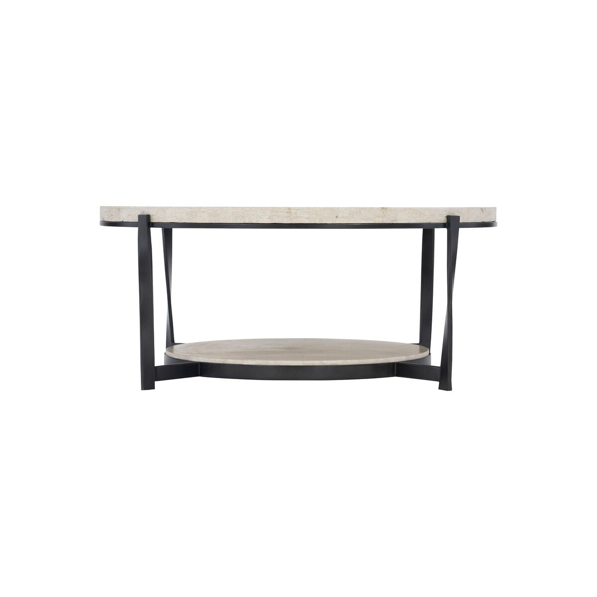 Laminated White Travertine Stone Top And Inset Stone Shelf. Textured Steel Frame In Aged Pewter Finish. Adjustable Glides.