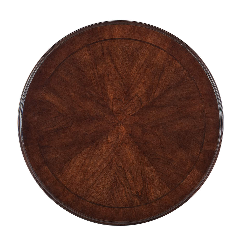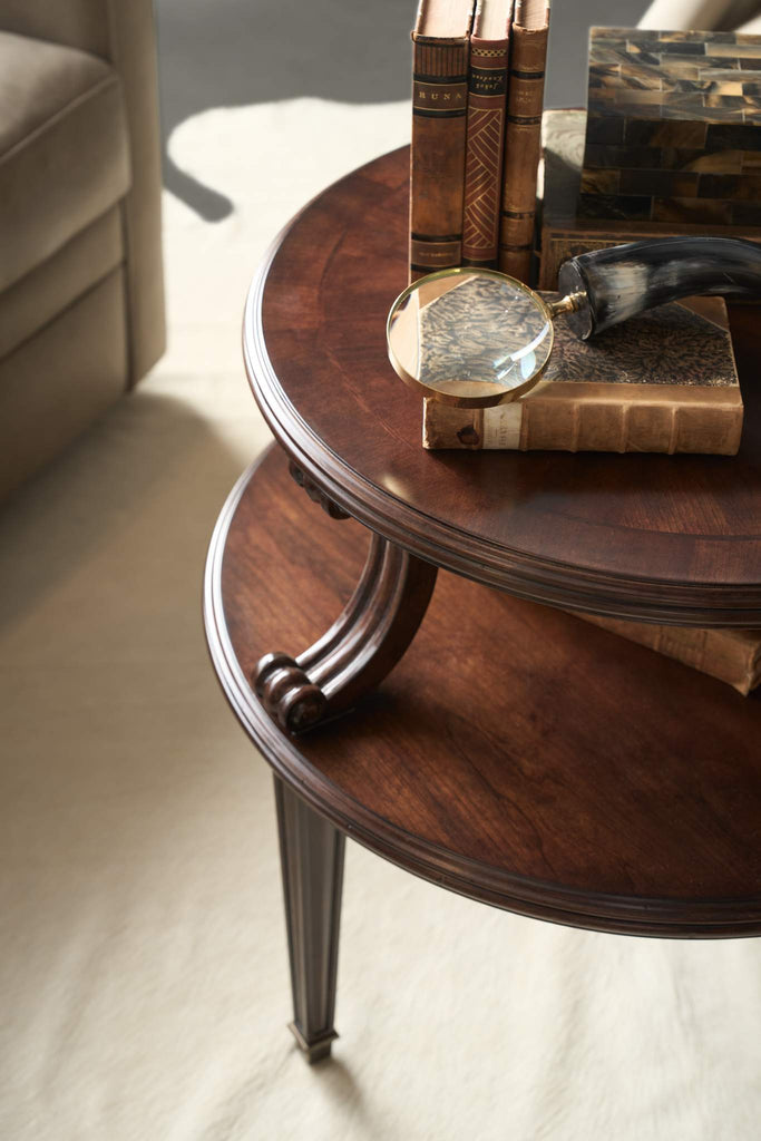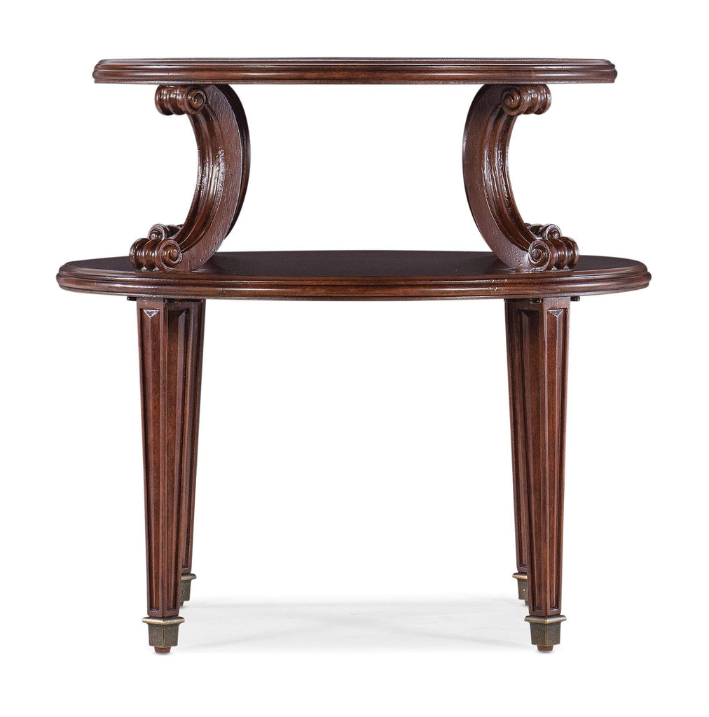 With flair and grace, the two-tiered Charleston Side Table has two surfaces separated by decorative carved wood scrolls in all 4 corners. This distinctive piece has antique bronze metal ferrules on the feet, tapered legs, carved accents and an inlay border on the top. Crafted of Cherry Veneers with Walnut Inlay, it is finished in Maraschino Cherry using natural grain Cherry Veneers showcasing cathedral patterns in the wood.