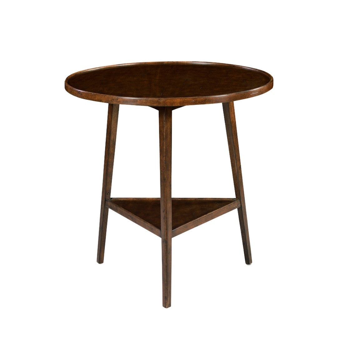 Our Cricket Side Table features a round lip top, a triangle-shaped lip shelf, and three tapered legs