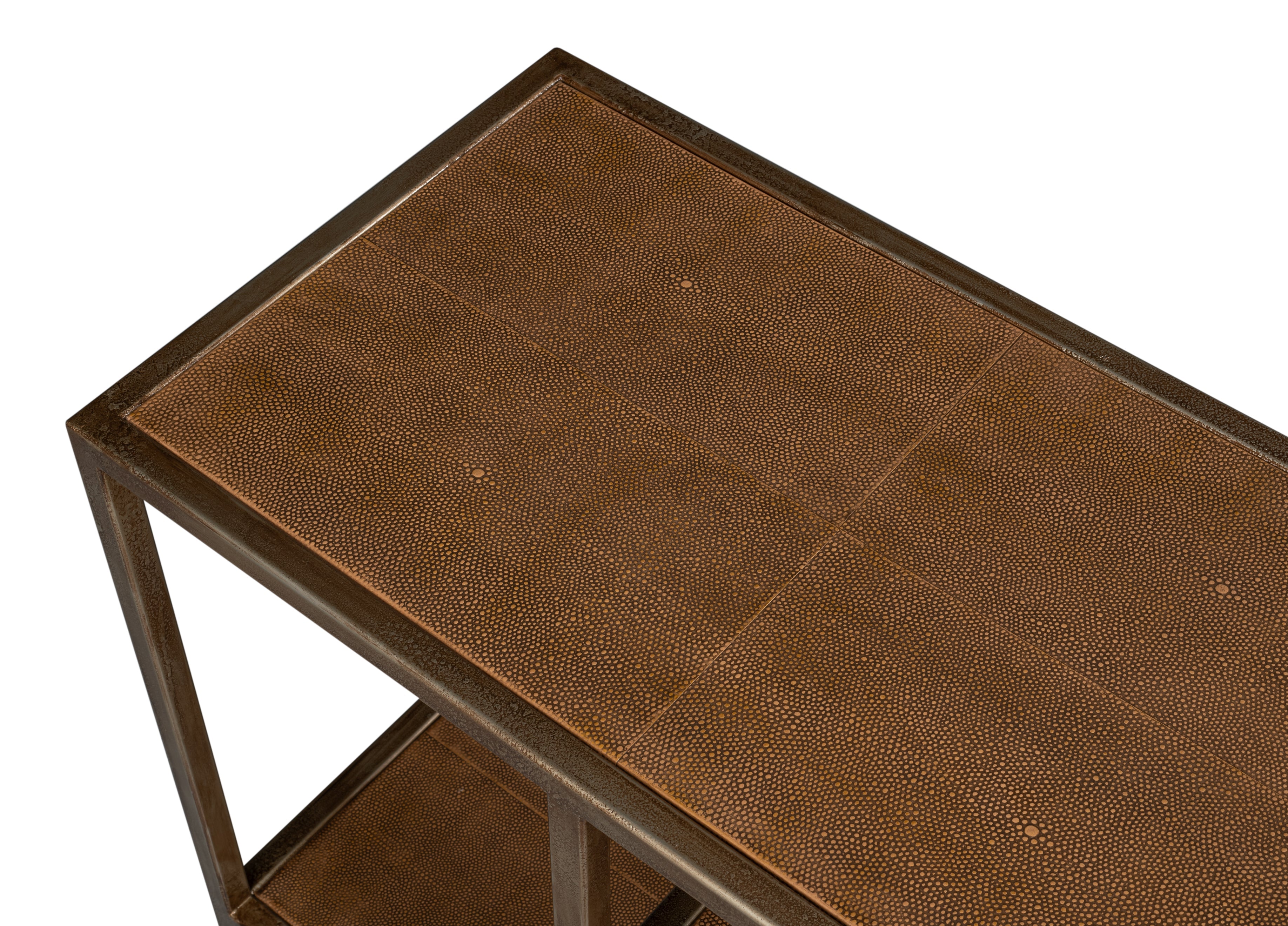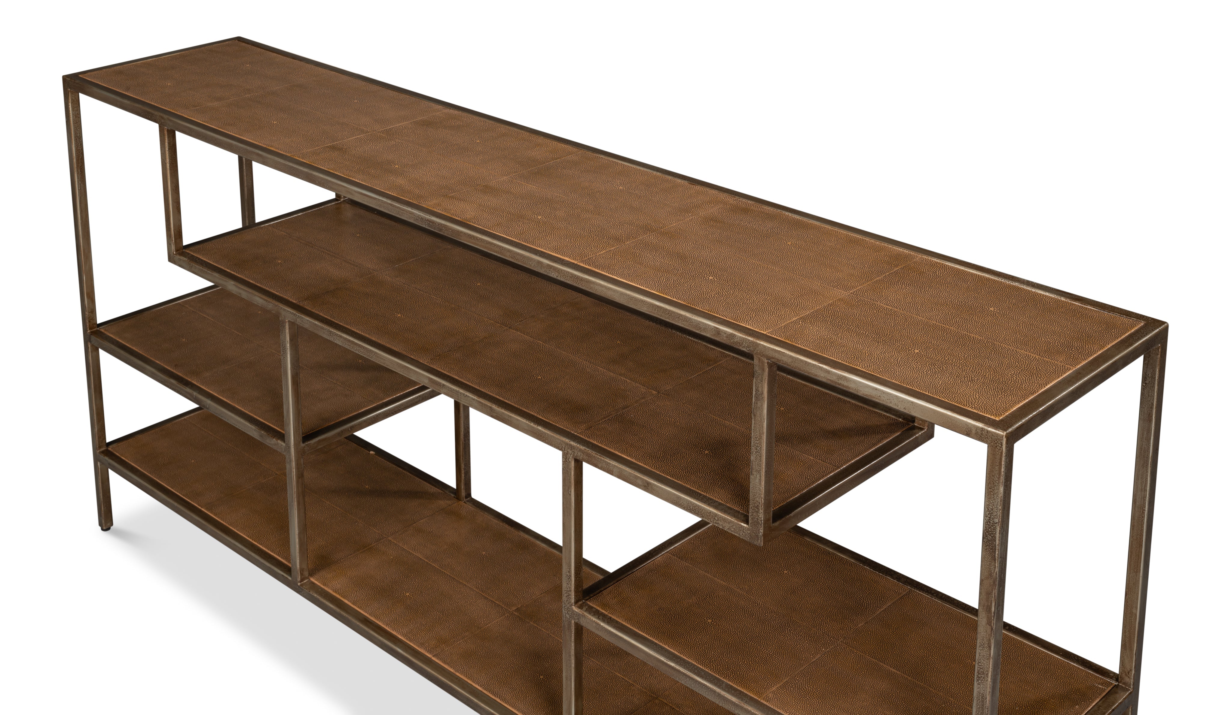 Create a statement of sophistication with our sleek console featuring an antique bronze frosted metal fram supporting its tawny brown shagreen leather-wrapped shelves, ideal for displaying books and collected accessories. This piece effortlessly merges sophistication and versatily, adding a touch of understated elegance to any space.
