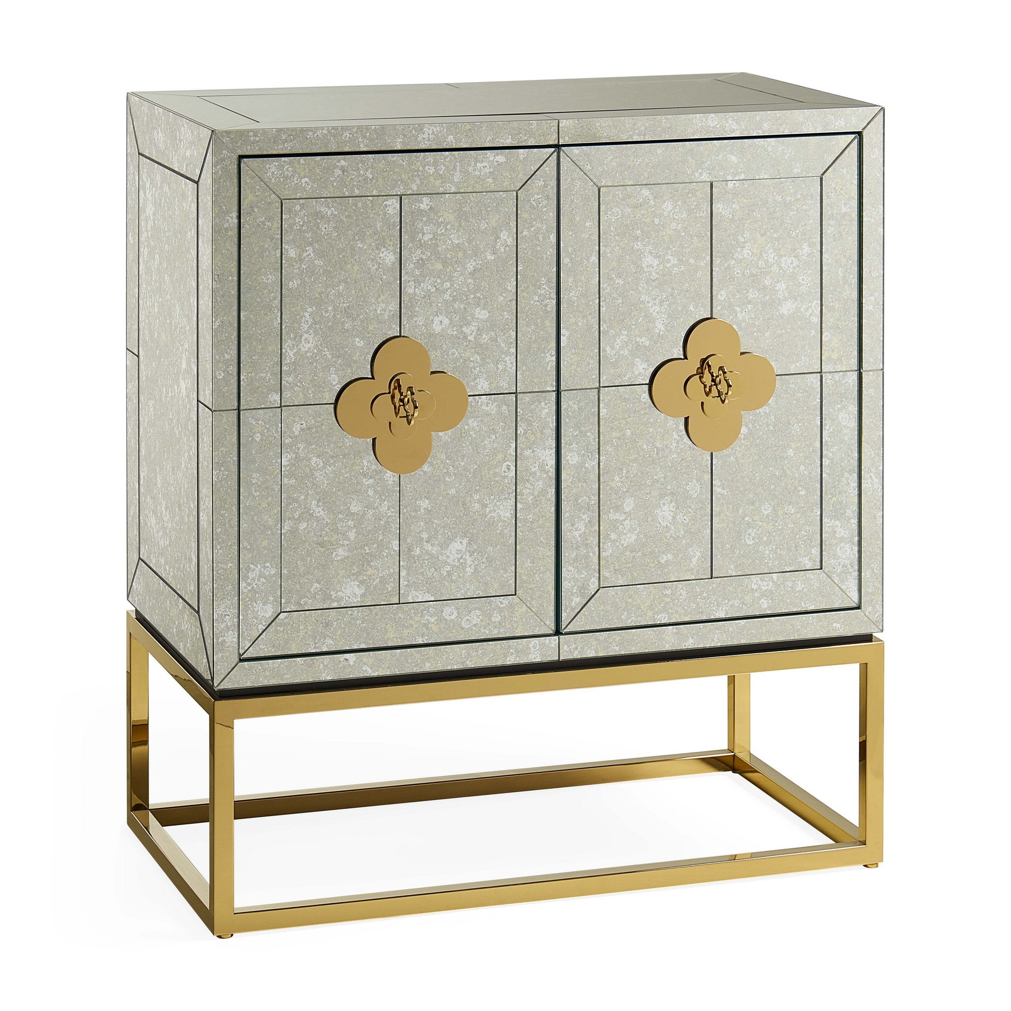 Minimalist forms meet Maximalist glamour. Antiqued mirror with a polished brass base. Two doors open to reveal a bright robin's egg blue interior fitted with one adjustable shelf. Quatrefoil handles and escutcheons add a decorative flourish to the simple form.