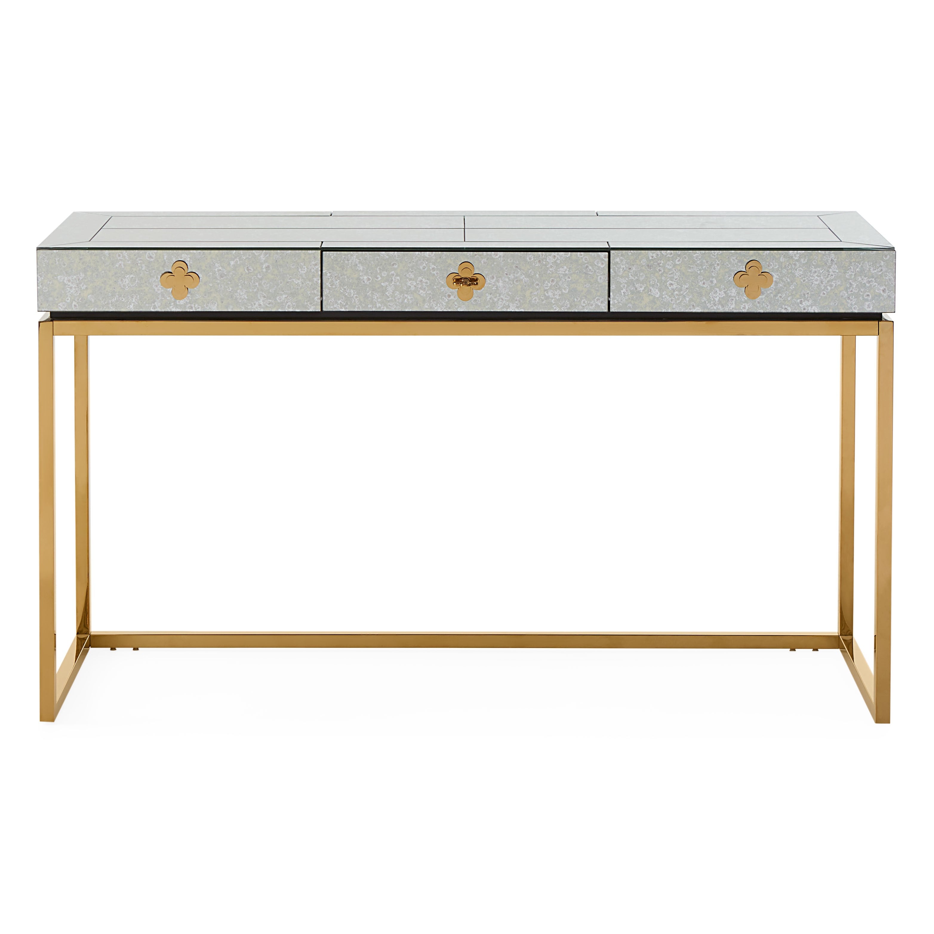 Minimalist forms meet Maximalist glamour. Antiqued mirror with a polished brass base. Our Delphine Desk features a single center drawer finished with bright robin's egg blue lacquer.