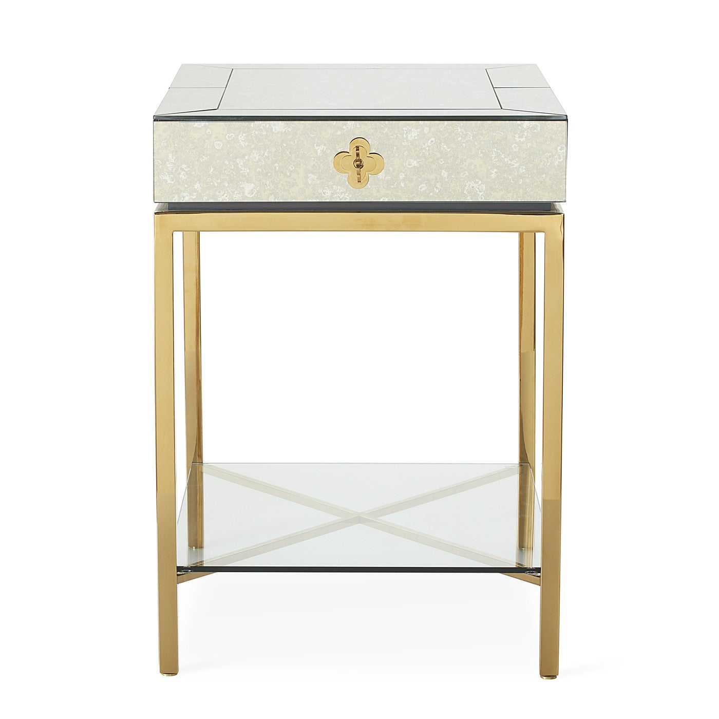 Minimalist forms meet Maximalist glamour. Featuring antiqued mirror, a polished brass base, quatrefoil details, and a drawer that opens to reveal a bright robin's egg blue interior. At its elevated height, our Delphine Tall Side Table pairs perfectly with our high-arm Lampert and Baxter sofas. Its low glass shelf creates the space for stashing and styling your favorite books and baubles.
