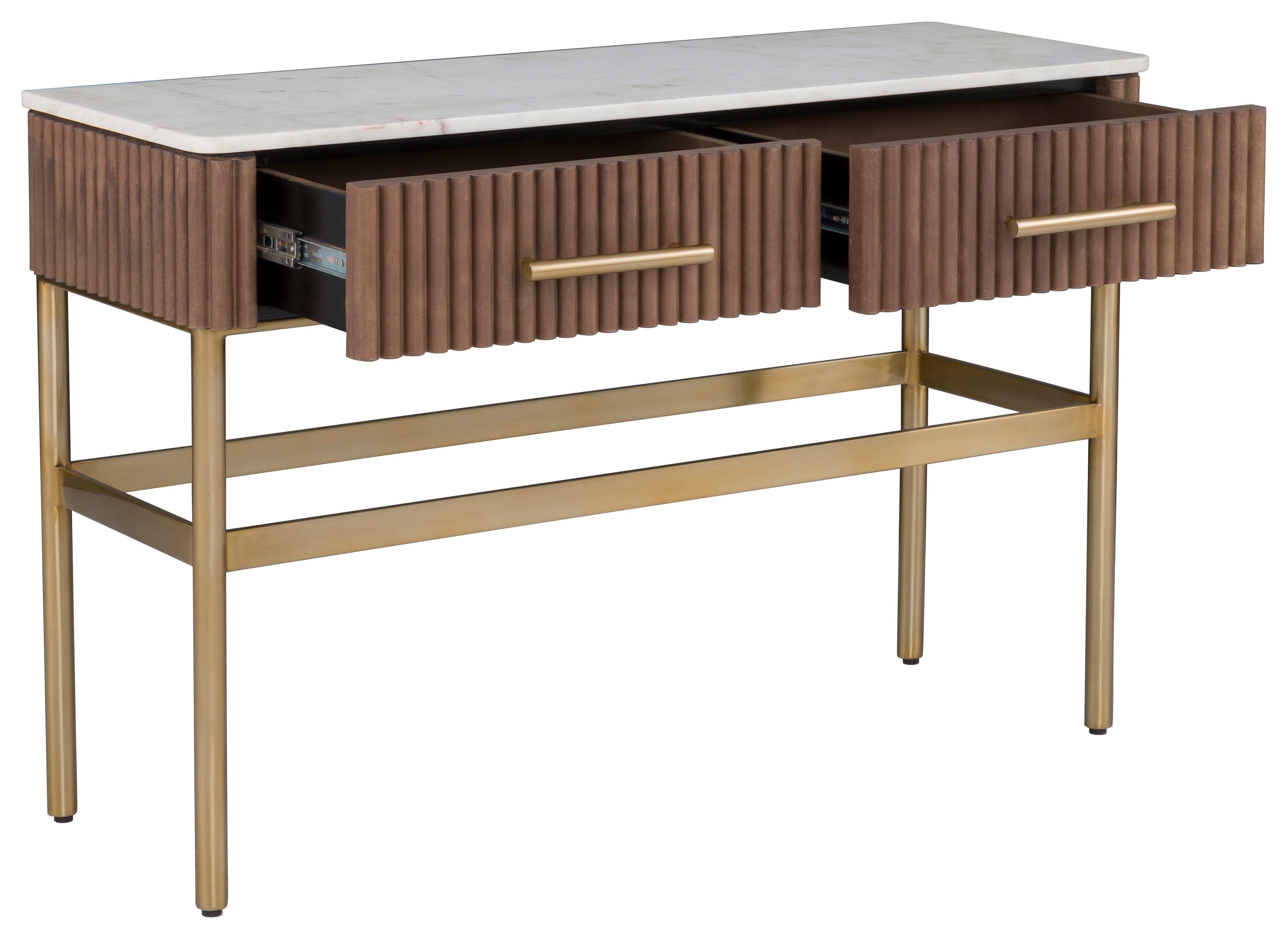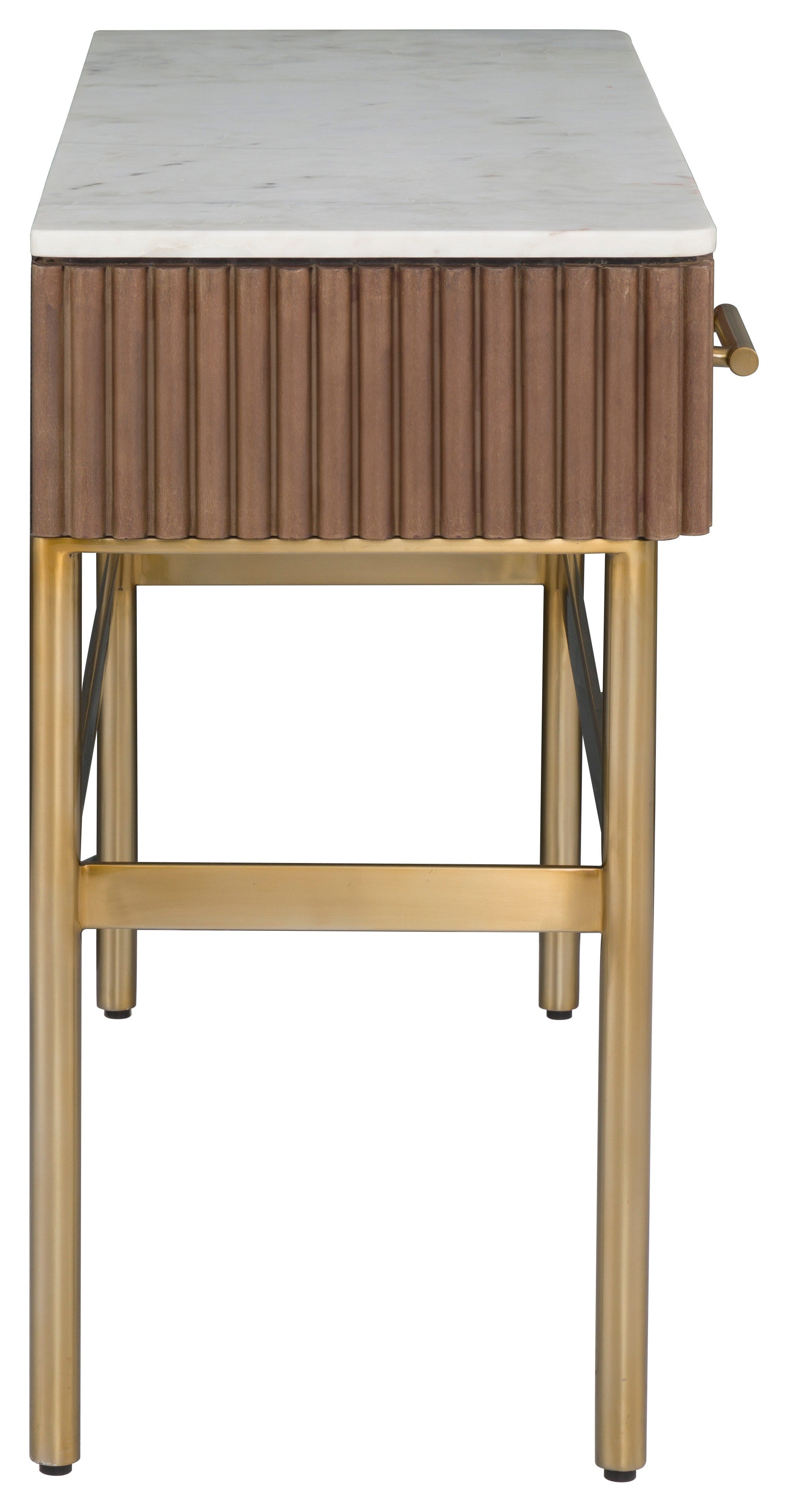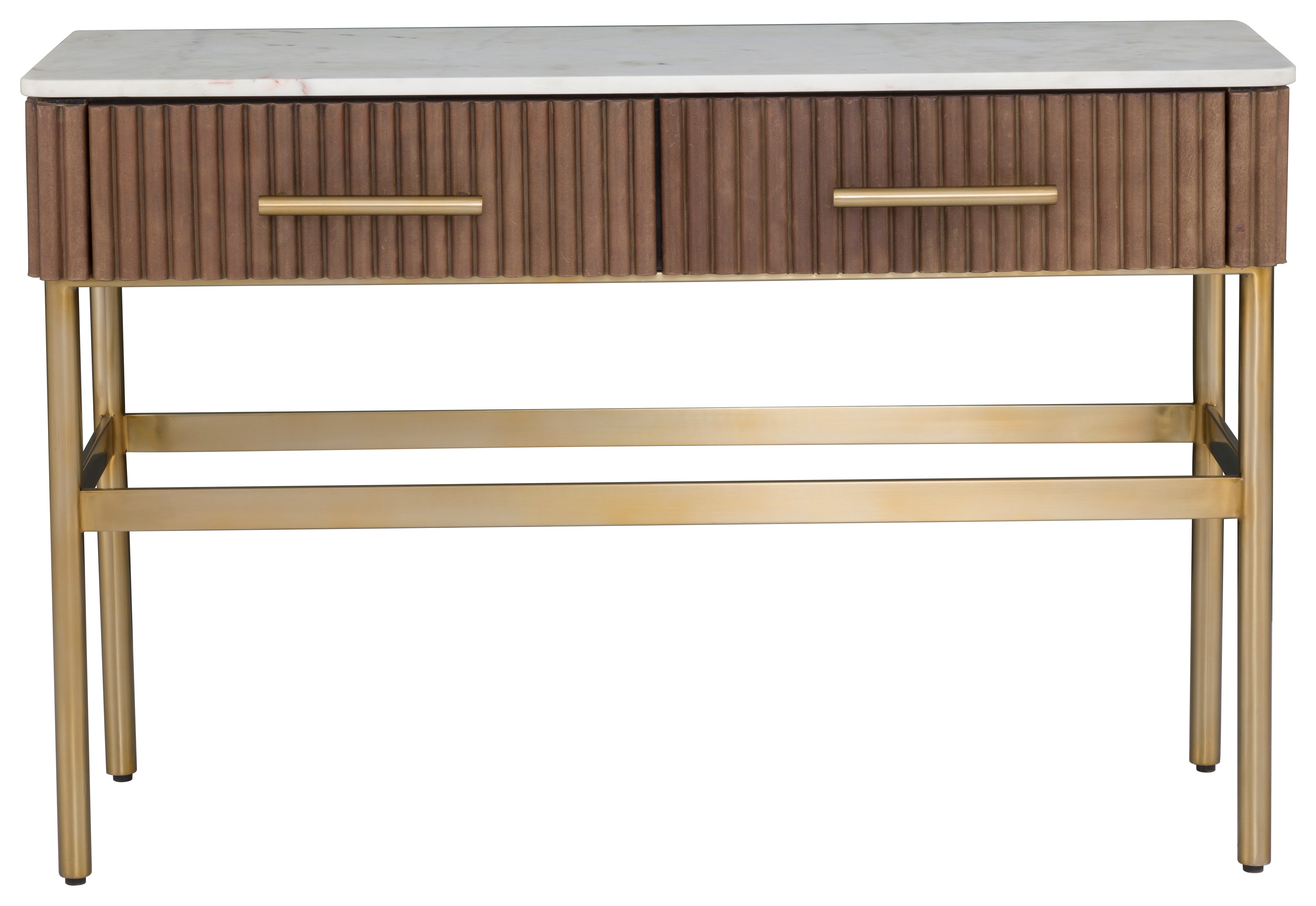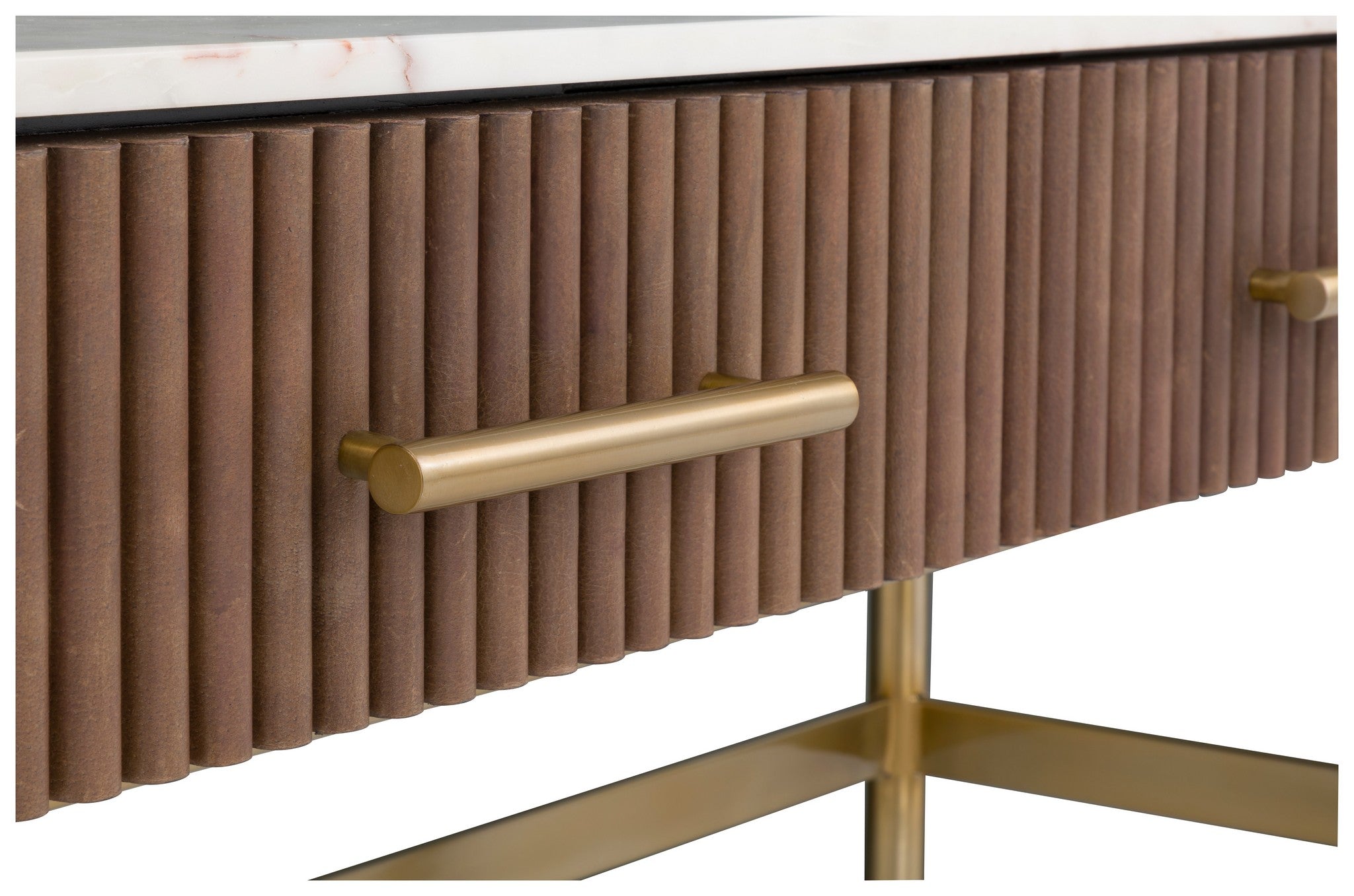 Two drawers. Leather wrapped with White Marble top and Aged Gold metal base.