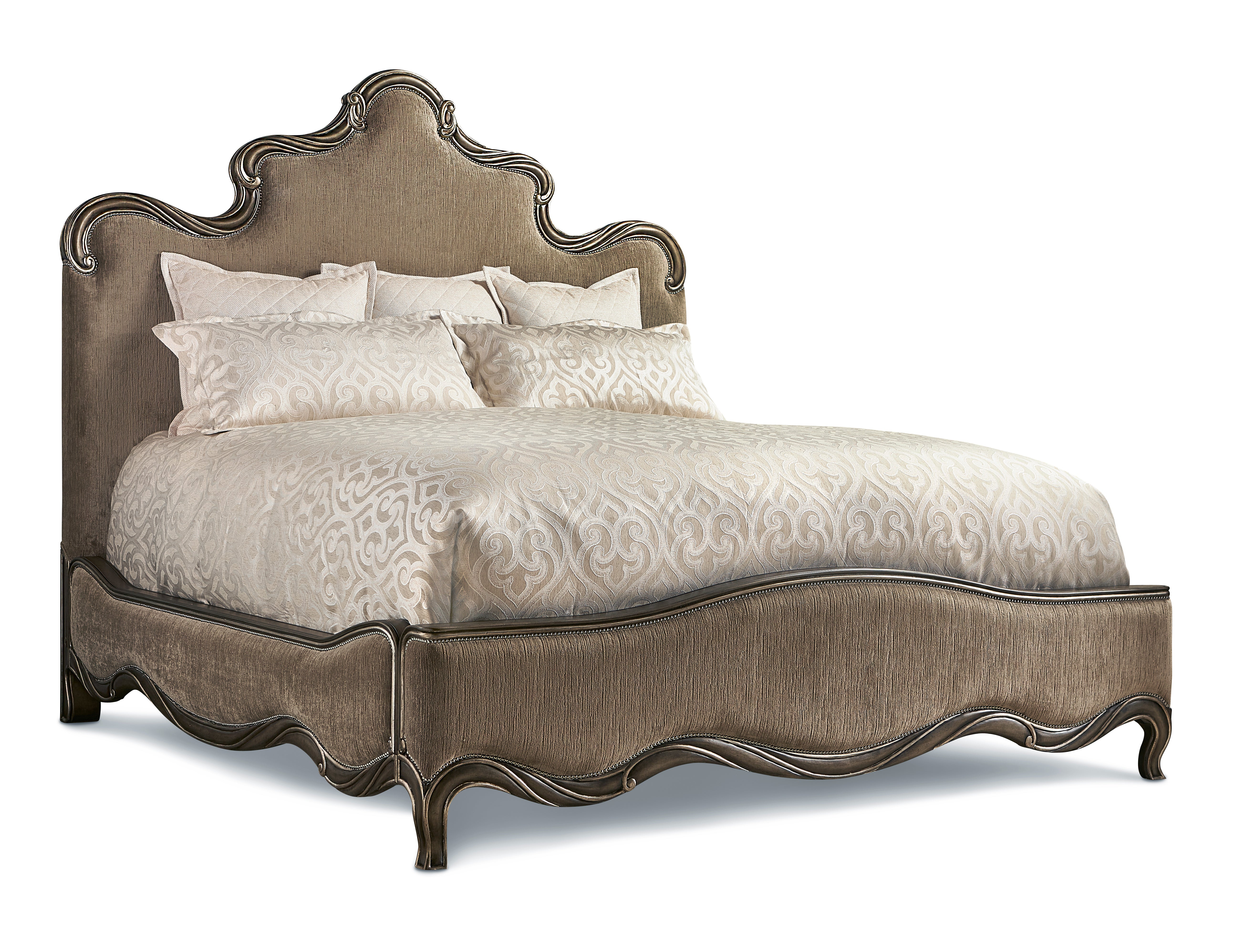 Elegant King Bed in Bronzed Silver finish with Verona Silver trim. Solid Mahogany Wood, with Diamond Quilted fabric upholstery. Featuring handmade carving on headboard, footboard, and side rails.