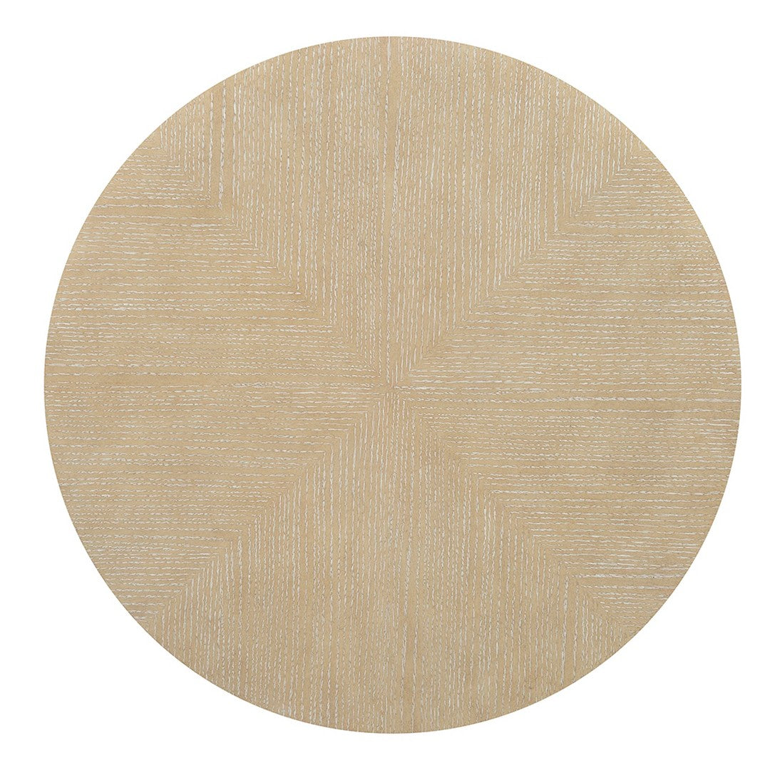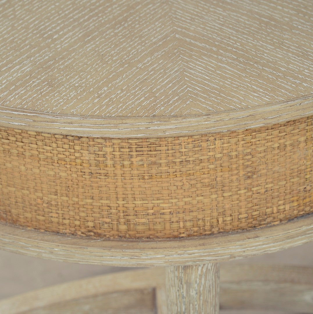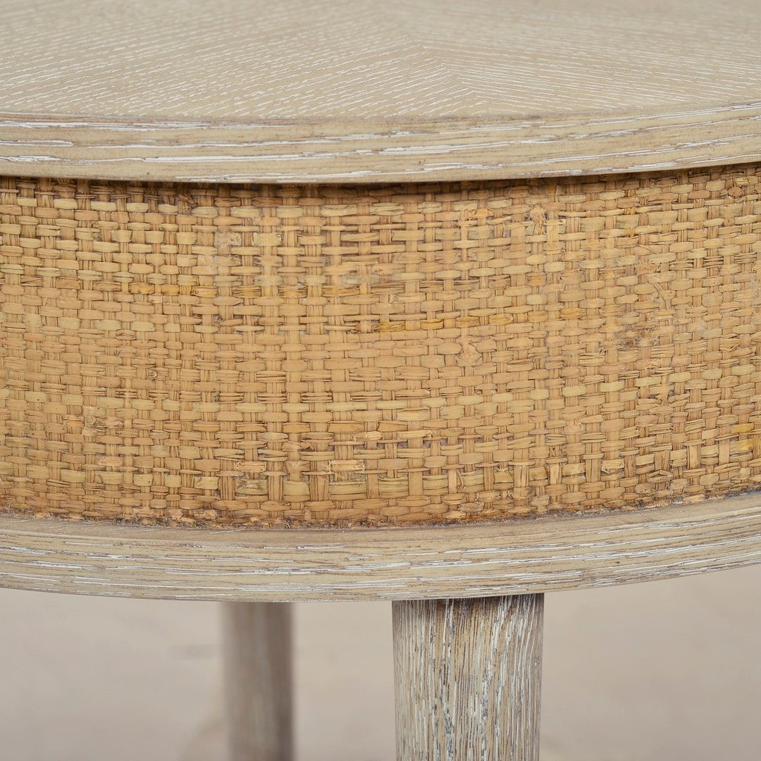 Our Kirkwood Side Table features a round top with a Raffia detail apron, a shaped stretcher, round, tapered legs, and slightly textured pewter finish ferrules
