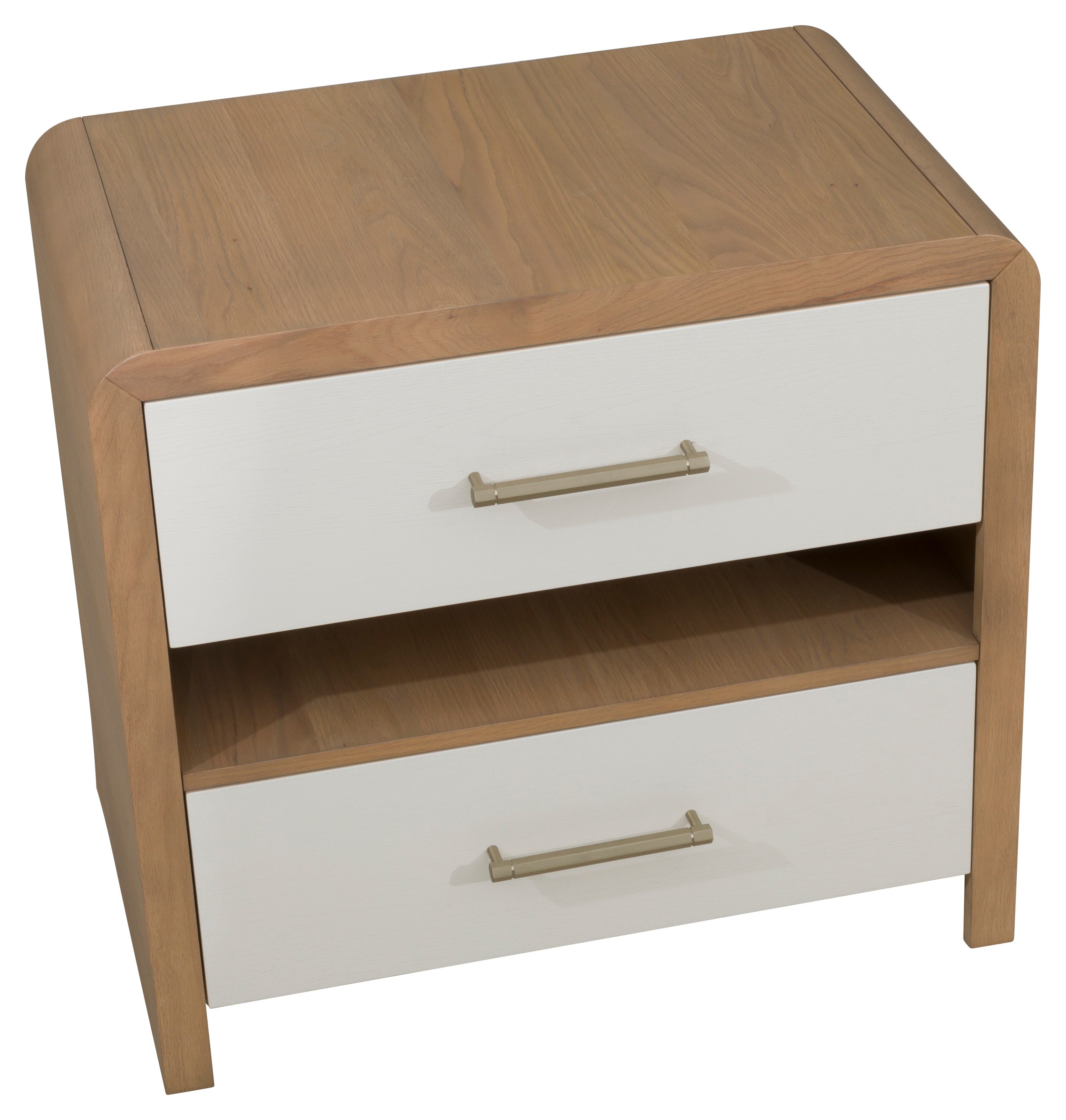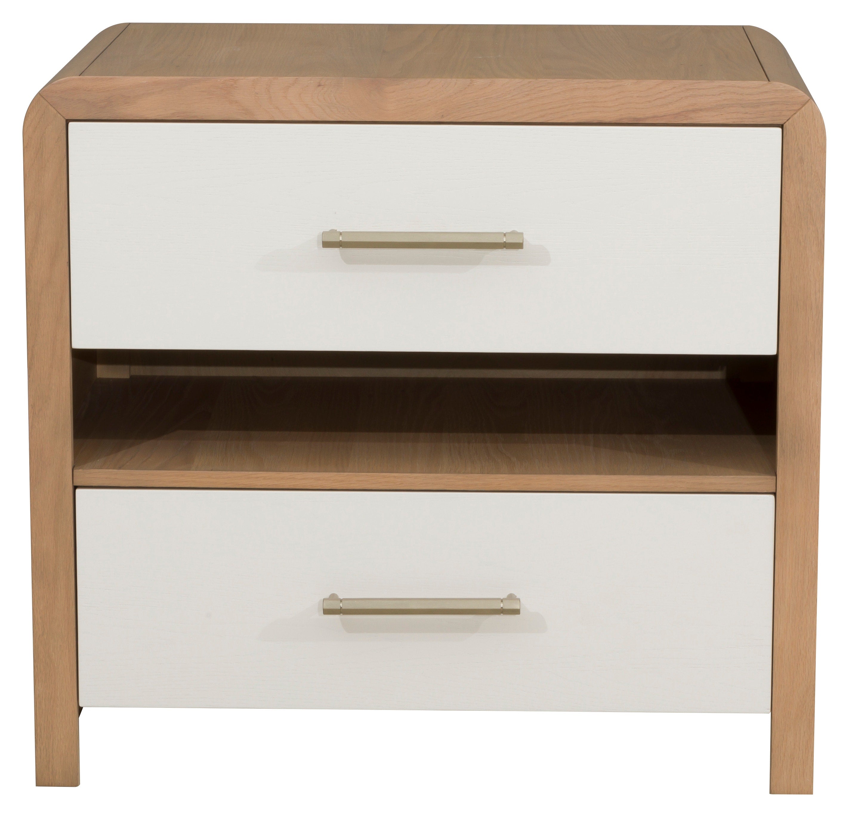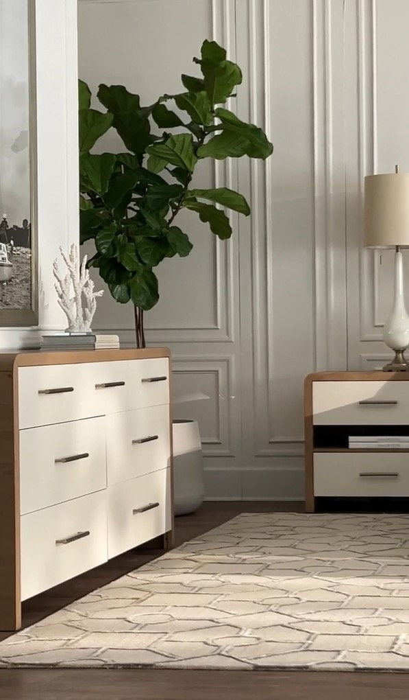 The Brentwood nightstand is all about combining finishes to create a stylish look for a dynamic design. This well-proportioned piece feels substantial and with the upper curved lines there is still a softness and an ease to the overall feel. The champagne brass hardware is the perfect highlight on the creamy latte drawer faces and the natural Jute finish on the outer wood frame creates contrast that makes the Brentwood nightstand so versatile.