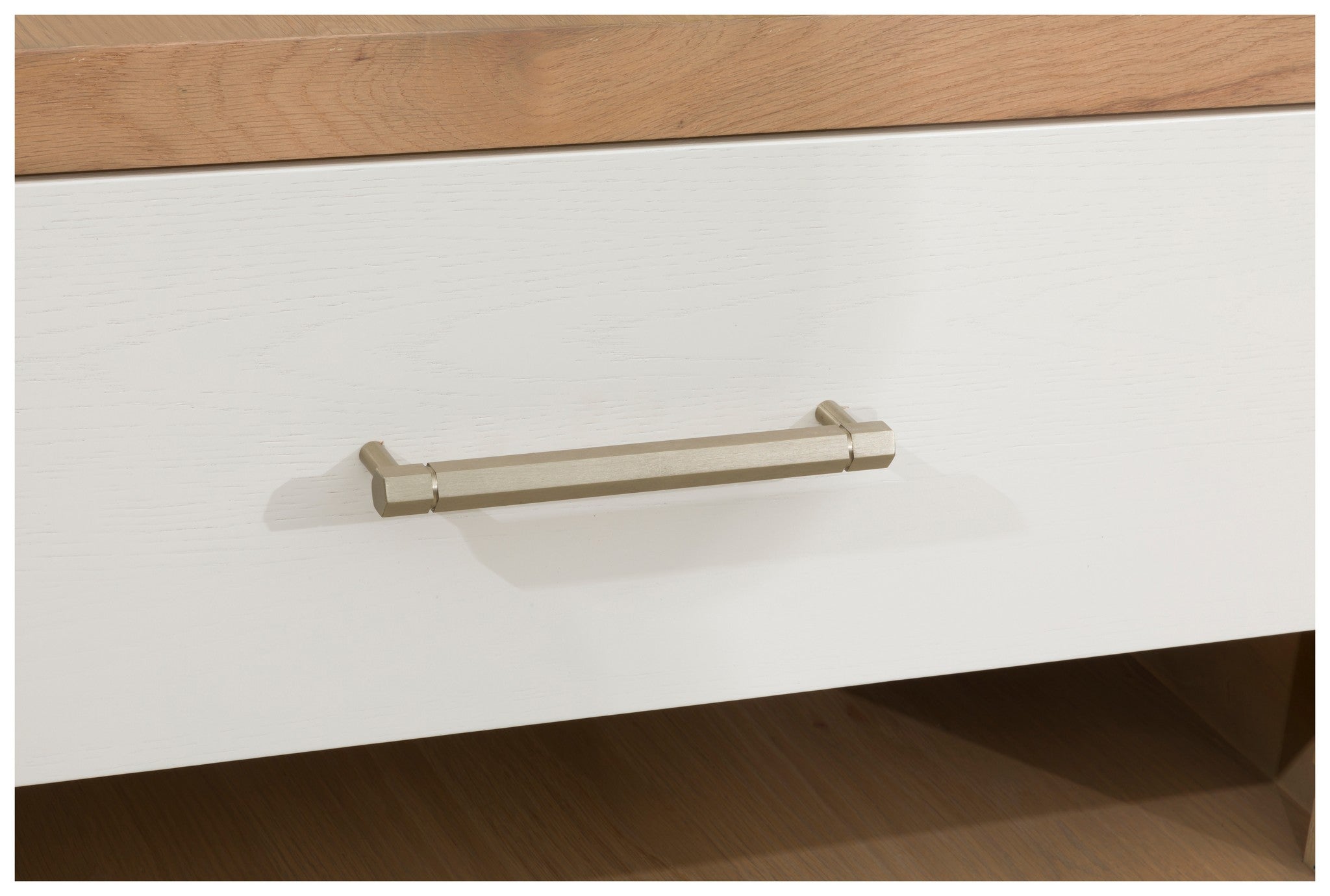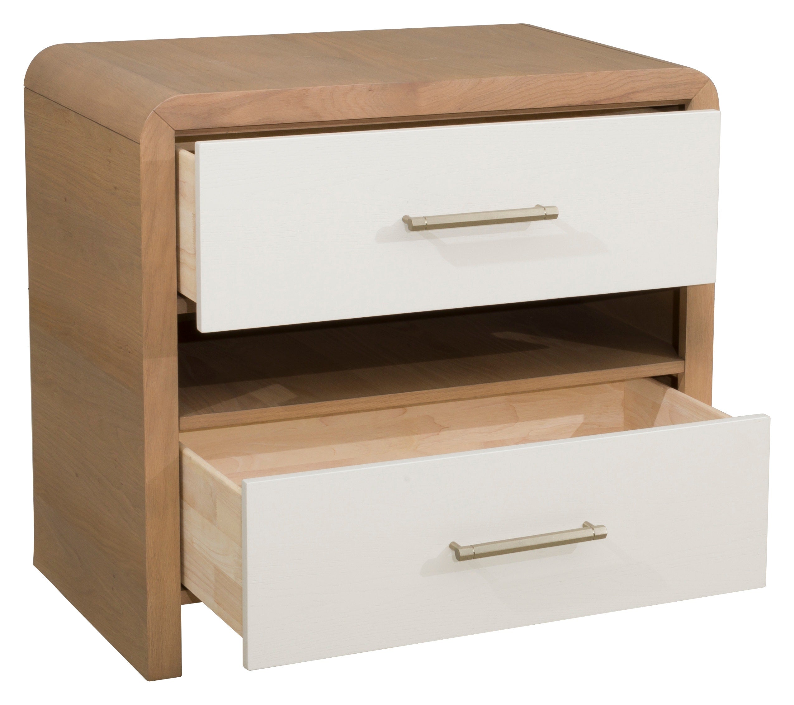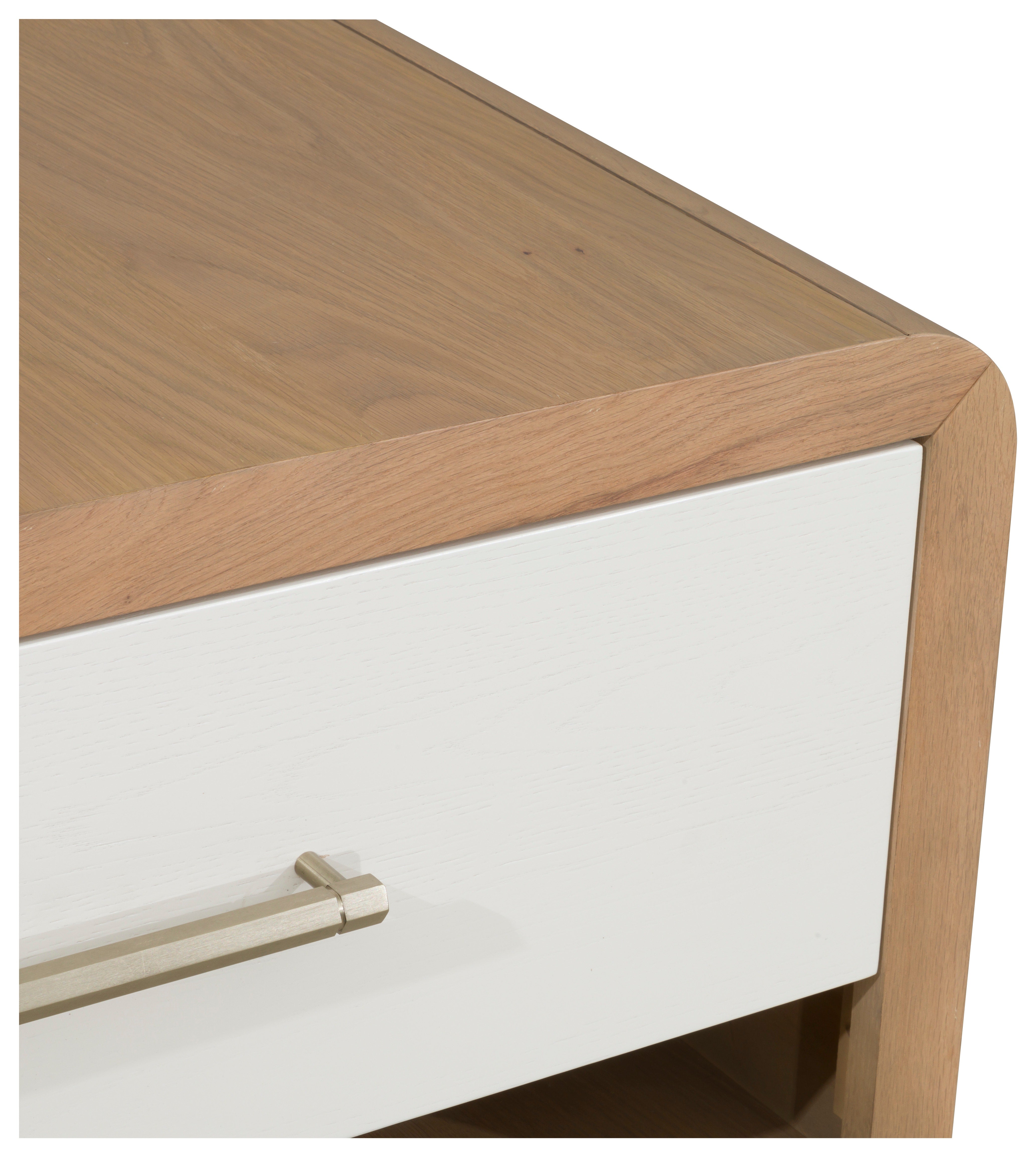 The Brentwood nightstand is all about combining finishes to create a stylish look for a dynamic design. This well-proportioned piece feels substantial and with the upper curved lines there is still a softness and an ease to the overall feel. The champagne brass hardware is the perfect highlight on the creamy latte drawer faces and the natural Jute finish on the outer wood frame creates contrast that makes the Brentwood nightstand so versatile.