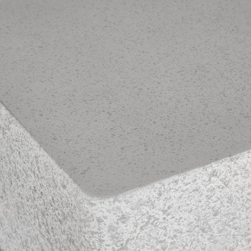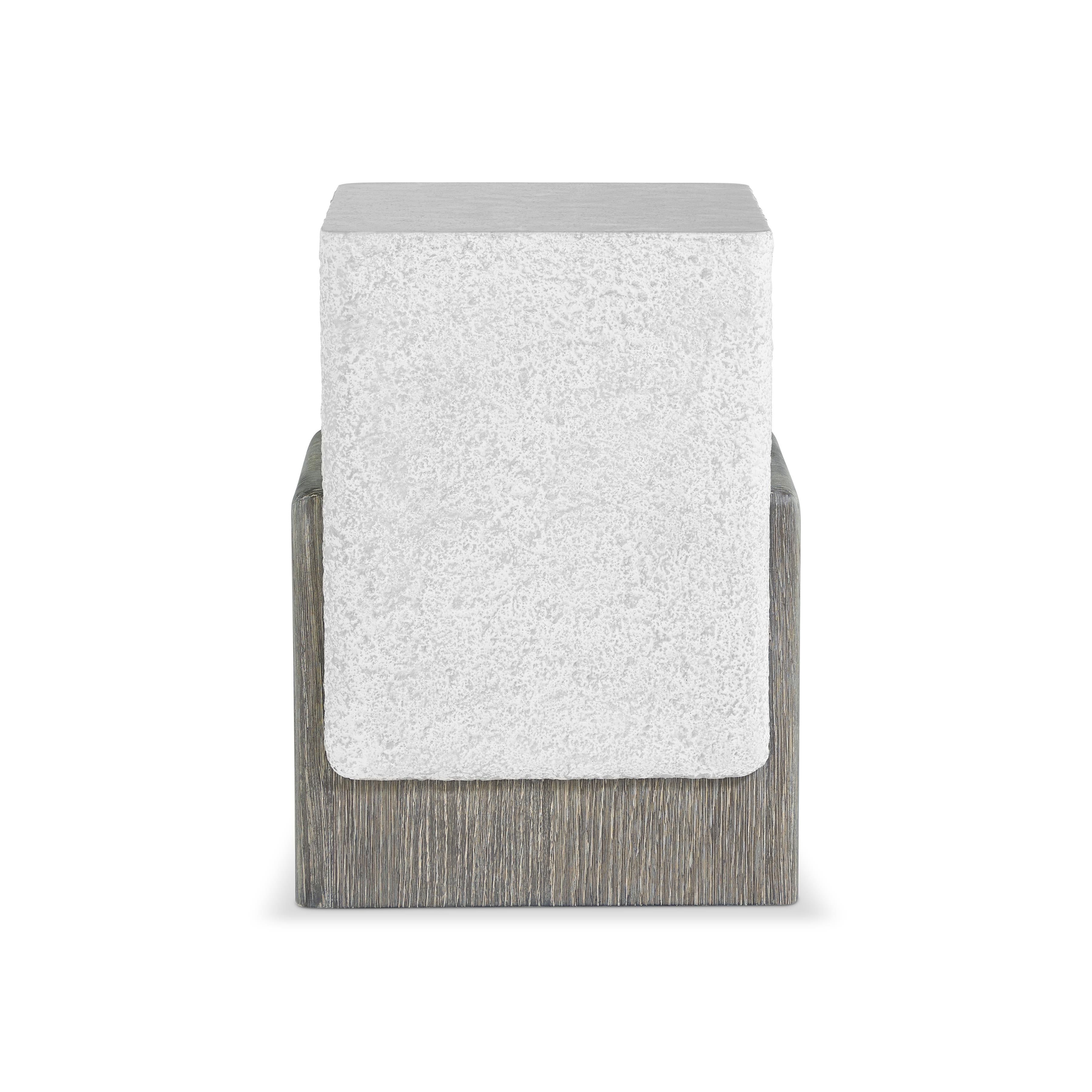 The Monolith accent table showcases a bold design with a textured faux stone block in a wooden base. The top offers a smooth surface with textured sides. The wood base in Puma finish curves up to cradle two sides. It's a modern style with an organic inspiration.