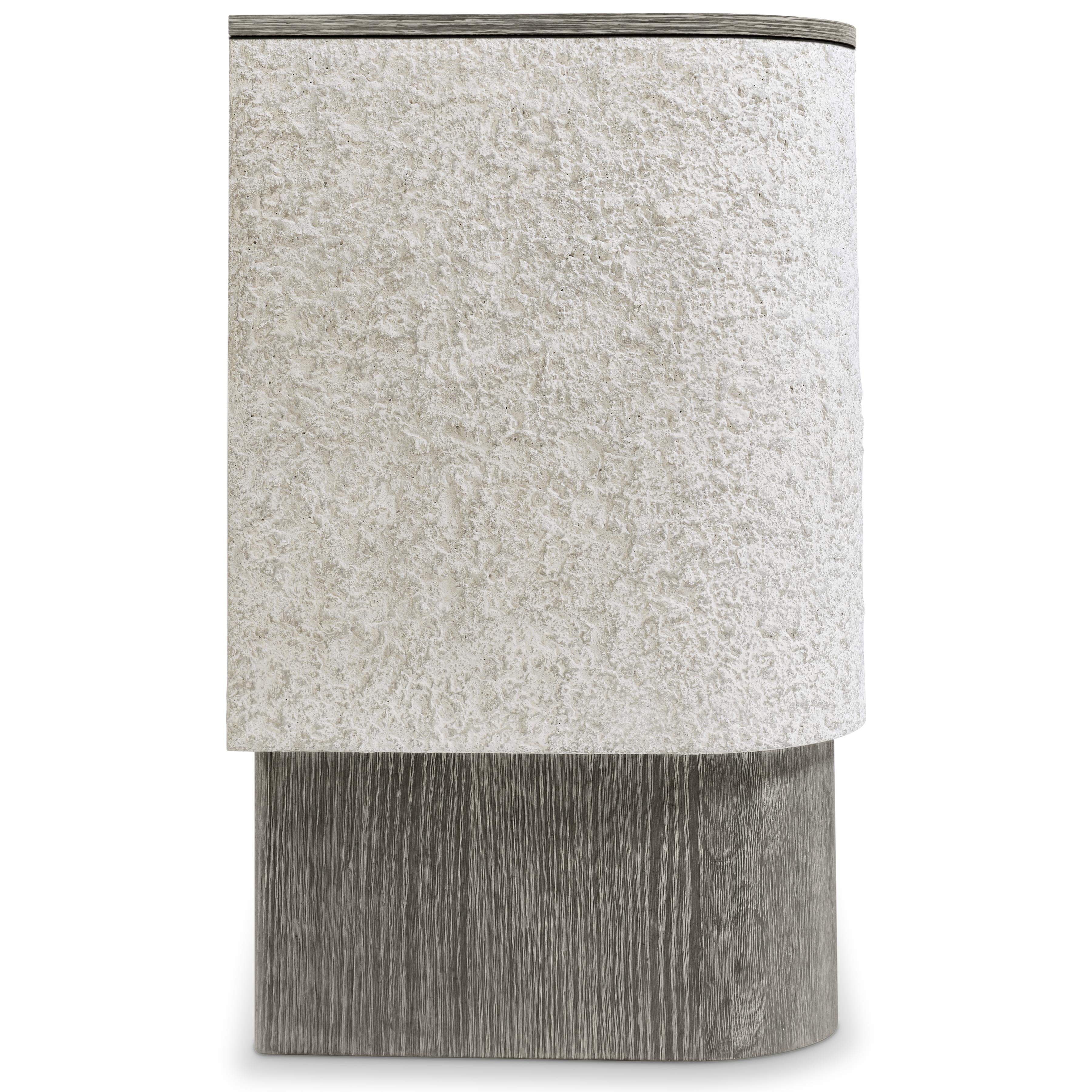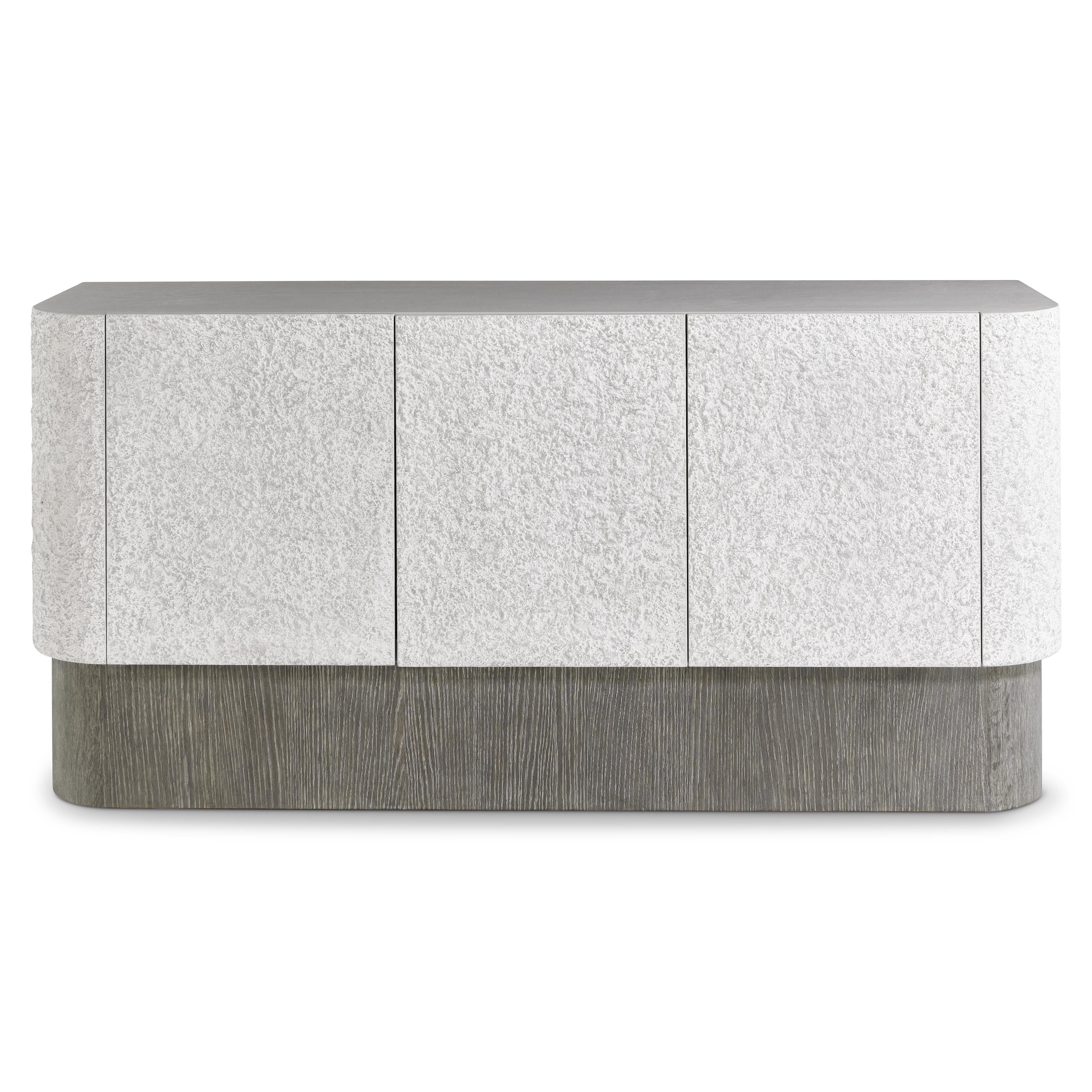 A bold profile balances style and substance for the Monolith buffet. Textured faux stone in Millstone finish wraps around the door fronts and sides, complementing the woodgrain's Puma finish on the top and plinth base. Paired push-to-open doors reveal a drawer with a silver insert, while a third door opens to an adjustable shelf.