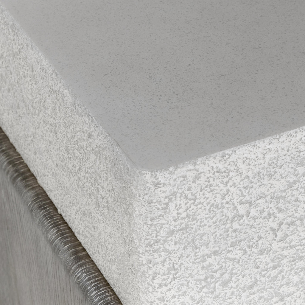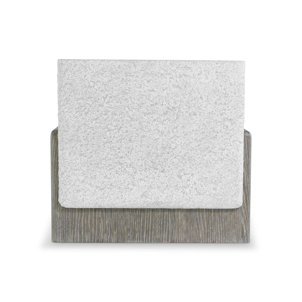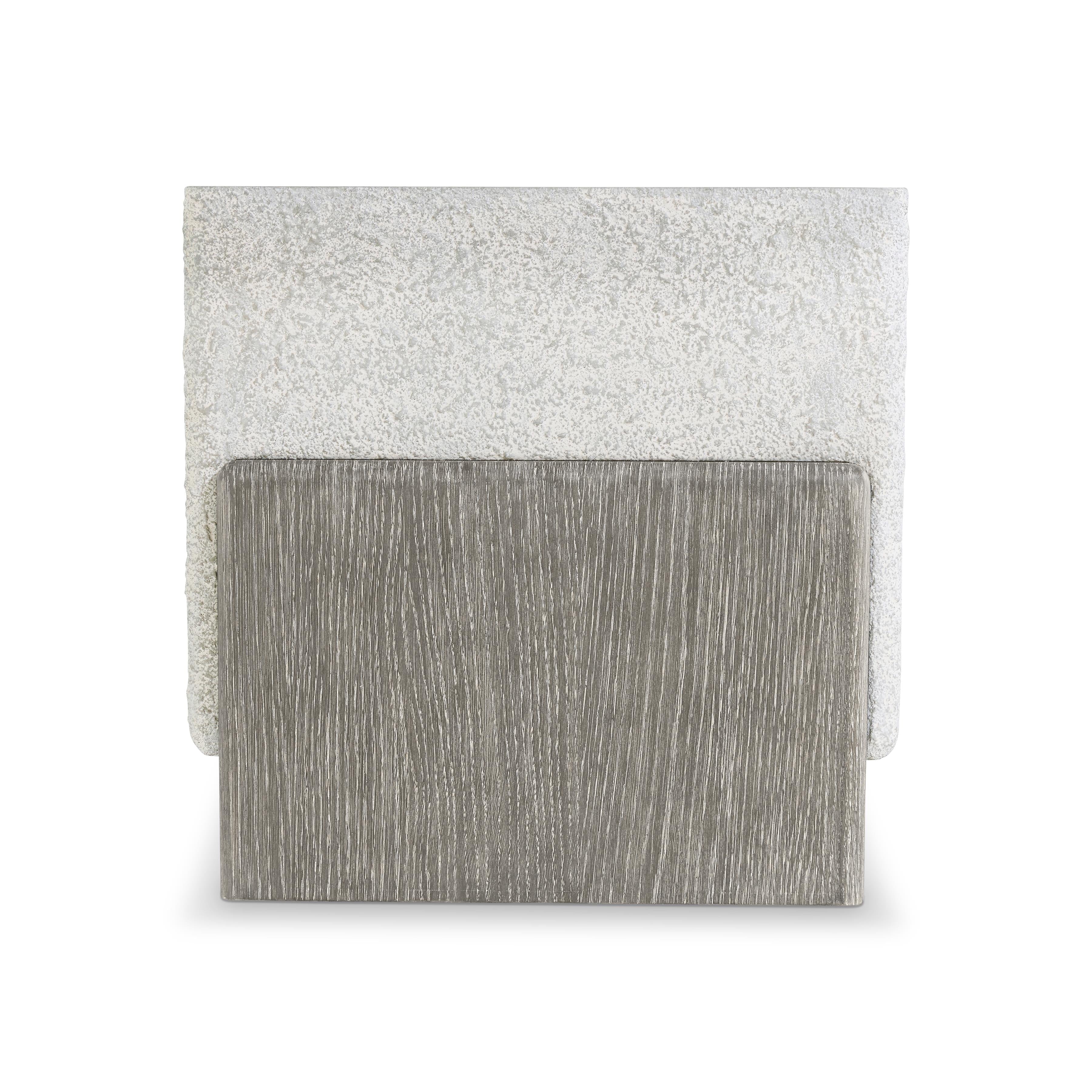 The Monolith side table showcases a bold design with a textured faux stone block nested in a wooden base. The top offers a smooth surface while the woodgrain is highlighted in a Puma finish on the base as it curves up to cradle two sides. It's a modern style with an organic inspiration.