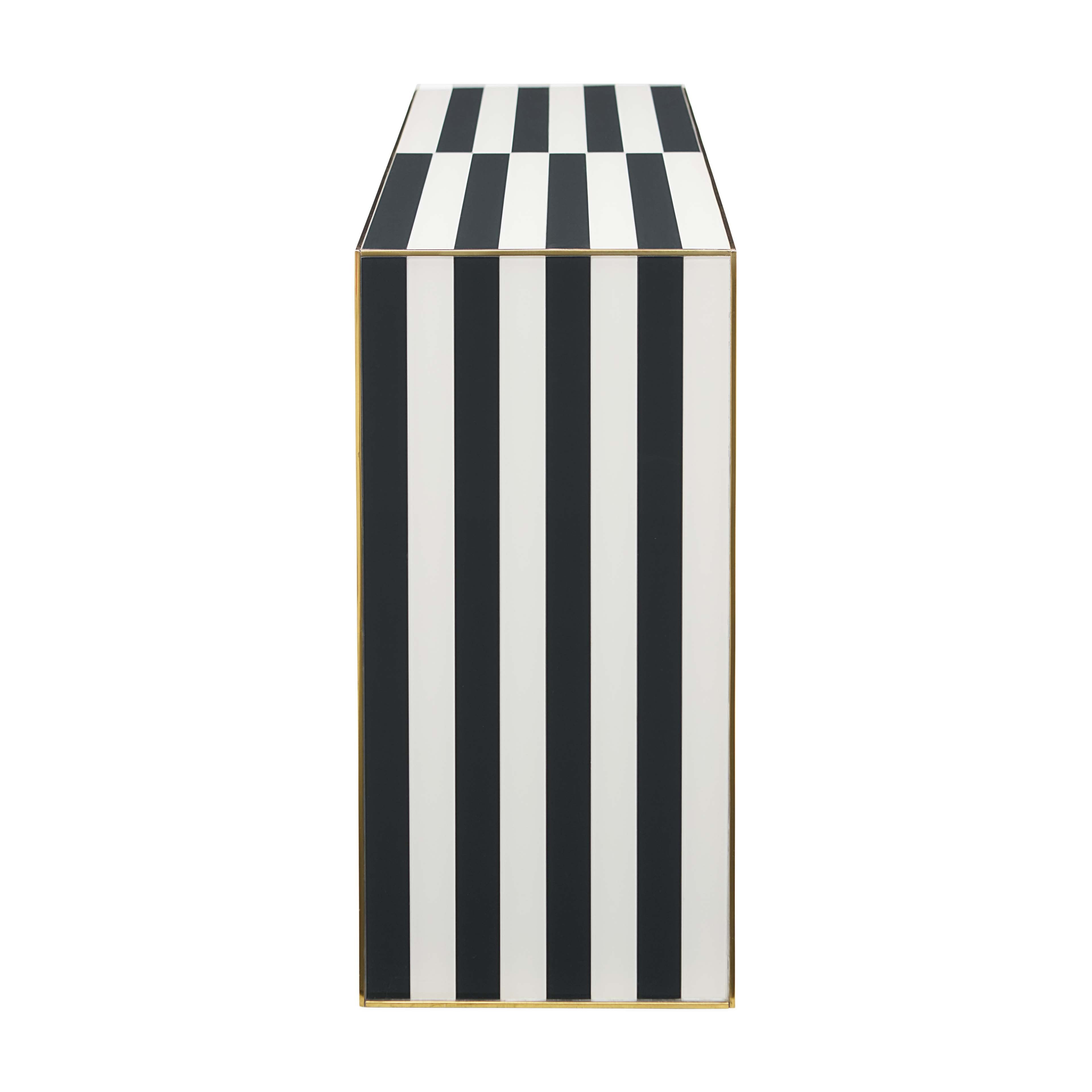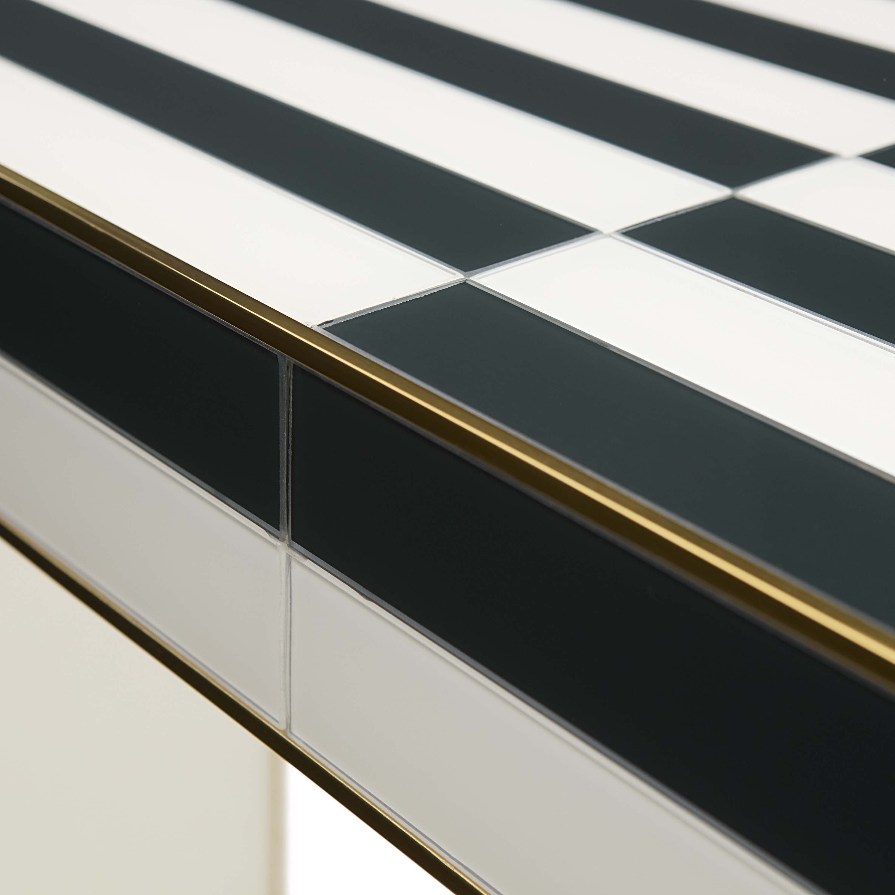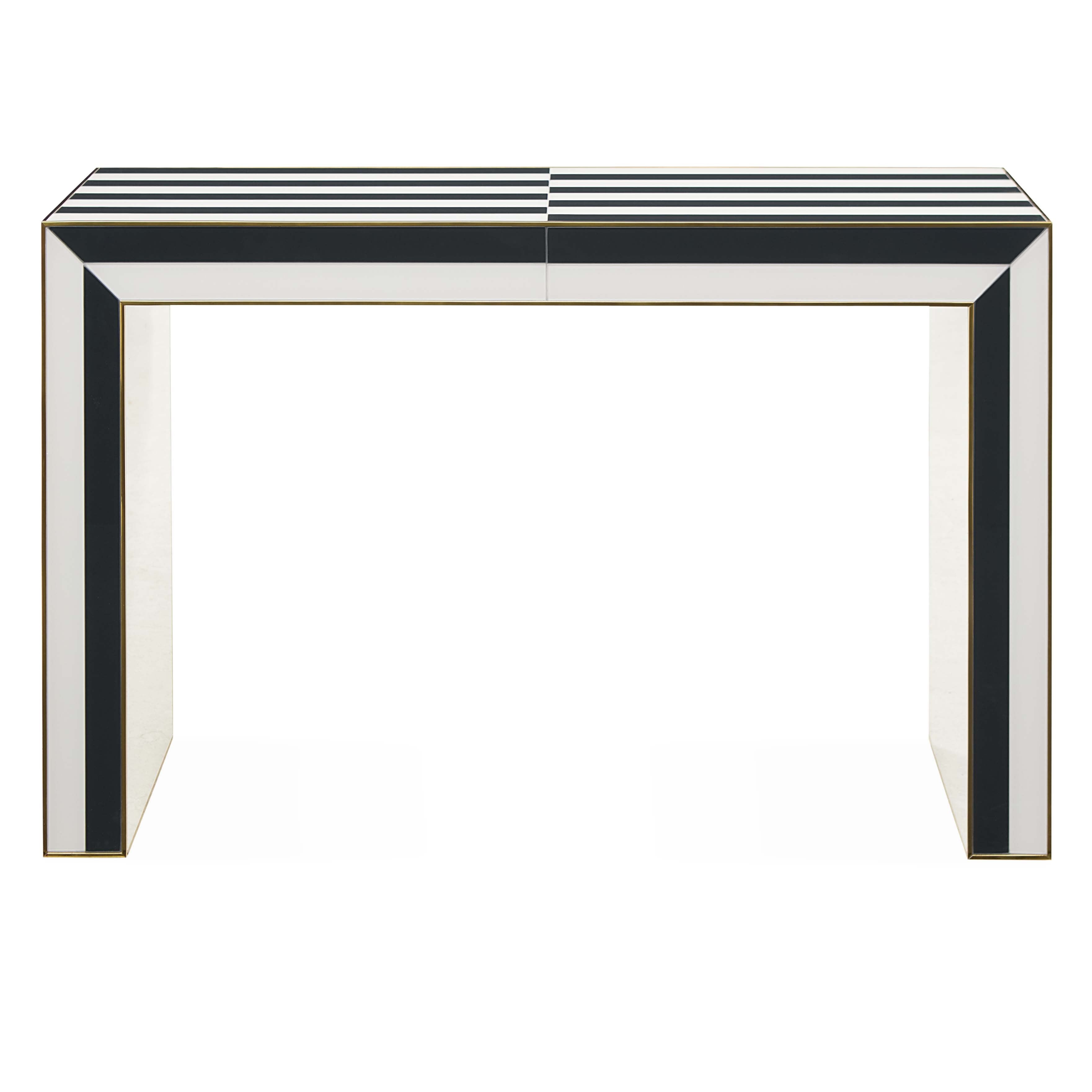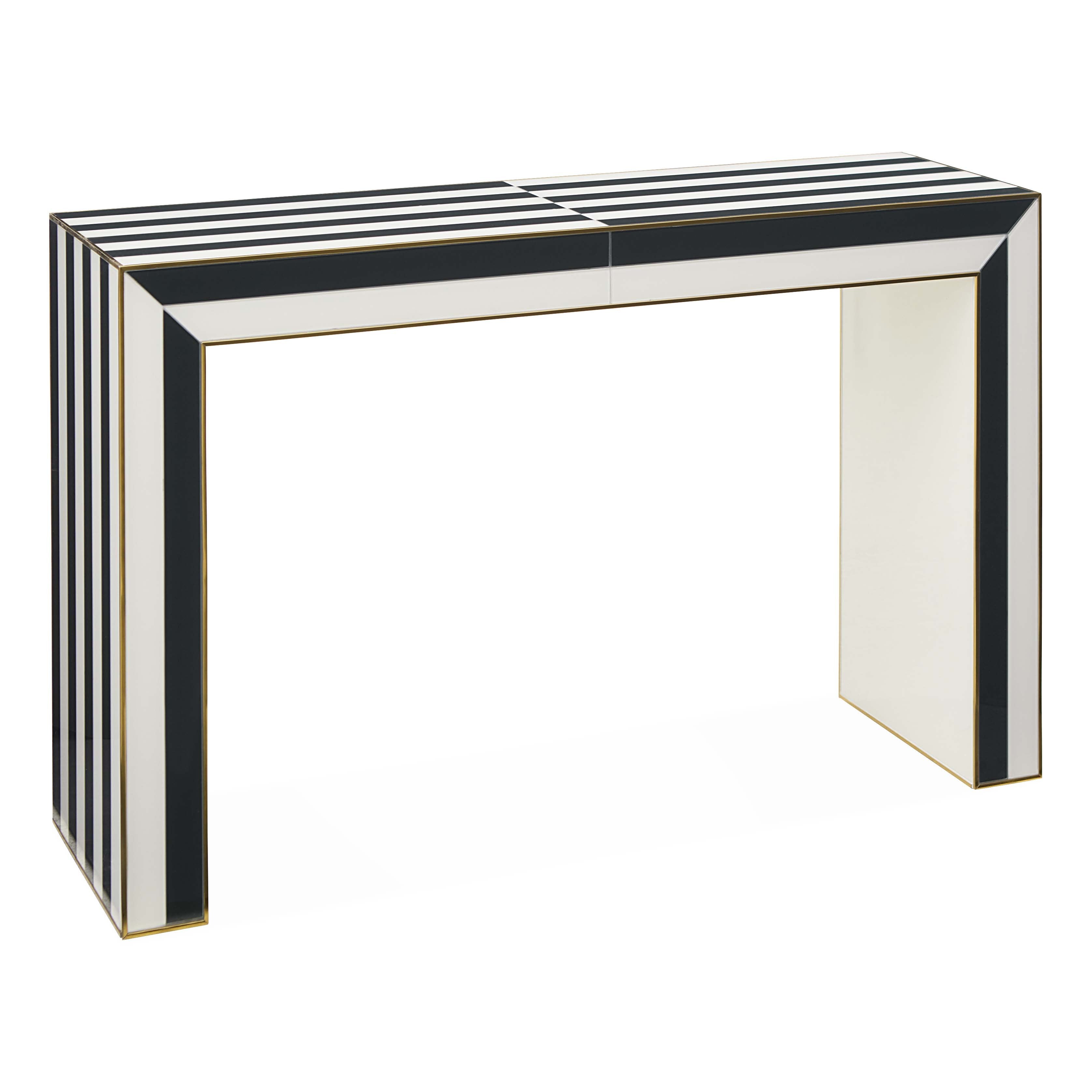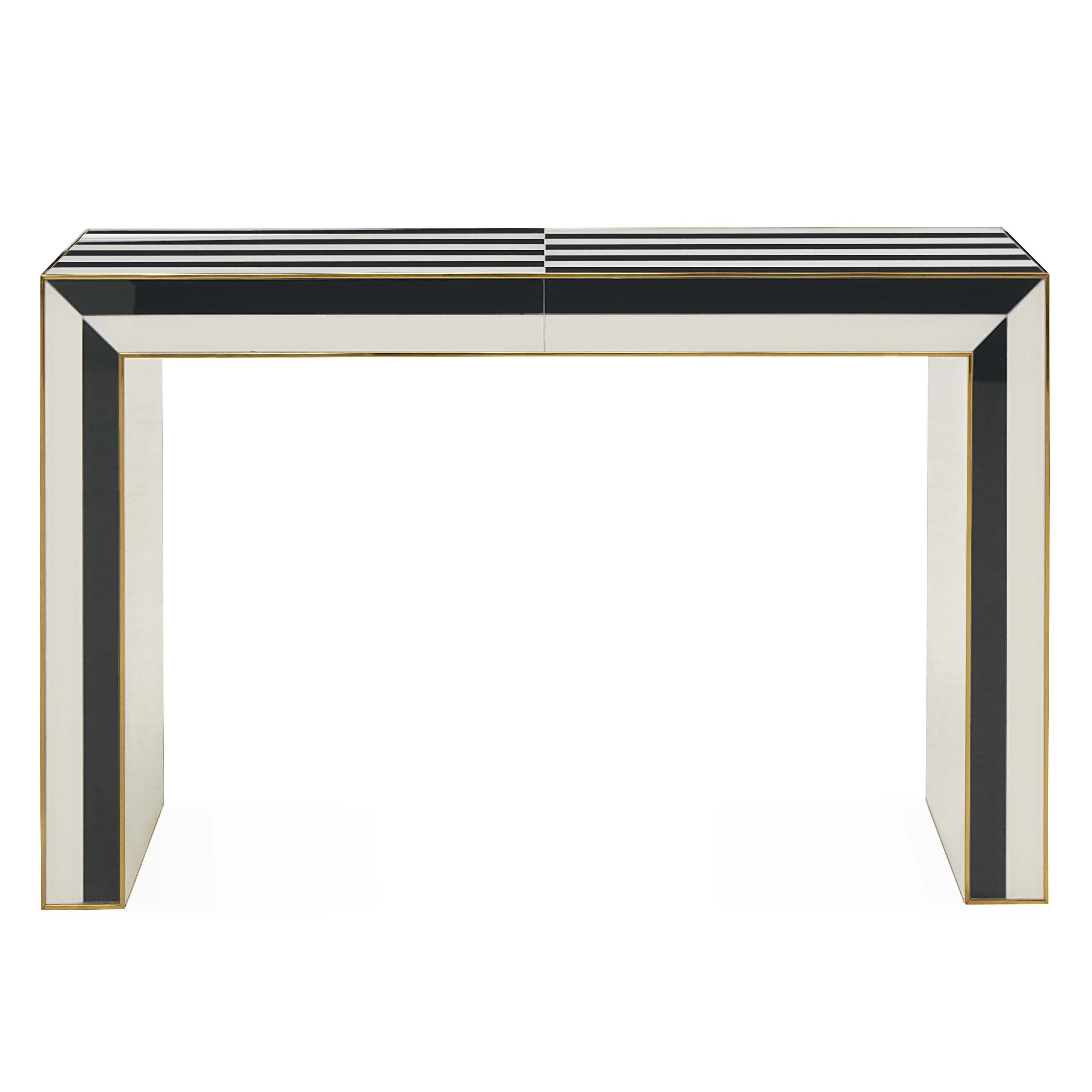 Mind-bending and modernist, our Op Art Waterfall Console features glass panes back painted in charcoal and ivory with polished brass edgebanding. A natural in both minimalist and maximalist abode, it's equally attention-getting in an edgy artiste's entry and behind a sofa in a chic neutral living space.