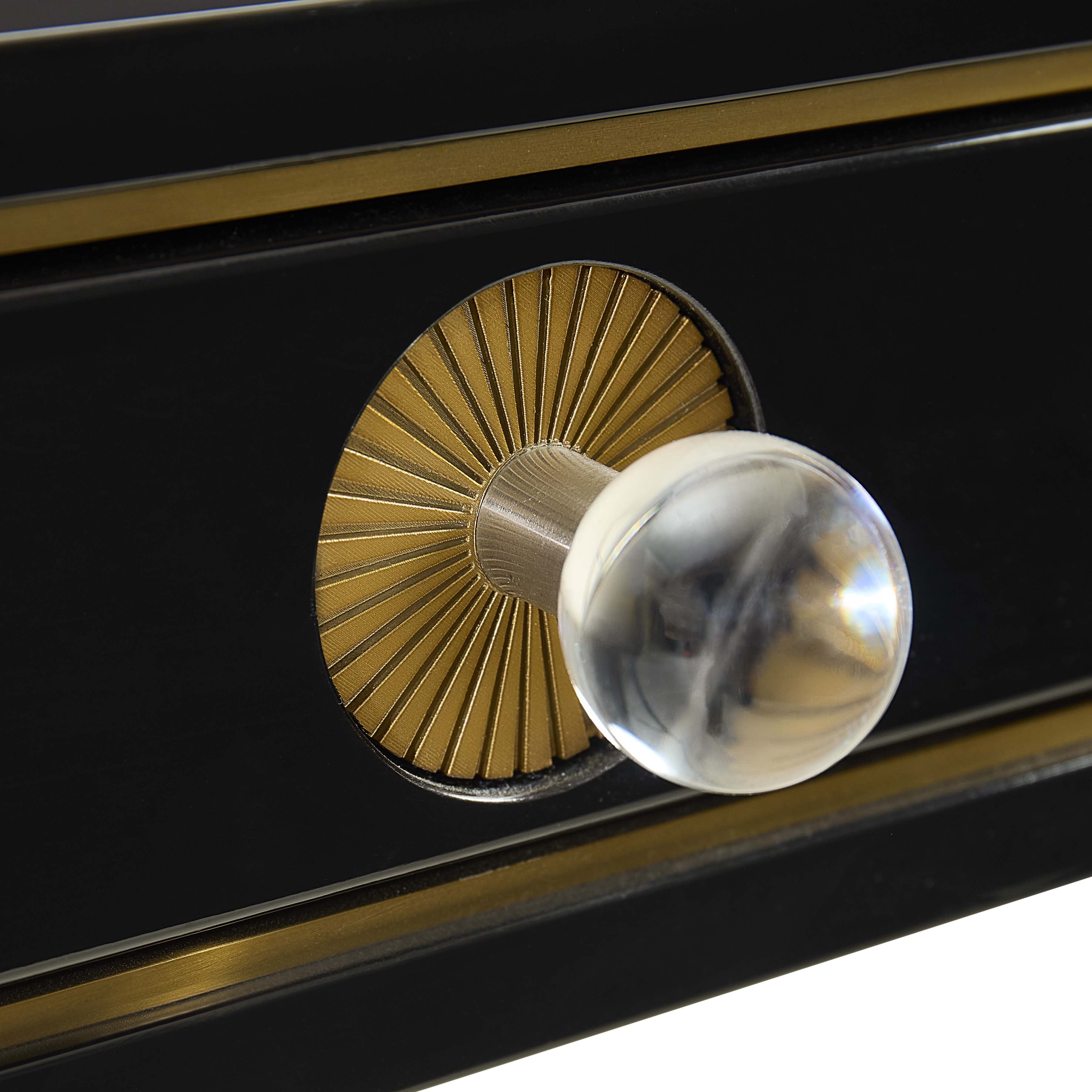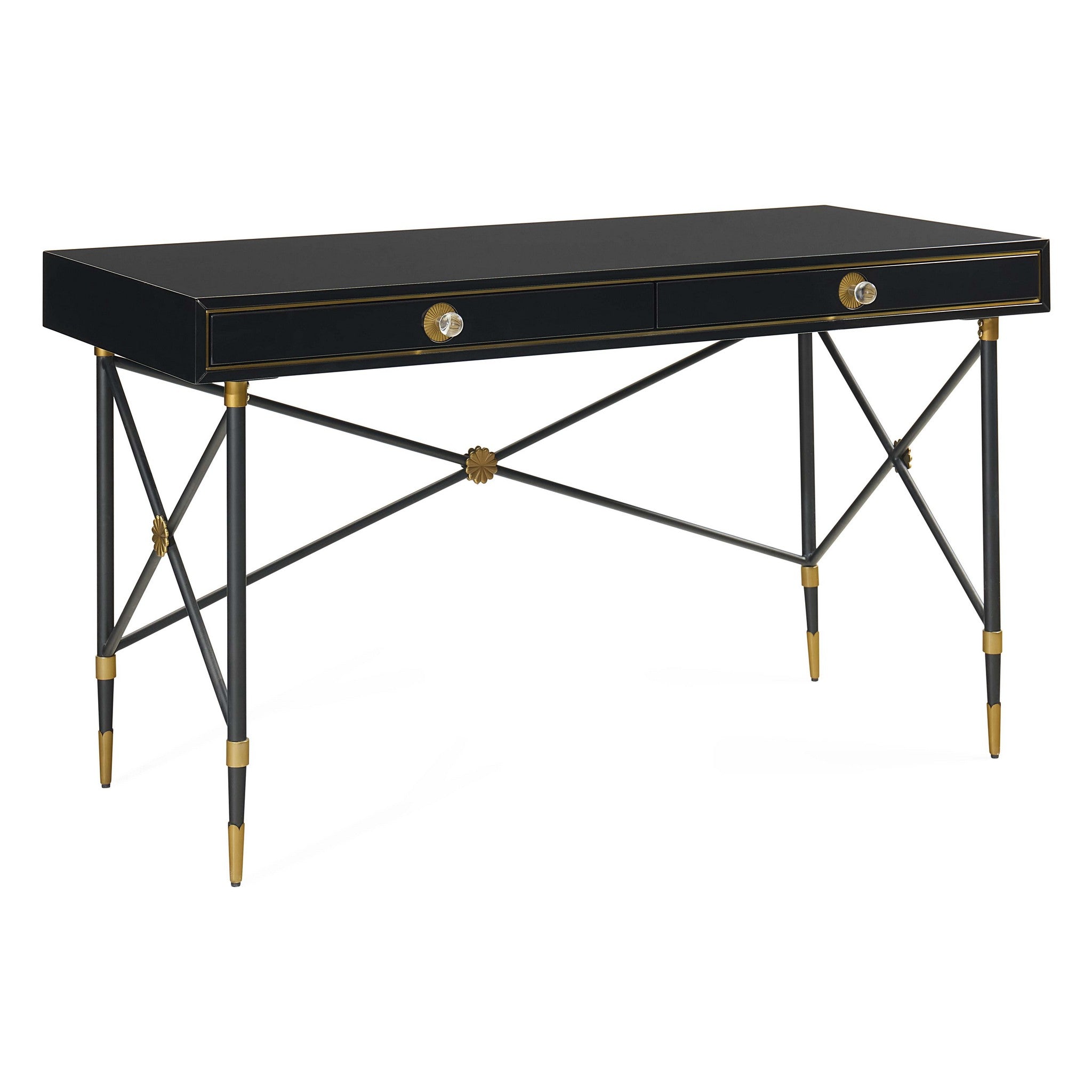 An updated take on French Empire style, our Rider Large Desk features a generously scaled black lacquer top and a blackened steel frame. Antique brass accents and luxe acrylic drawer pulls give every undertaking an elevated air. A decadent addition to any den or study. Featuring two drawers for stashing your bits and bobs.