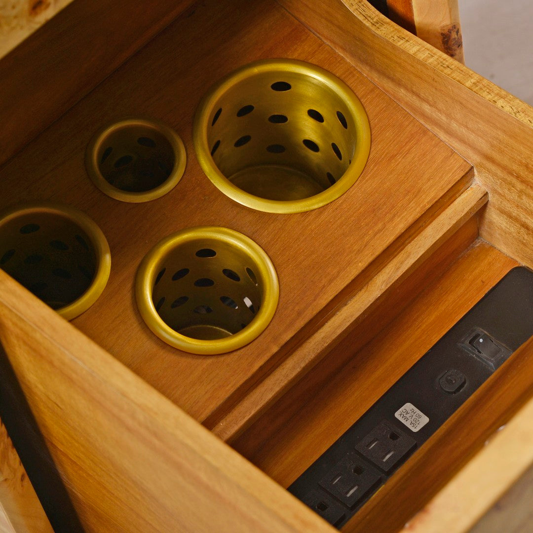 Our Roland Vanity features a smooth top with a beveled front face, a soft close, flip-top mirror that doubles as a work space when closed, seven various sized storage drawers, some including removable felt shelves for jewelry or makeup, a place for hot tool storage with a built in power strip for easy use, delicate brass hardware, tapered legs, and brass ferrules