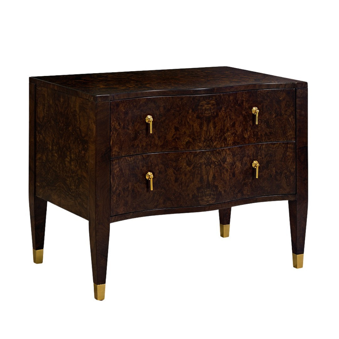 Our Serpentine Nightstand features a smooth top, a serpentine front, two equal size storage drawers, brass drop hardware, tapered legs, and brass ferrules
