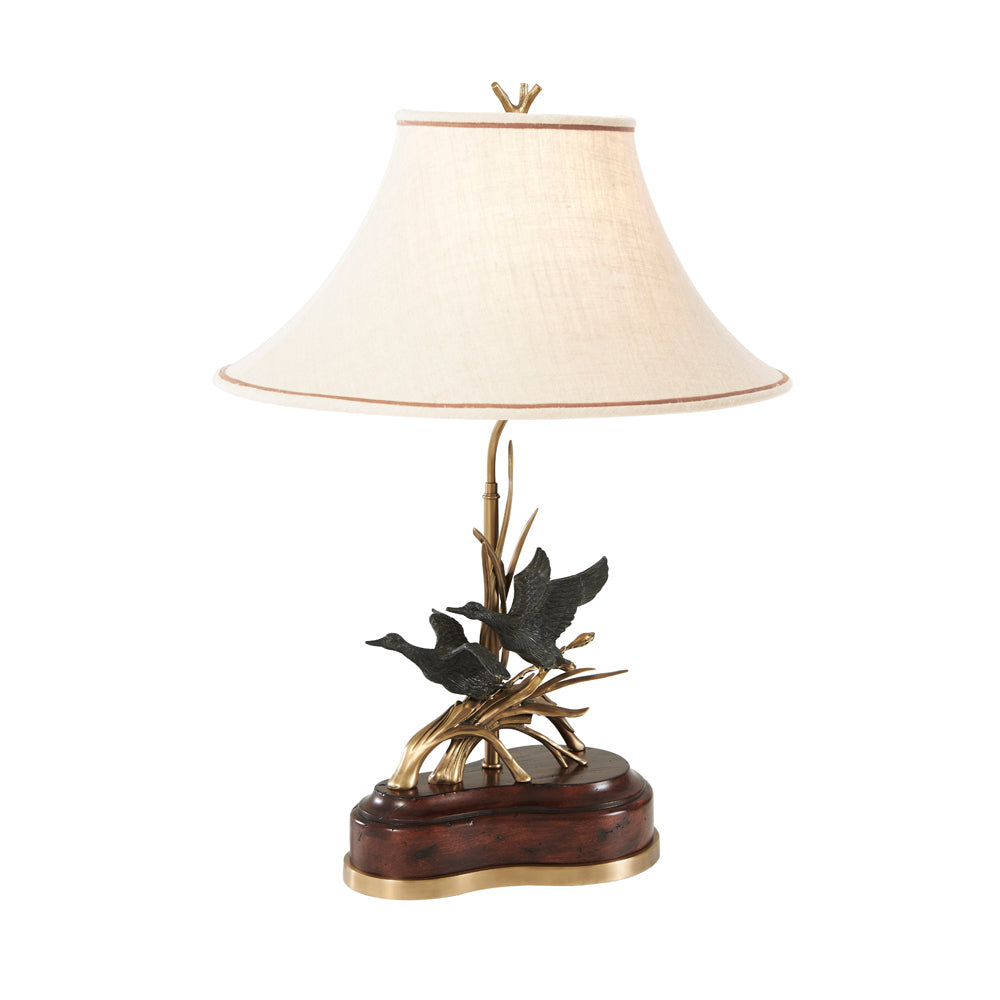 A finely cast brass and mahogany table lamp, the body of a cast polished brass branch with two verdigris brass flying ducks, mounted on a mahogany base and surmounted by a hand sewn shade and a branch cast finial.