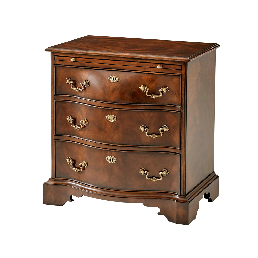 A flame veneered and mahogany bombé bedside chest of drawers, the rectangular moulded edge top above a brushing slide with three shaped serpentine and graduated drawers below, applied with finely cast brass escutcheons and drop handles, on a plinth base with ogee bracket feet. The original George III, circa 1770, in the manner of Thomas Chippendale.