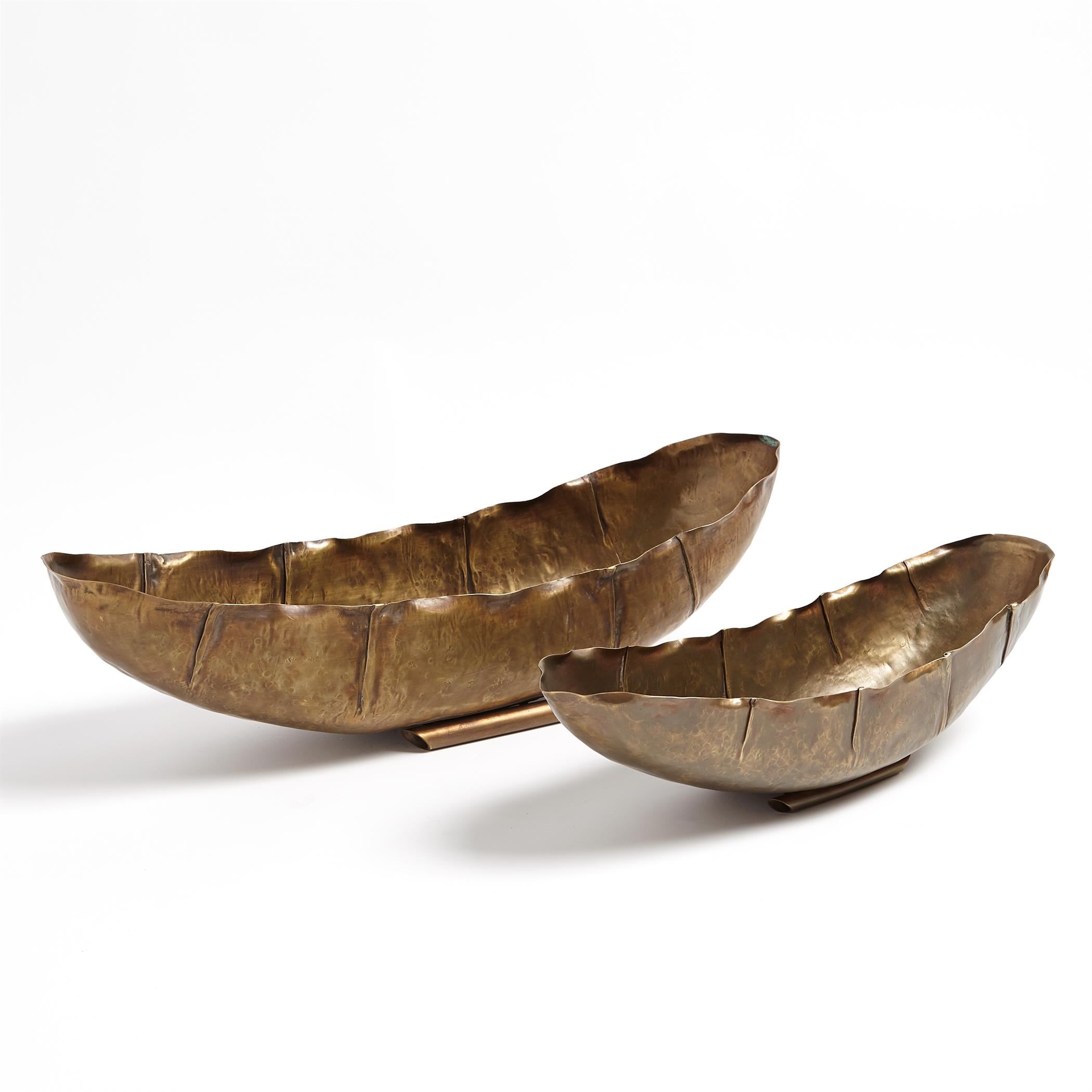 Crafted from brass with an antique finish, the Larkin Bowl is oblong in shape. Available in two sizes, this bowl is the perfect centerpiece for any sized table.
