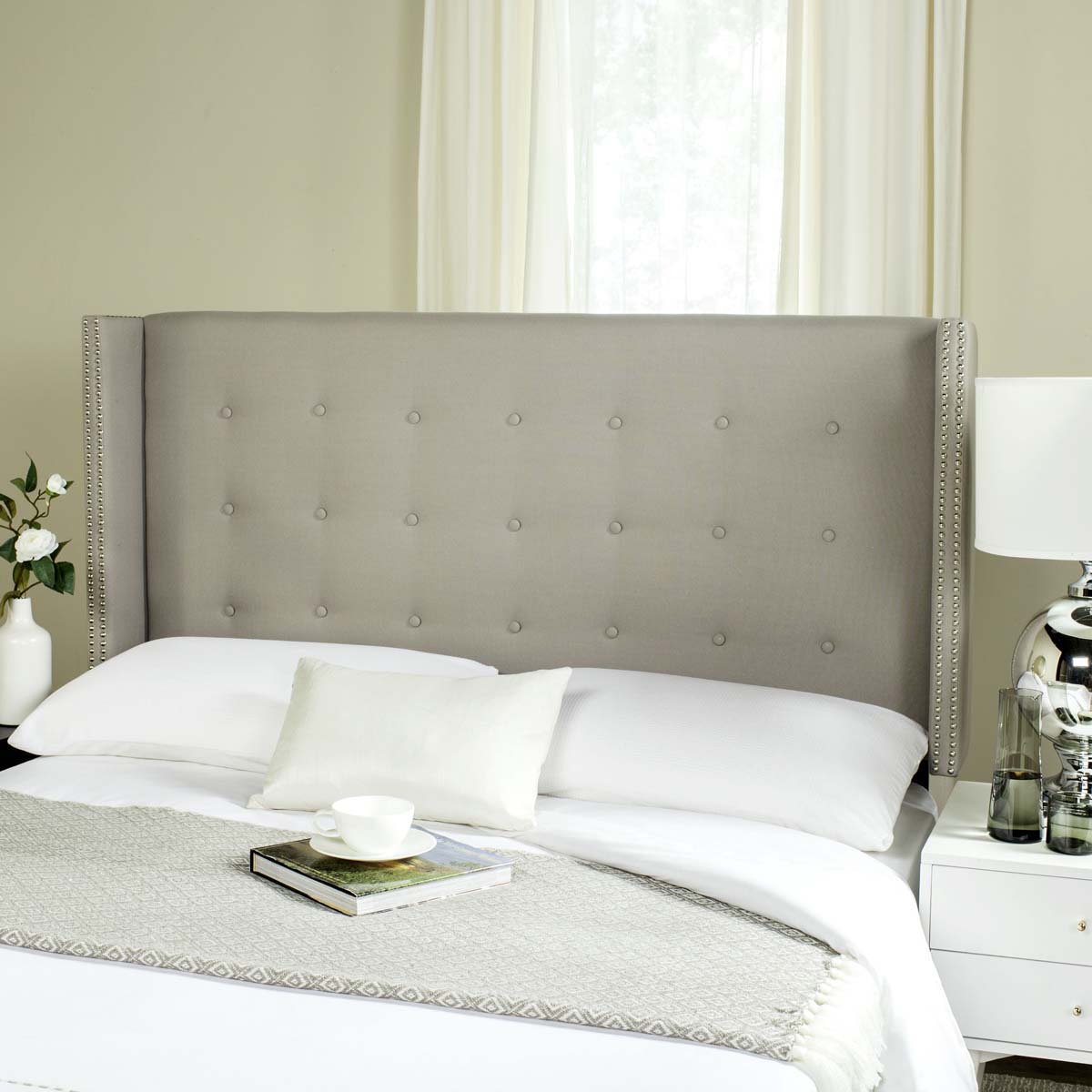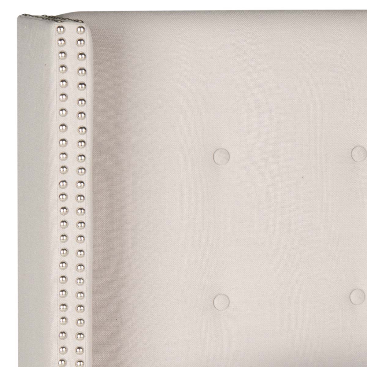 Streamlined yet brimming with designer details, the Keegan taupe linen headboard adds character to the master suite. Its rectangular form is softened button tufting, and its stylish wing sides trimmed with double rows of silver nailheads.,Streamlined yet brimming with designer details, the Keegan taupe linen headboard adds character to the master suite. Its rectangular form is softened button tufting, and its stylish wing sides trimmed with double rows of silver nailheads.