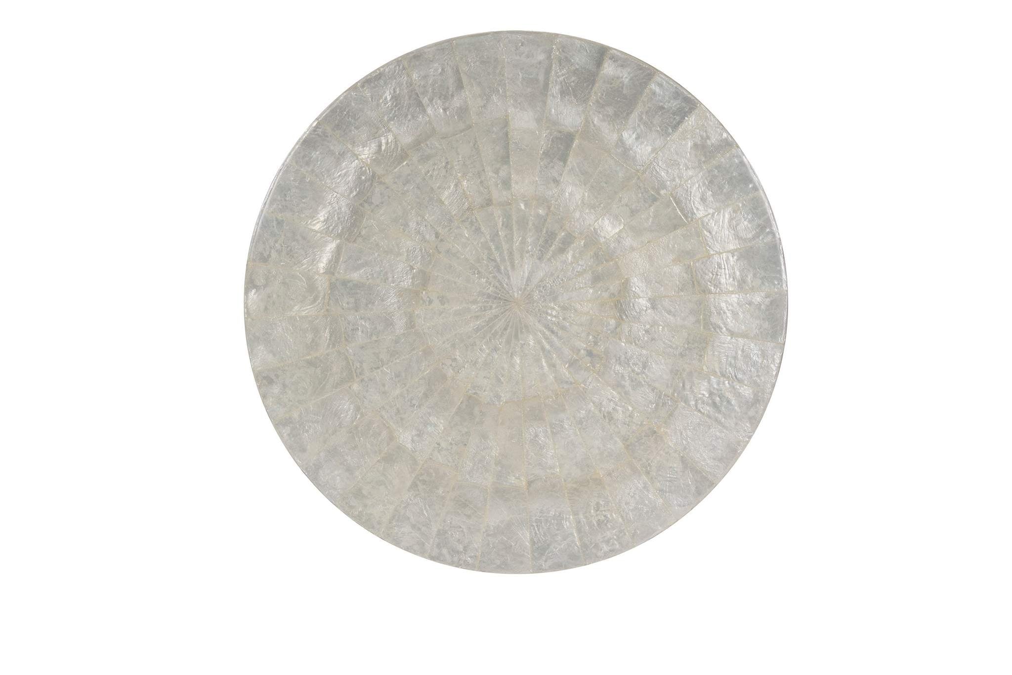 The Dario Side Table showcases a striking sunburst white capiz shell top that tapers dramatically to a narrow neck, accented with a solid brass band. Its base is crafted from solid gmelina wood and finished in a rich Truffle tone, creating a harmonious blend of texture and elegance. Only available as shown.