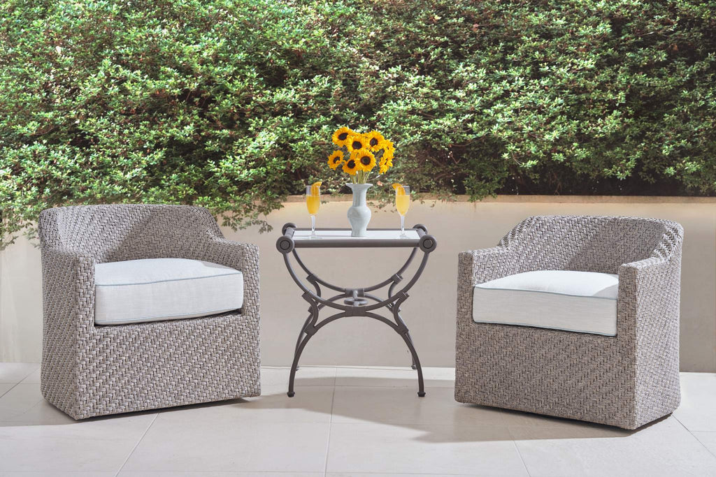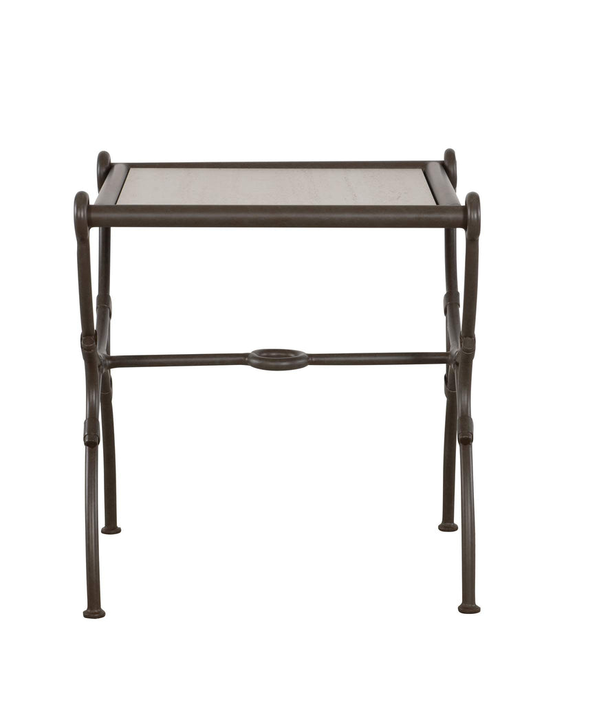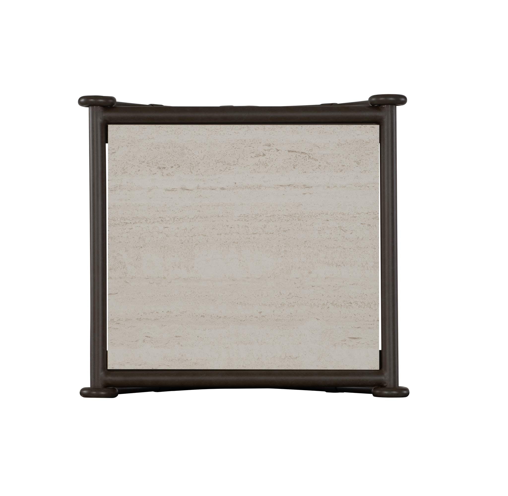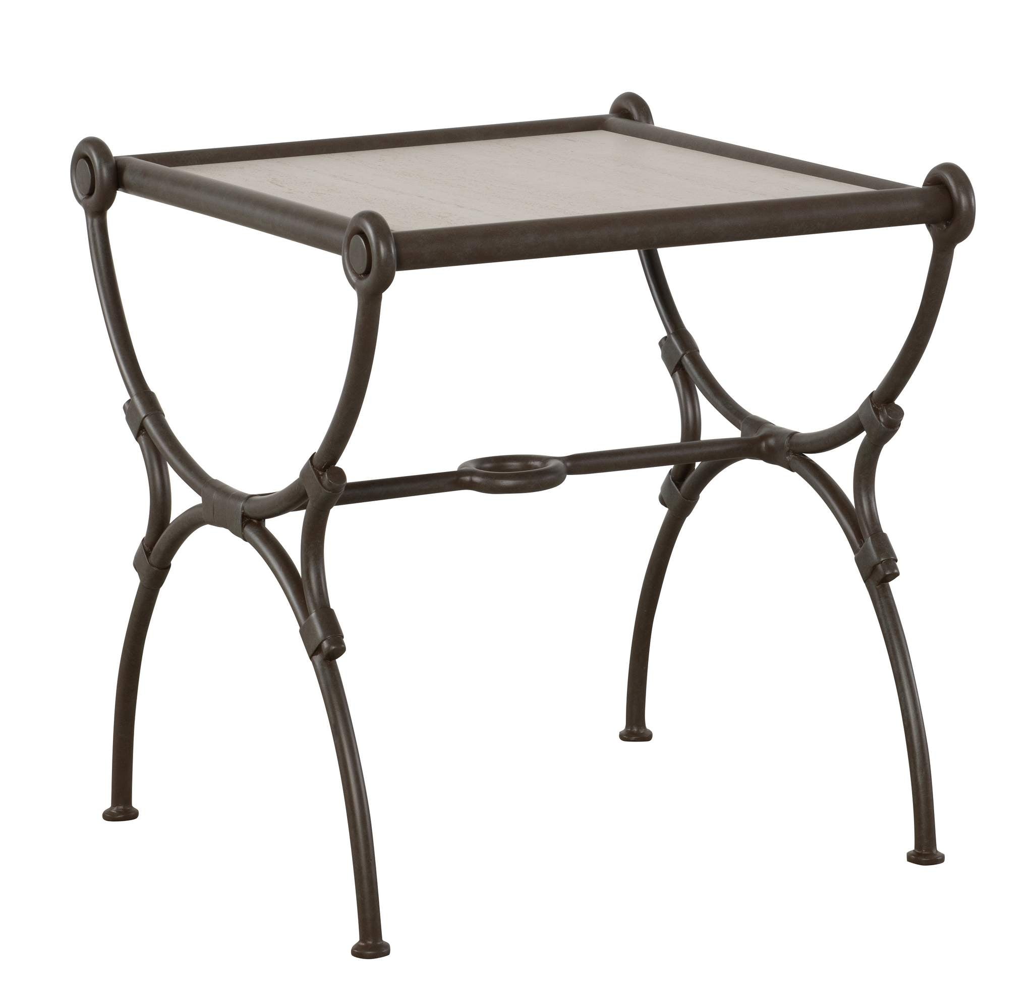 The Ibis Outdoor End Table and companion Cocktail Table are perfectly companions to the Ibis Outdoor Sofa and Lounge Chair. The Ibis series is made from cast aluminum and solids and is standard in Verdigris finish. The distinctive metal strap that wraps each joint was inspired by leather wraps that joined vintage rattan outdoor furniture. Ibis tables have a beautiful, state-of-the-art top that was inspired by Travertino Navona, a natural stone found near Tivoli, Italy. The material creates an ultra-compact, high-performance surface that is resistant to stains, scratches, extreme temperature and to UV rays. A custom fitted protective cover is sold separately as HCD8981-PC.