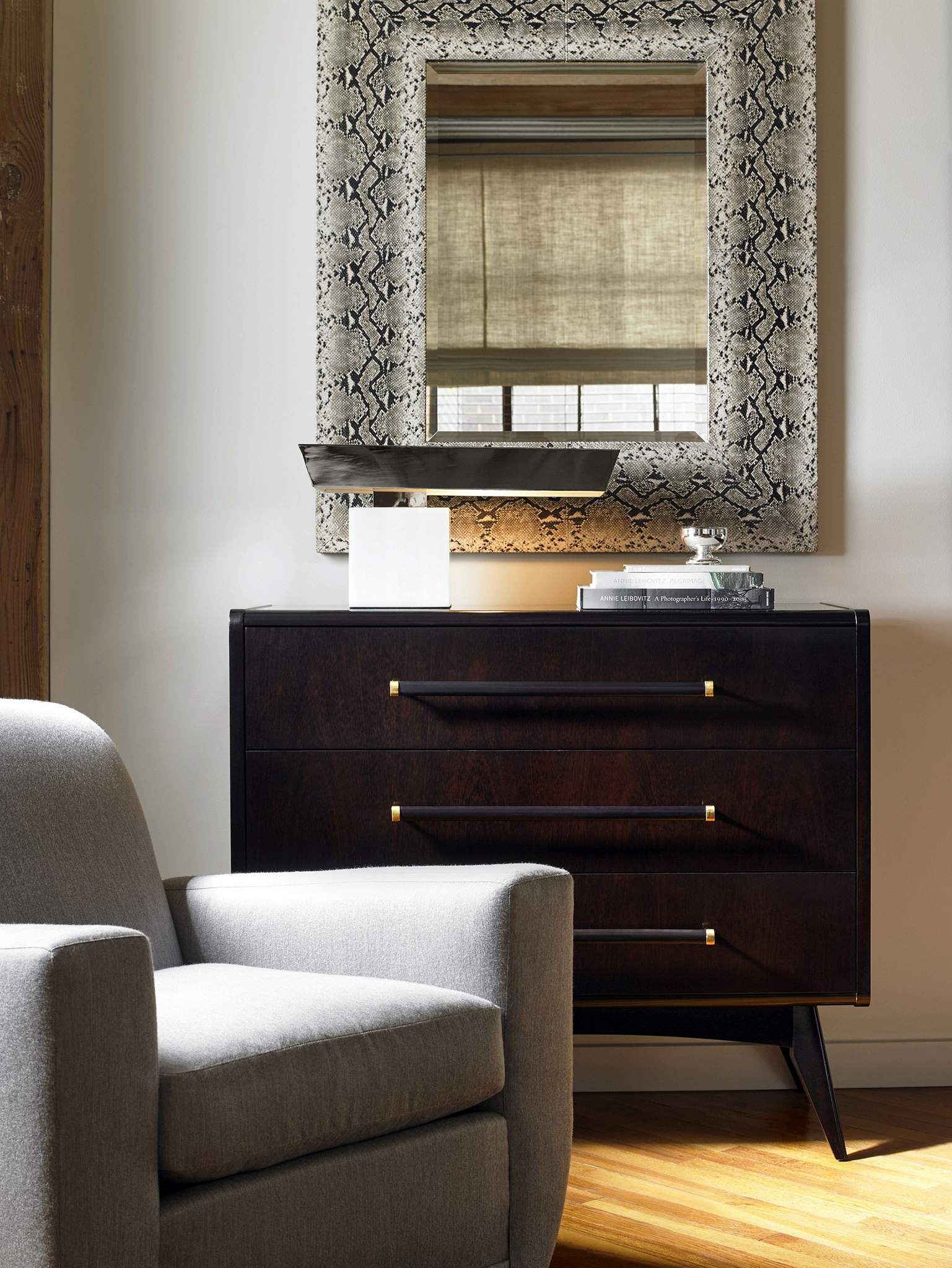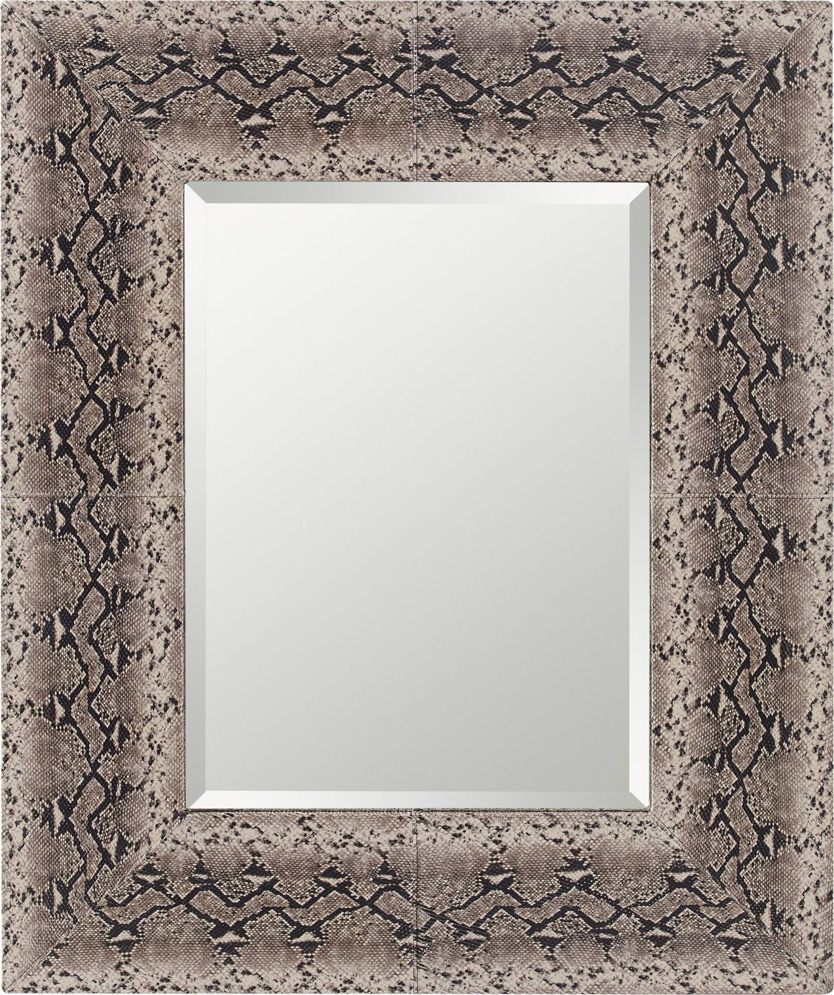 The Python Mirror is made from wood that has been upholstered in faux Python embossed leather that frames a clear mirror. It may be hung horizonatally or vertically.