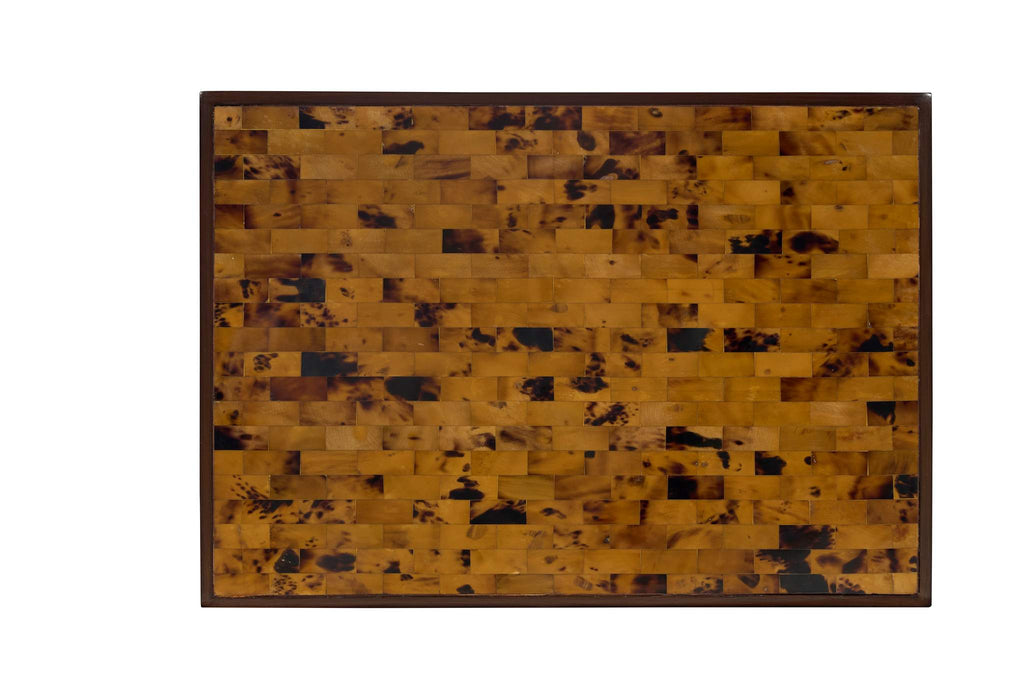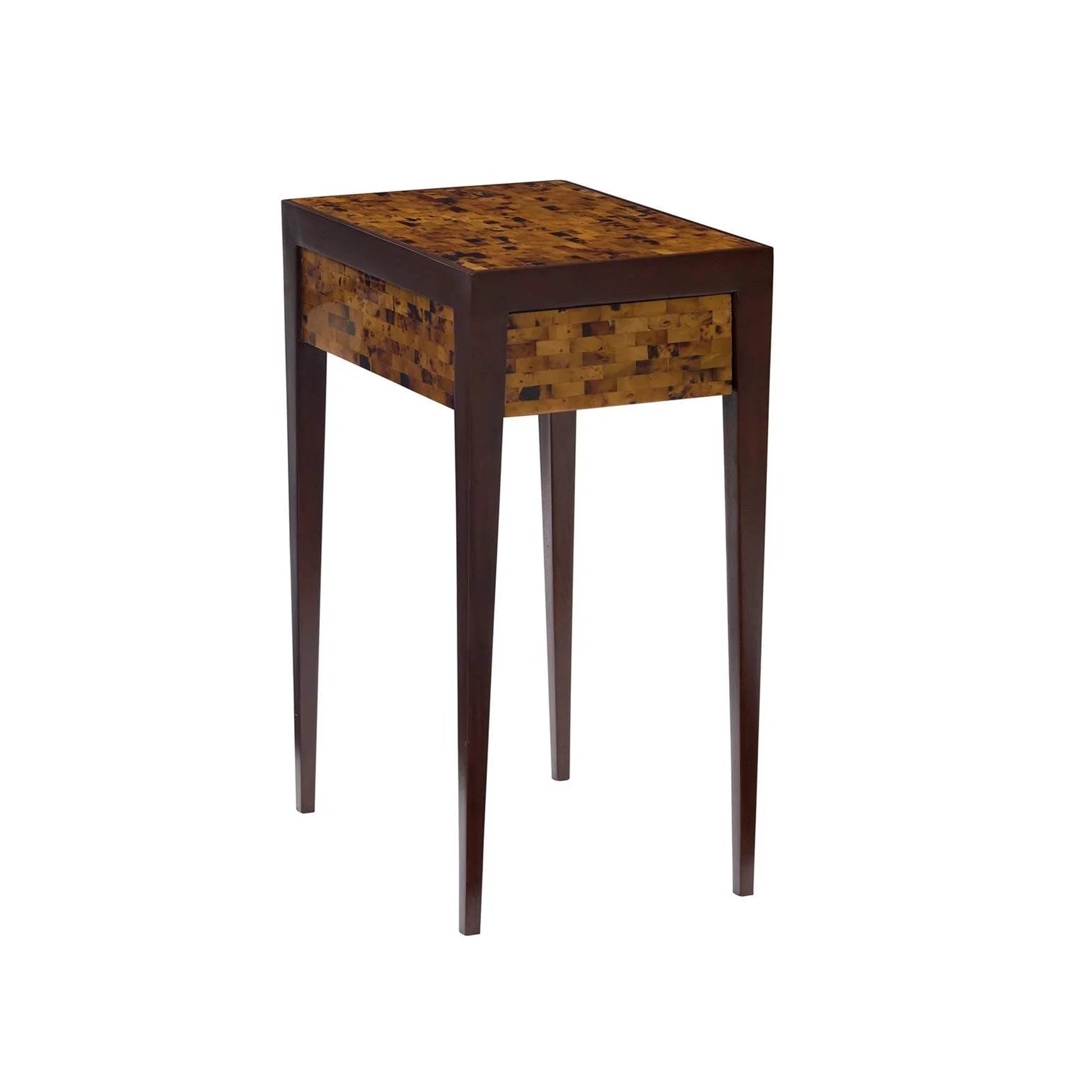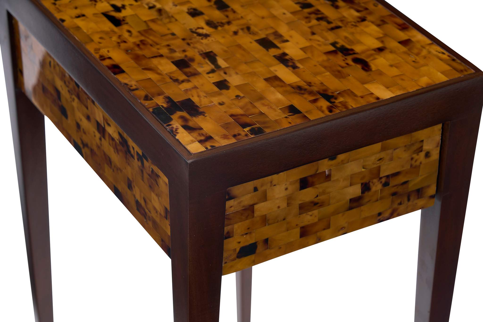 The Rufty side table is a petite table with a masculine flare, constructed of gmelina and beech wood solids finished in warm truffle stain with the top, sides and drawer front clad in young brown pen shell. Single drawer constructed beech solids, fitted with a wood glide. Only available as shown.