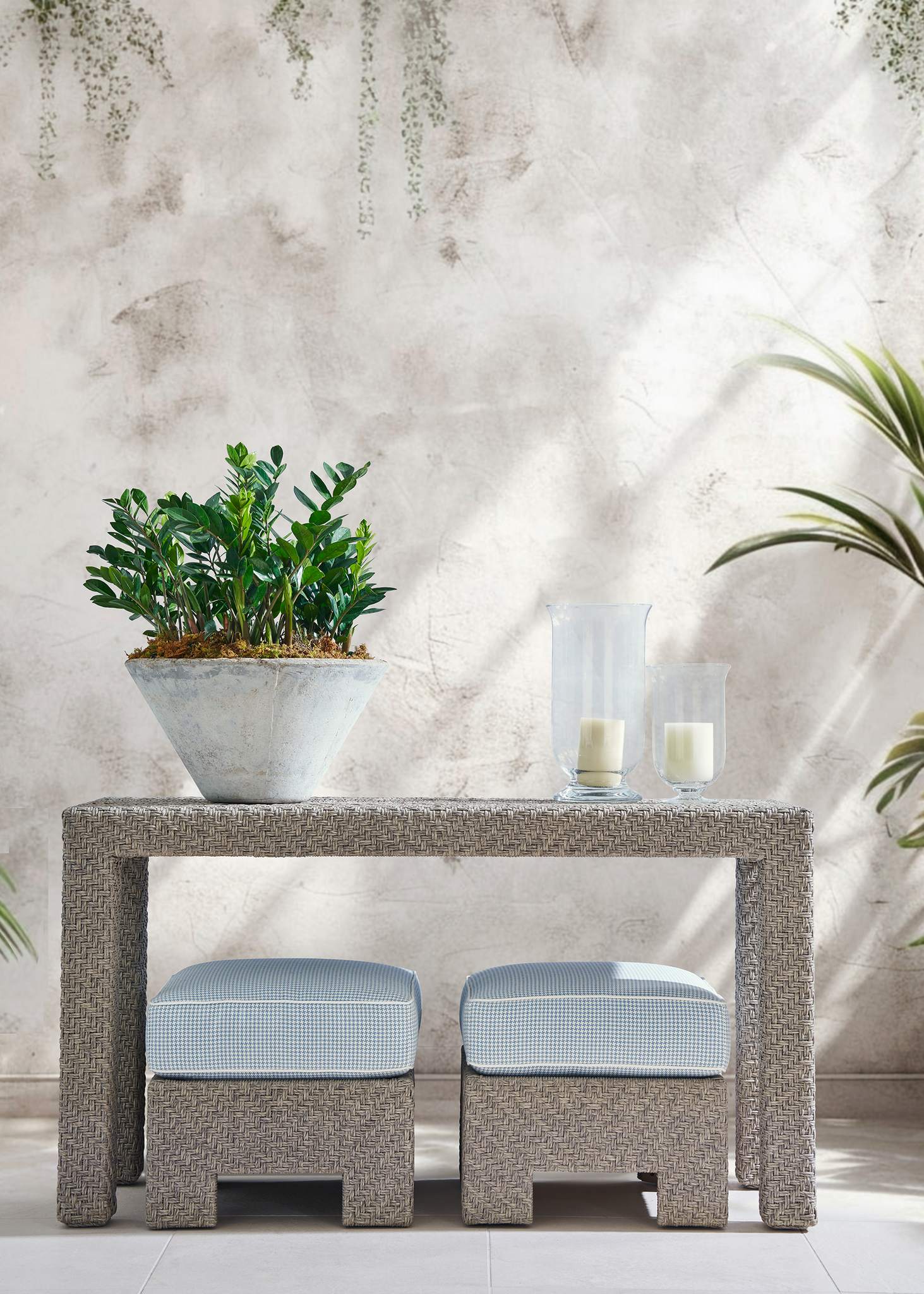The Yara Outdoor Console by Susan Hable and its companion Yara Square Stools are the perfect solution for outdoor living spaces. The Yara Console is functional as a bar or serving piece for hors d’ouevres or a buffet. The Yara Square Stools provide extra seating for guests. The stainless-steel frame is wrapped in woven in synthetic fiber, an environmentally friendly material that is non-toxic and is recyclable, in a proprietary Graystone Weave finish. A custom fitted protective cover is sold separately as HCD8891-PC.