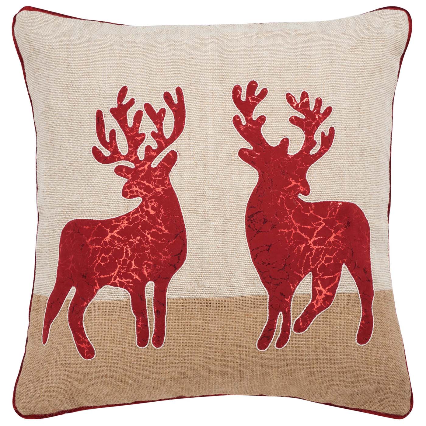 Delightfully designed for today's rustic-chic homes, this Holiday Reindeer Pillow kicks off the season in style. Two sparkling reindeer silhouettes awaiting Santa's orders are beautifully displayed over a two-toned natural cotton backdrop, while complimentary brown piping completes the look.