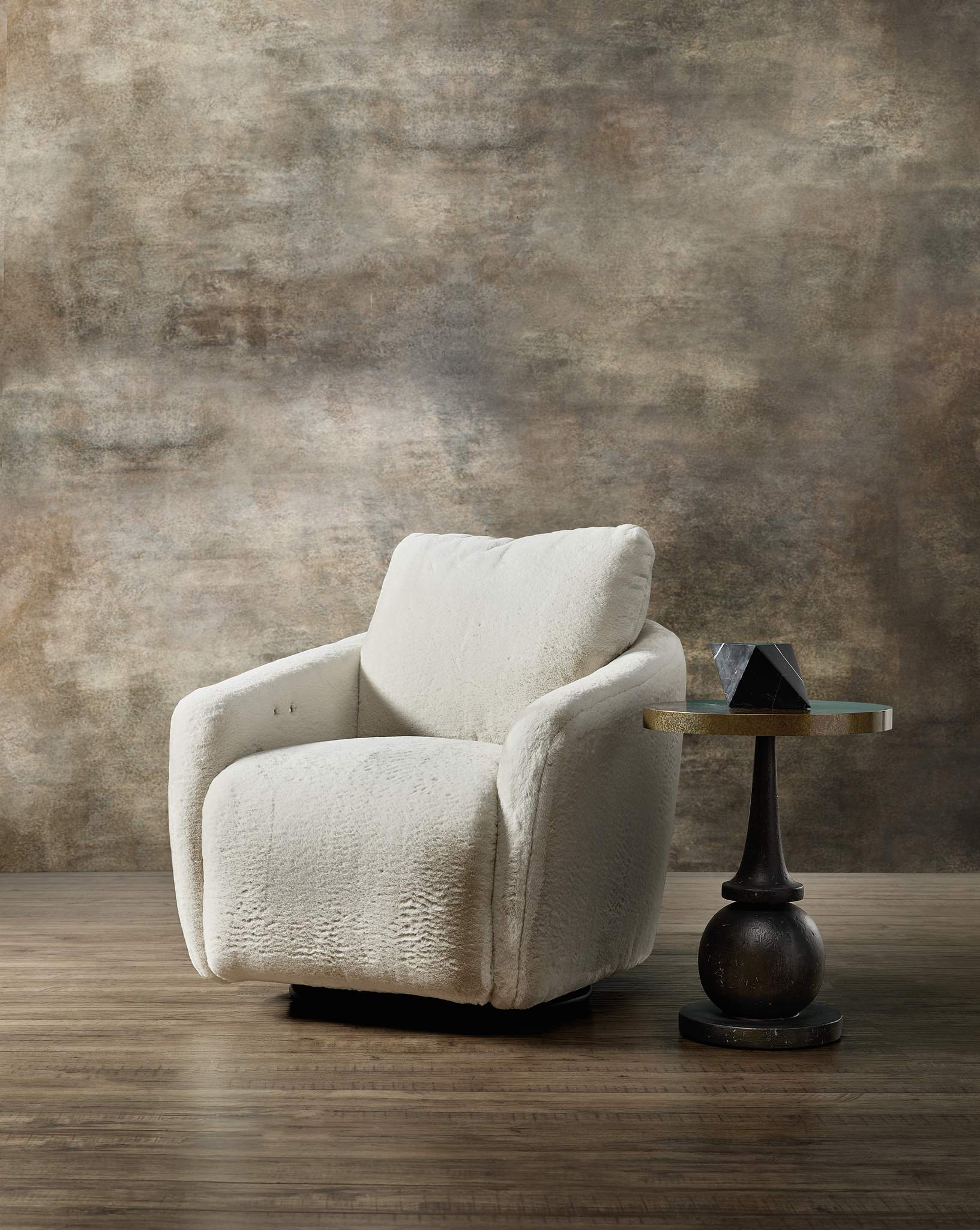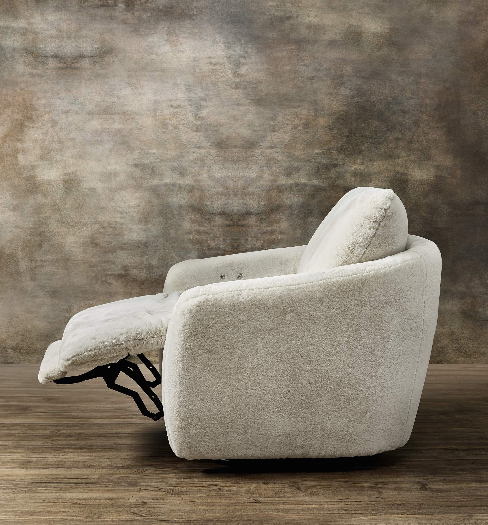 The Bonnie Swivel Chair features a petite, modern design with the added luxury of a power footrest. Upholstered in soft, faux fur fabric, it provides ultimate comfort while maintaining a sleek and stylish appearance. Ideal for cozy living spaces, this chair blends style, comfort, and functionality effortlessly.