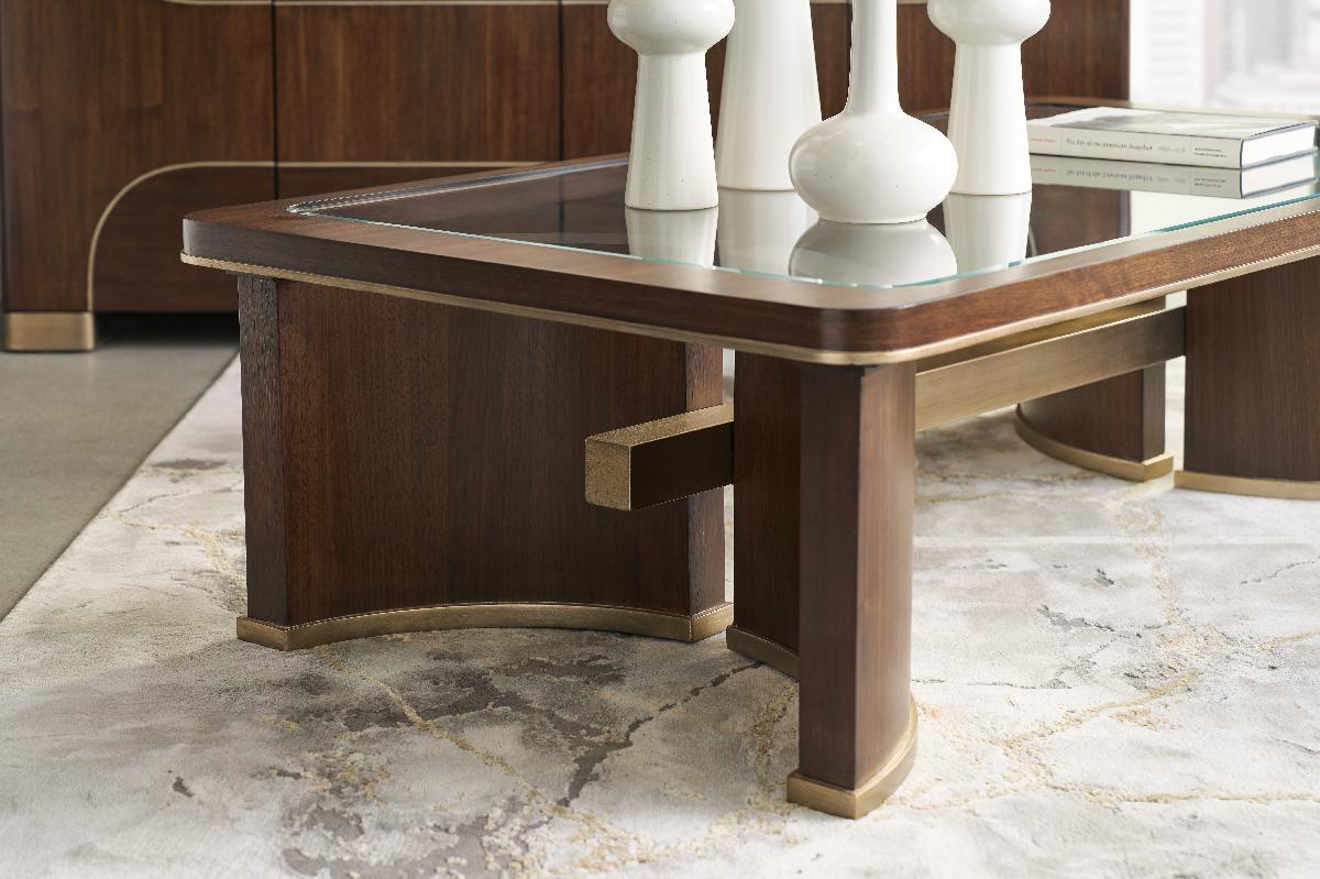 Classy and timeless, the Contours Cocktail Table combines Walnut Veneer, champagne accent trim and a white tempered and beveled glass insert on the wood-framed top. With champagne-finished accent trim, legs and a stretcher, it has a rectangle shape and measures 66 inches wide by 36 inches deep.