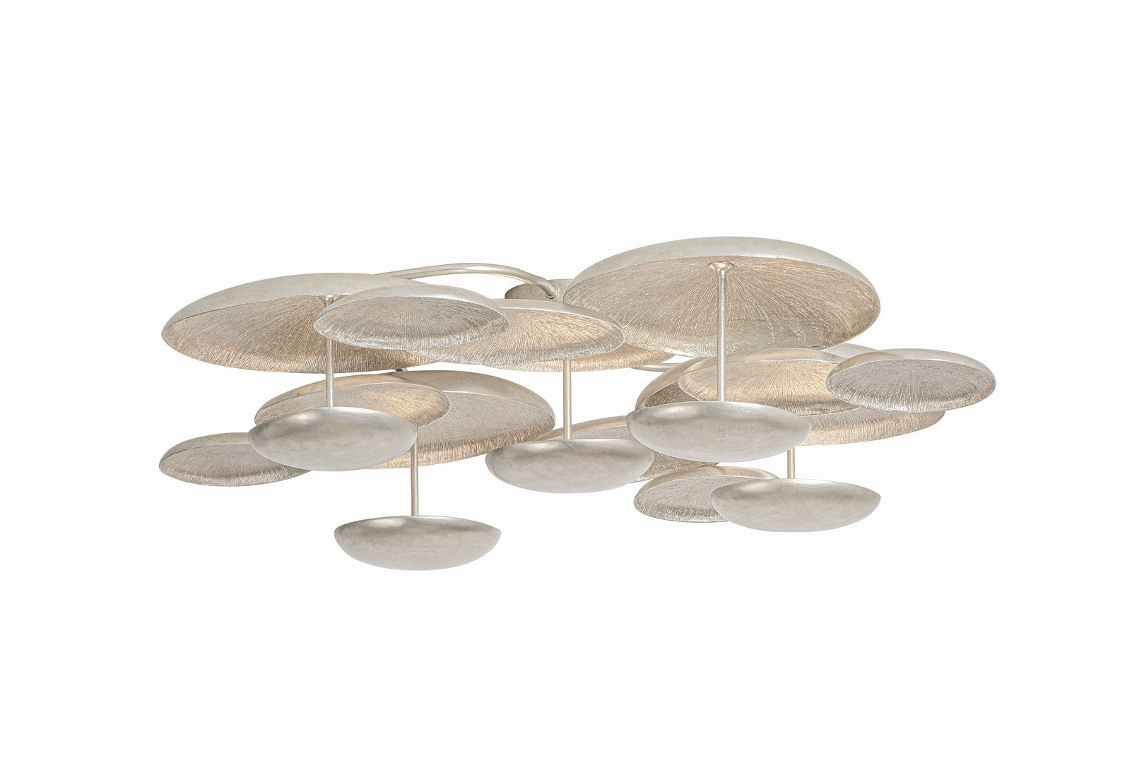 A close-to-ceiling fixture, the Fistral semi flush mount celebrates smooth, flowing shapes through its balanced, sculptural composition. Rounded metal discs are organized in an organic formation, creating a multi-dimensional layered effect. Finished in textured Warm Silver Leaf, the discs catch and reflect light from the integrated LED to produce an ambient glow. This stunning statement piece is available in two sizes.