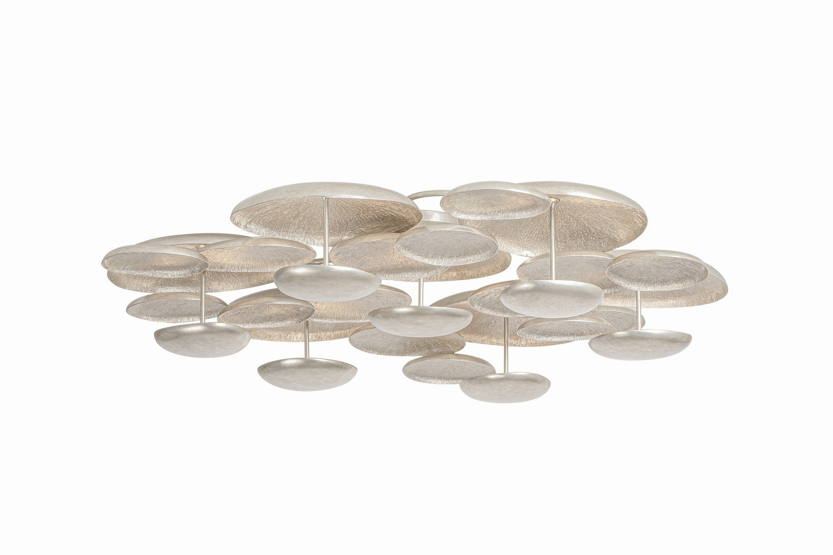 A close-to-ceiling fixture, the Fistral semi flush mount celebrates smooth, flowing shapes through its balanced, sculptural composition. Rounded metal discs are organized in an organic formation, creating a multi-dimensional layered effect. Finished in textured Warm Silver Leaf, the discs catch and reflect light from the integrated LED to produce an ambient glow. This stunning statement piece is available in two sizes.