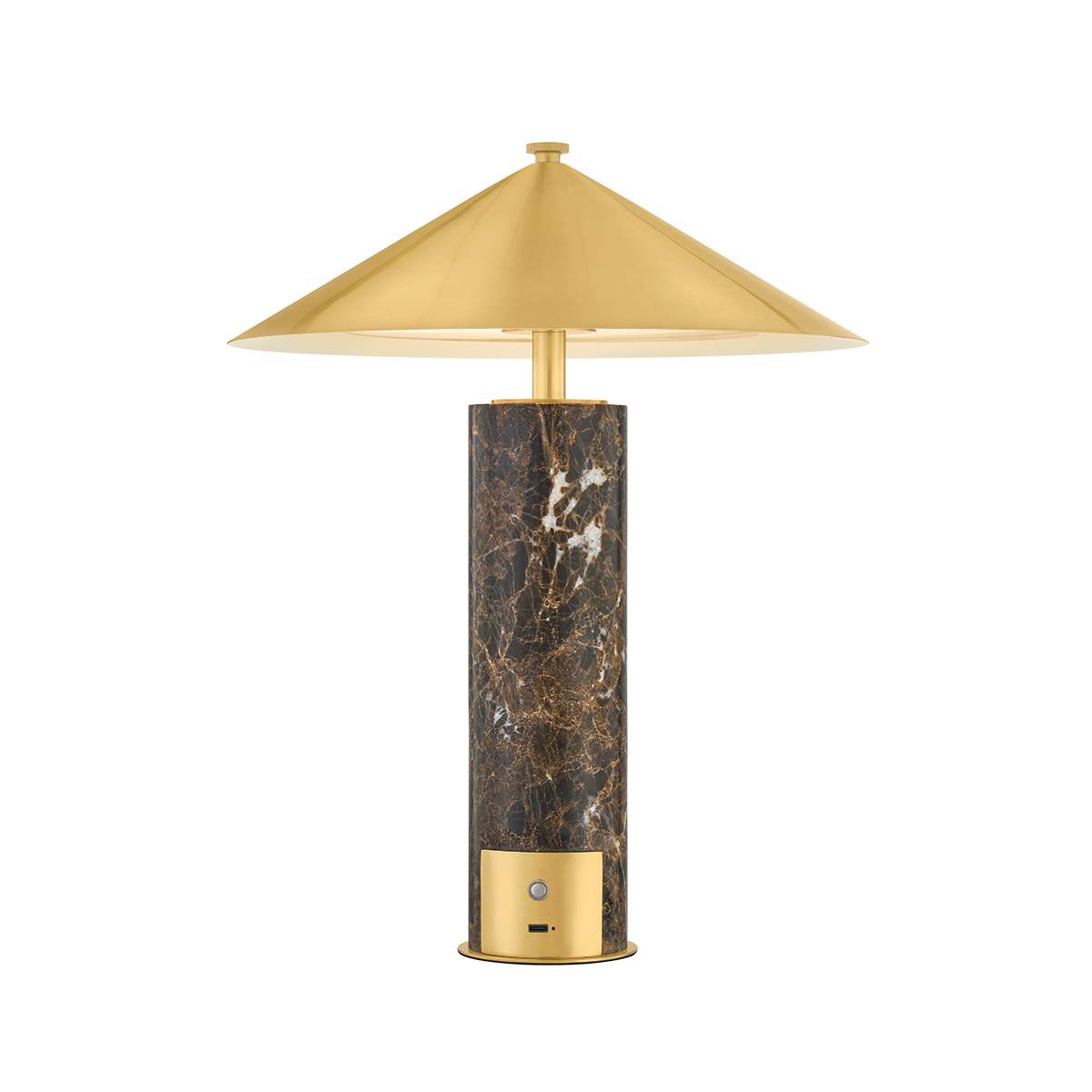 While compact in scale, the Permont table lamp makes a design-forward statement. This LED lamp’s sharply tapered metal shade is finished in Aged Brass with a luxurious honed Emperador marble base. The natural veining of the stone comes to life when illuminated, giving this piece its one-of-a-kind beauty.*Due to the one-of-a-kind nature of the medium, exact colors and patterns may vary slightly from the image shown.