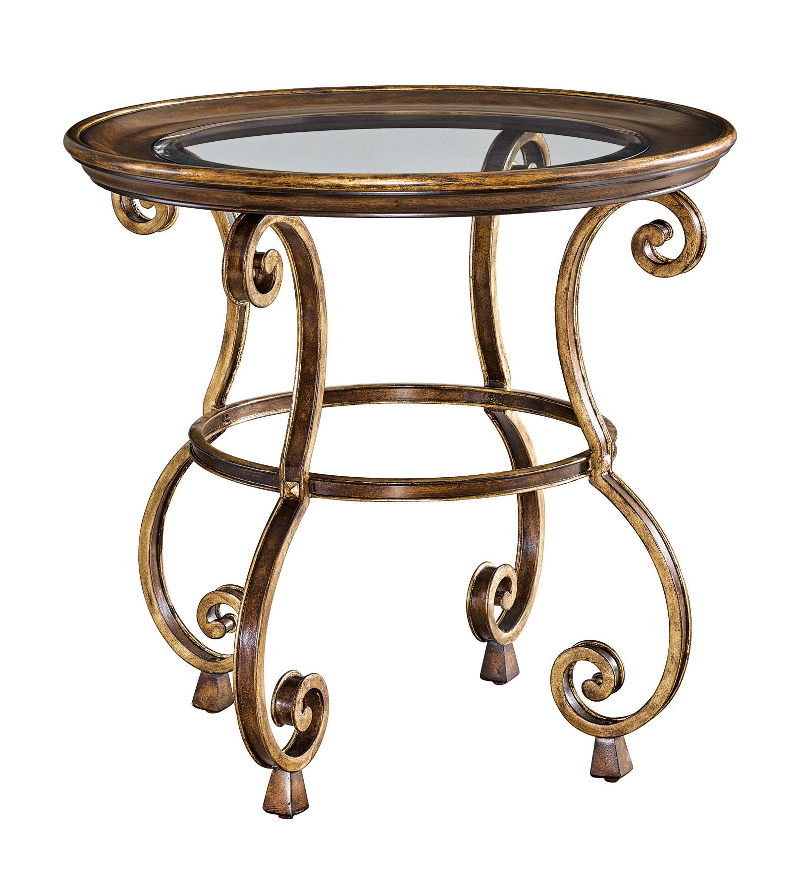 Steel Base frame with Aged Gold detail, supports a Clear Glass top wrapped in Mahogany Wood support. Mahogany finished in Aria with Aged Gold trim.
