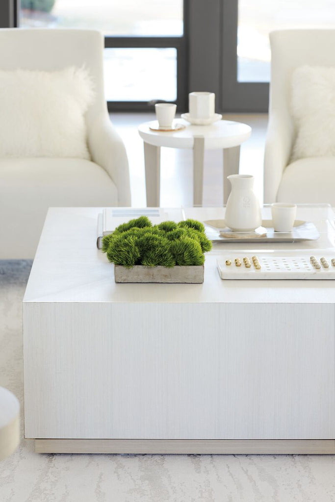 Ground your room in light and warmth with our Axiom Square Cocktail Table. The triangular grain pattern is in full effect, spreading in a pyramid pattern from a single point on the top and gracefully waterfalling down each side. This piece showcases the superior construction and beauty of the engineered faux anigre veneer, and the light tone Linear White finish compliments any items you choose to display. A contrasting lower frame in our Linear Gray finish provides additional richness by highlighting the creamy white tone of the top.