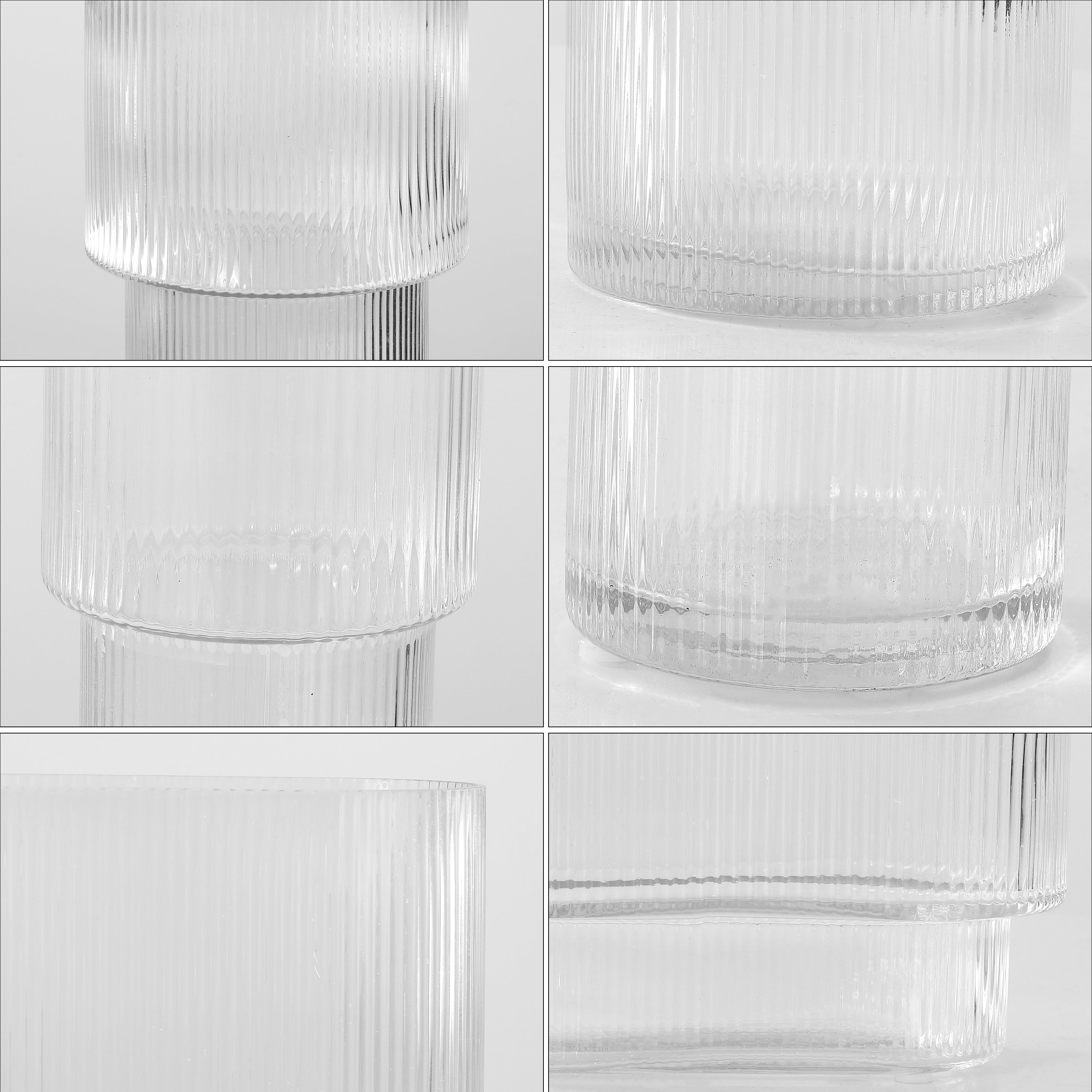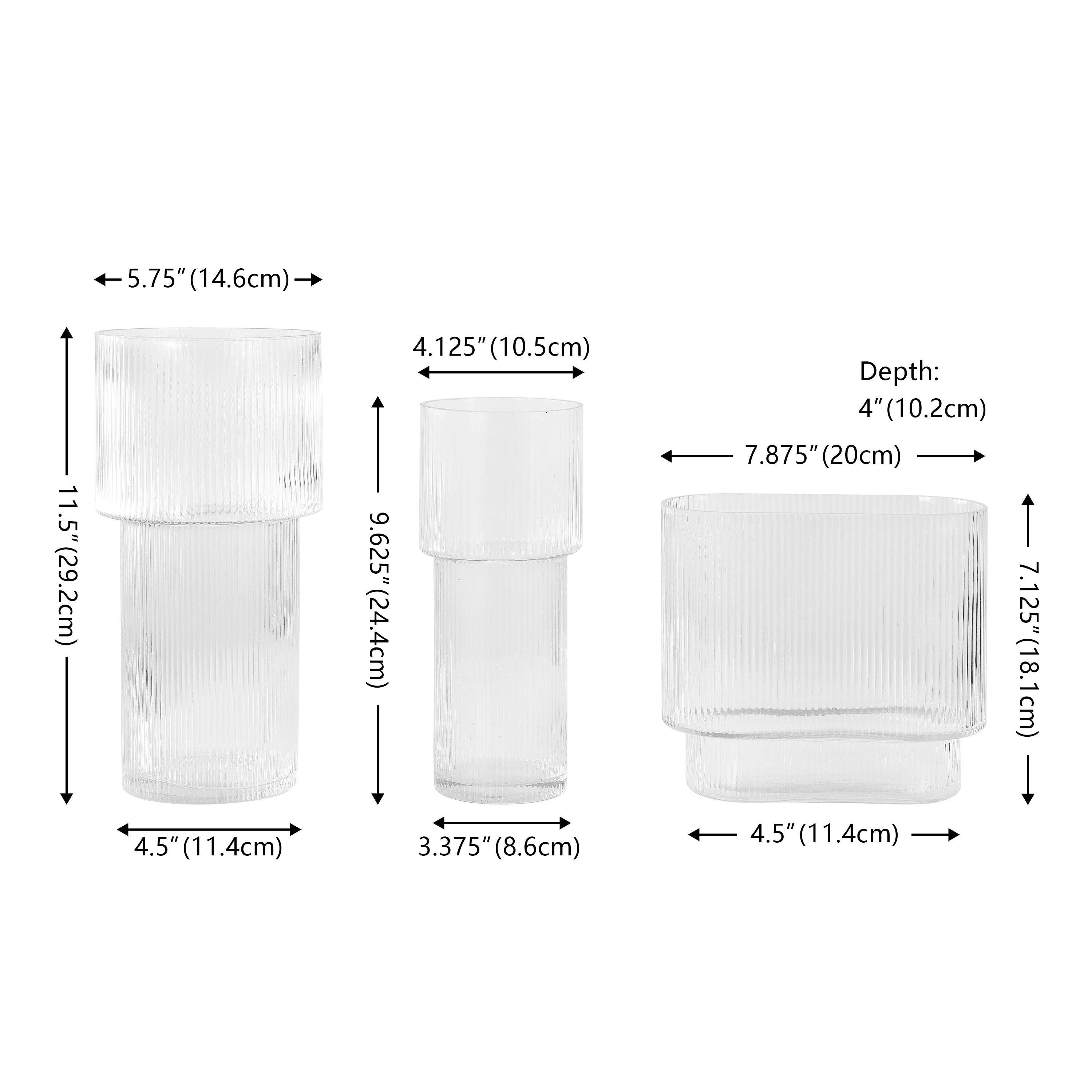 The set features three different shapes and sizes, offering a cohesive yet dynamic arrangement that can be styled together as a centerpiece or used individually throughout your home for a harmonious design theme. Each vase's fluted surface not only adds visual interest but also provides a tactile e X perience that complements the smoothness of the glass.