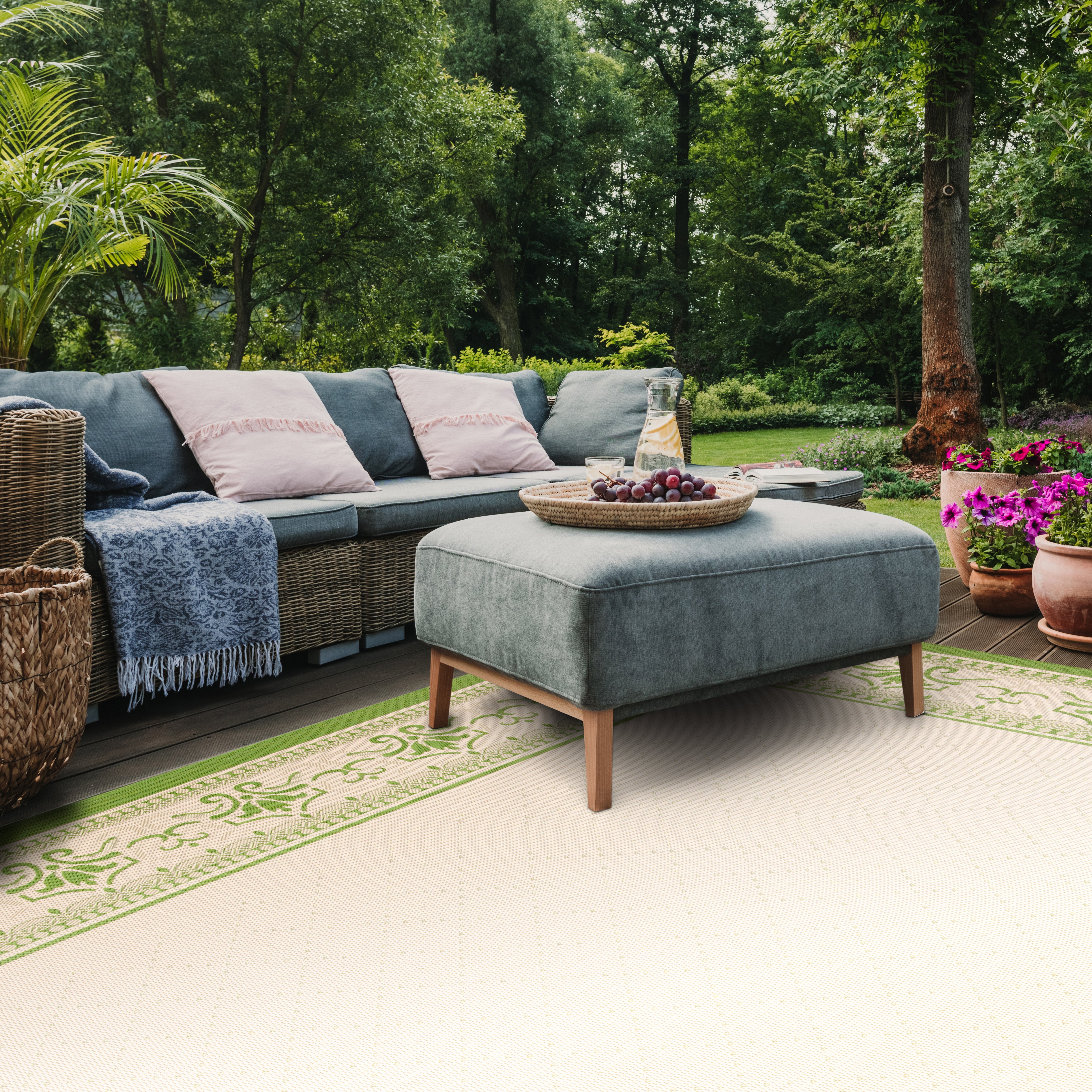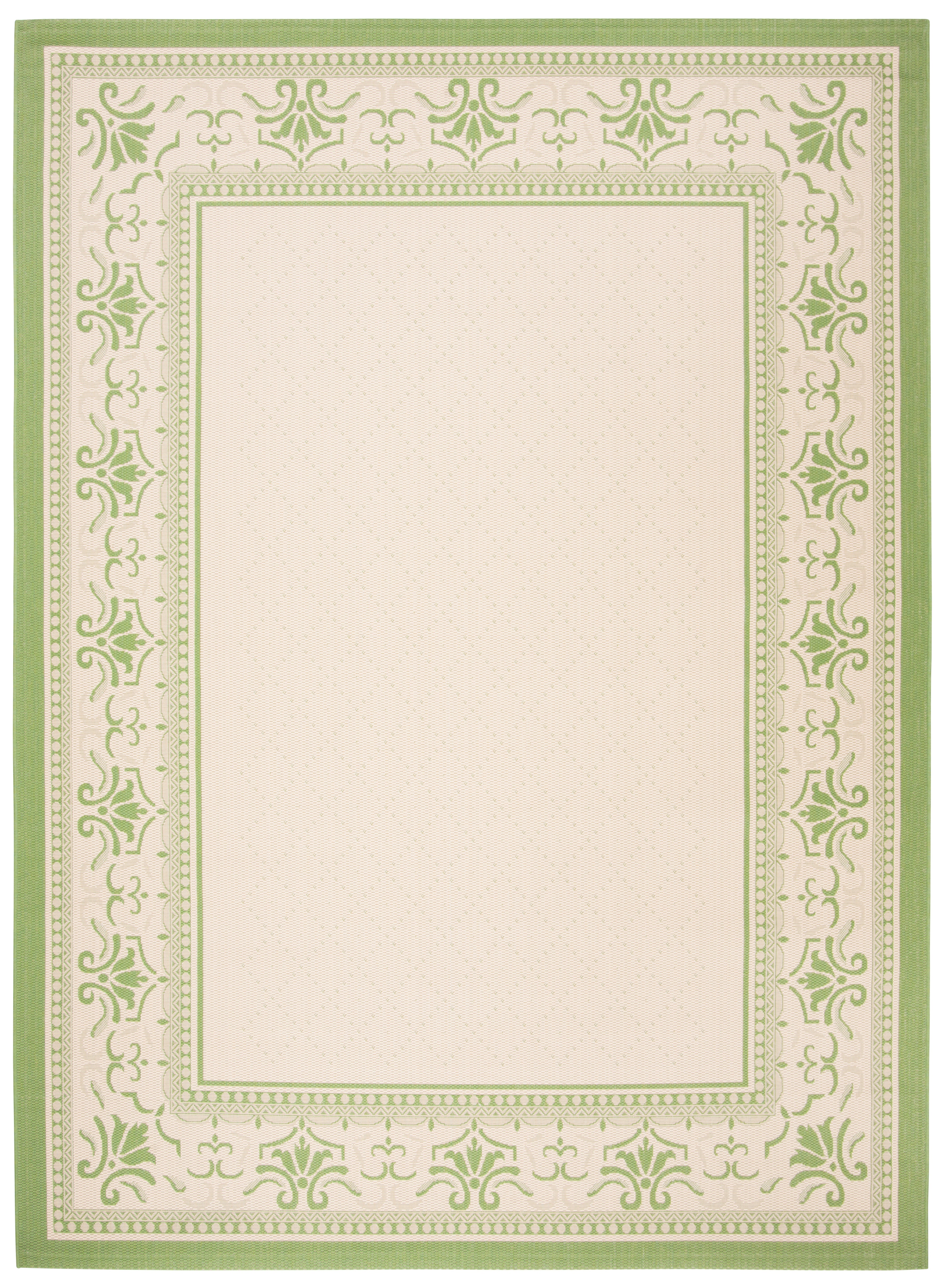 Designed with an elegant floral border in lovely natural and olive tones. A classically styled indoor/outdoor rug made to perfectly suit any area of the home, inside or out. Power-loomed from durable synthetic yarns for a fade-resistant, weather-strong area rug.